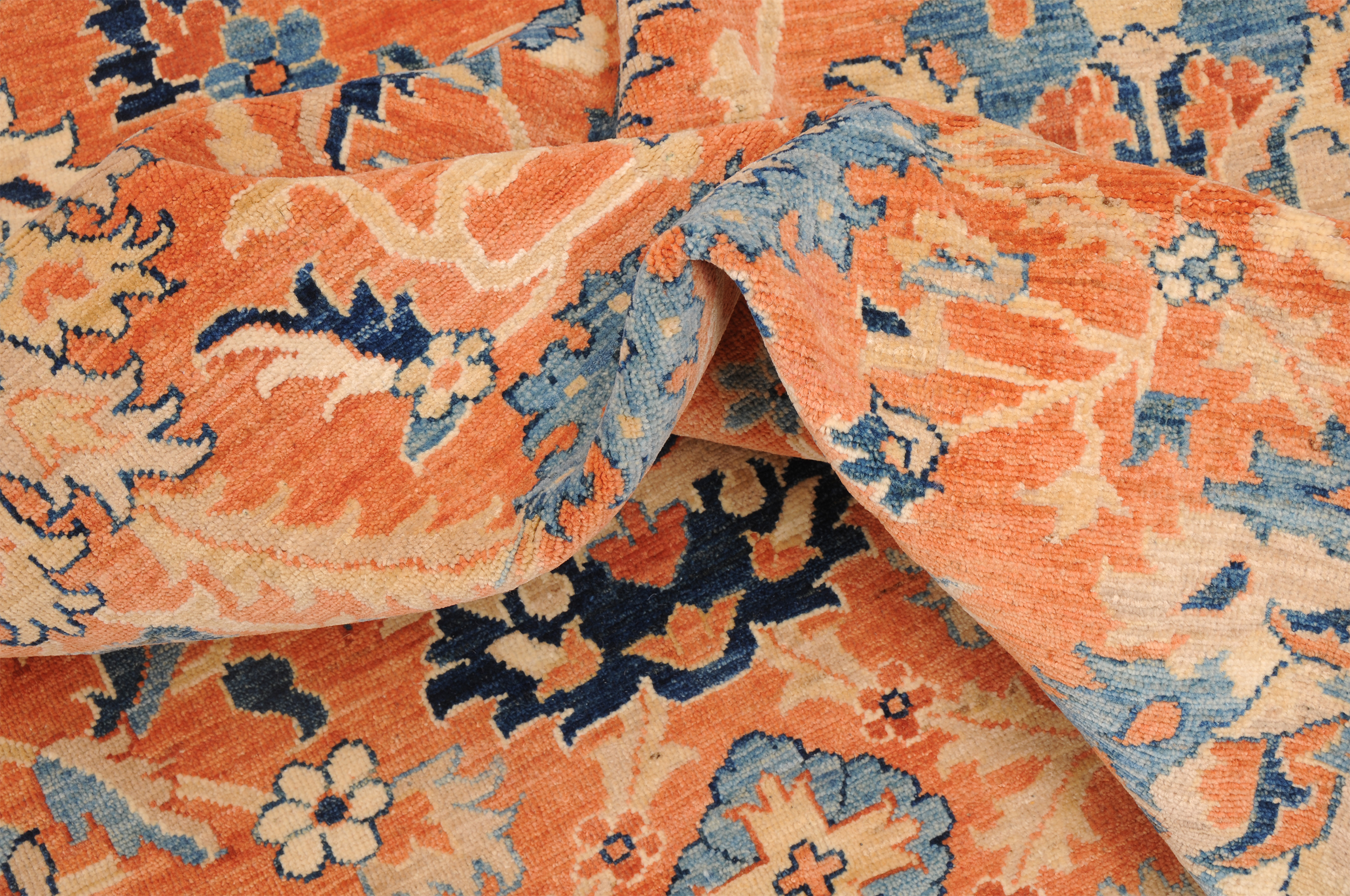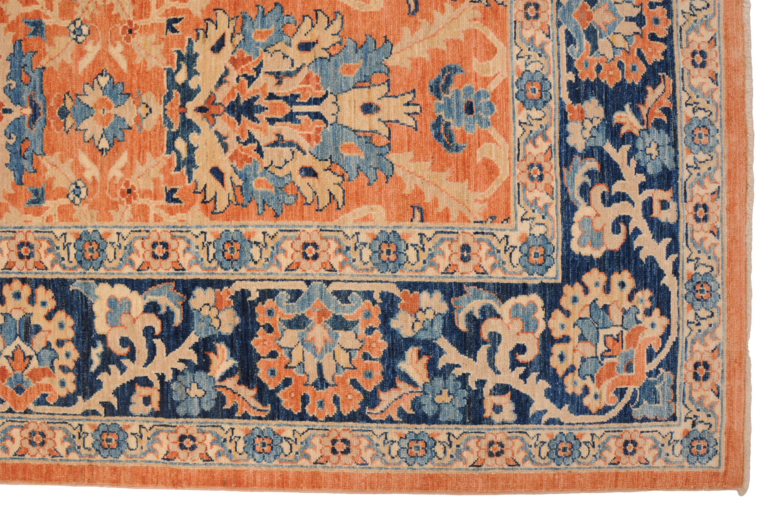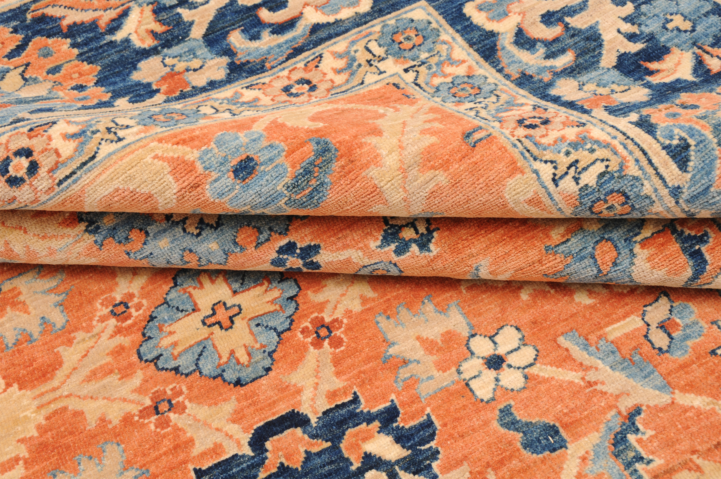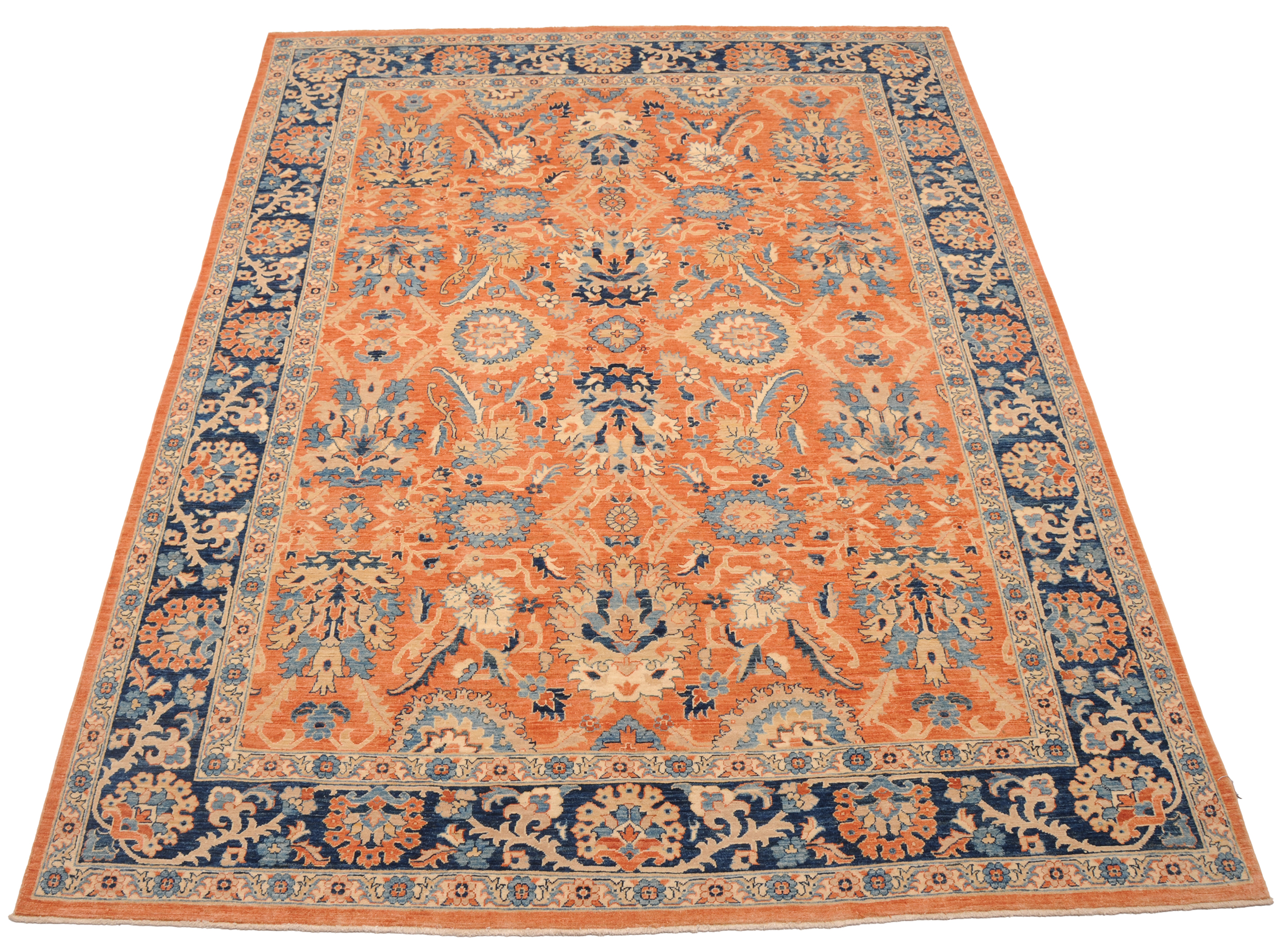 Introducing the Oushak Oriental Rug, a stunning addition to any space. Hand-knotted with care, this rug measures 7’10” x 9’9” and features a captivating orange and blue floral design. With approximately 225 knots per square inch (KPSI), this rug is made from 100% wool and cotton, boasting a low to medium pile height of 1/4″-1/3″. Excellent in quality and thoroughly washed, this rug is sure to bring warmth and beauty to your home.