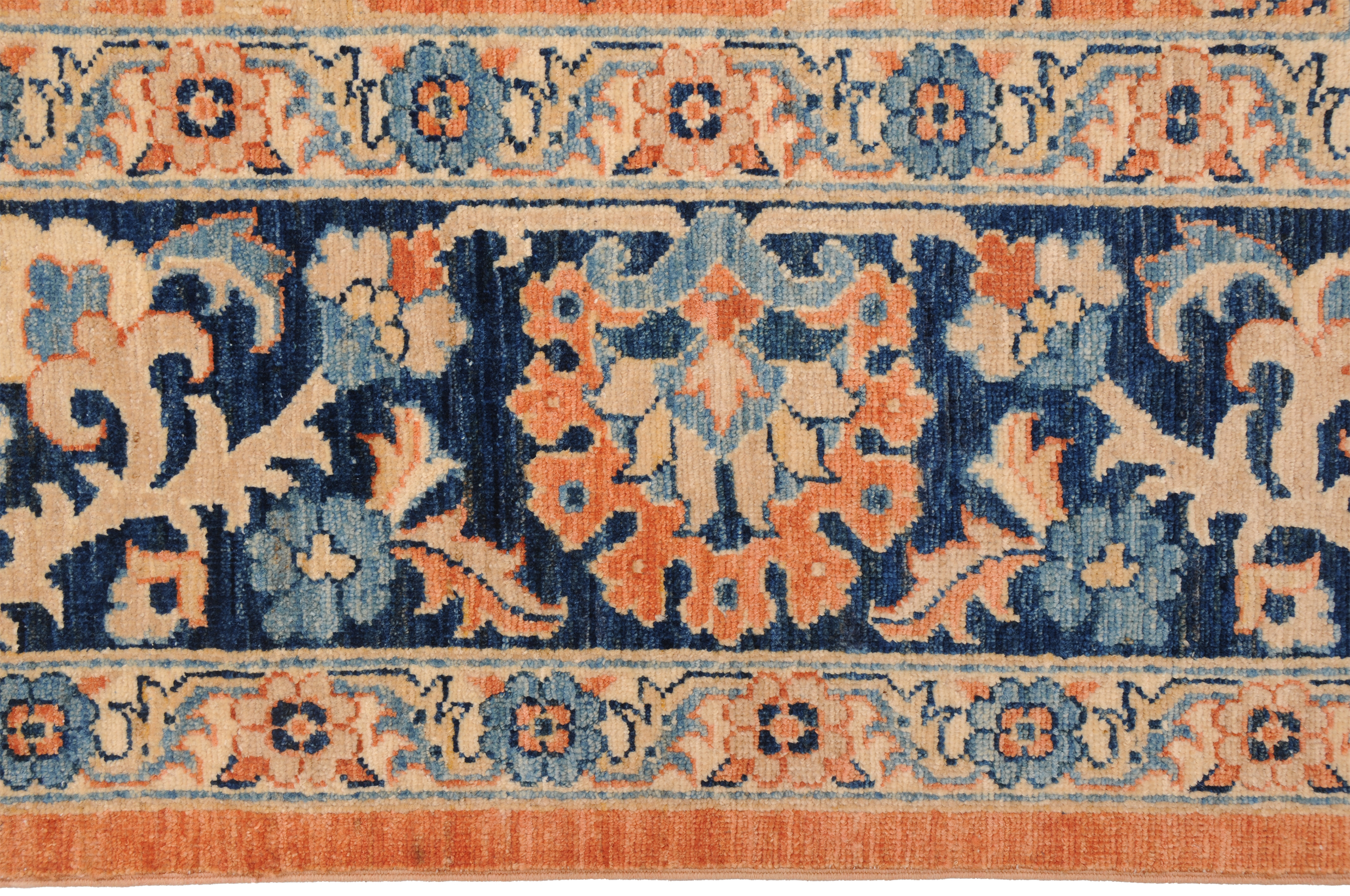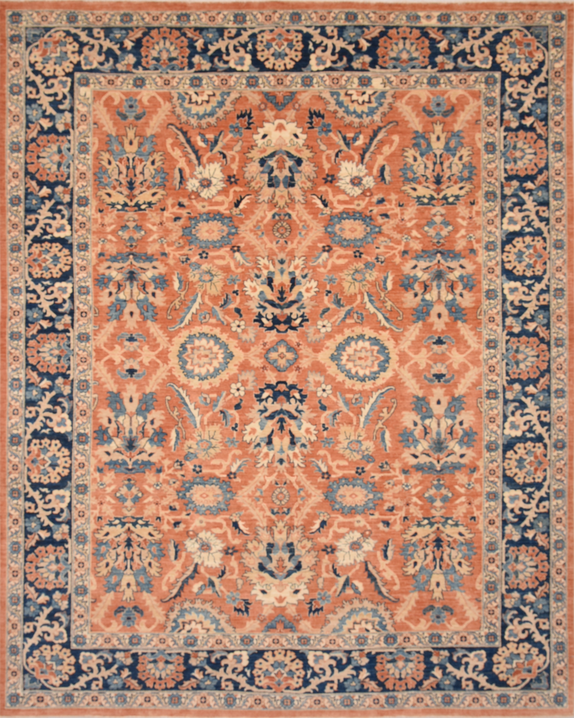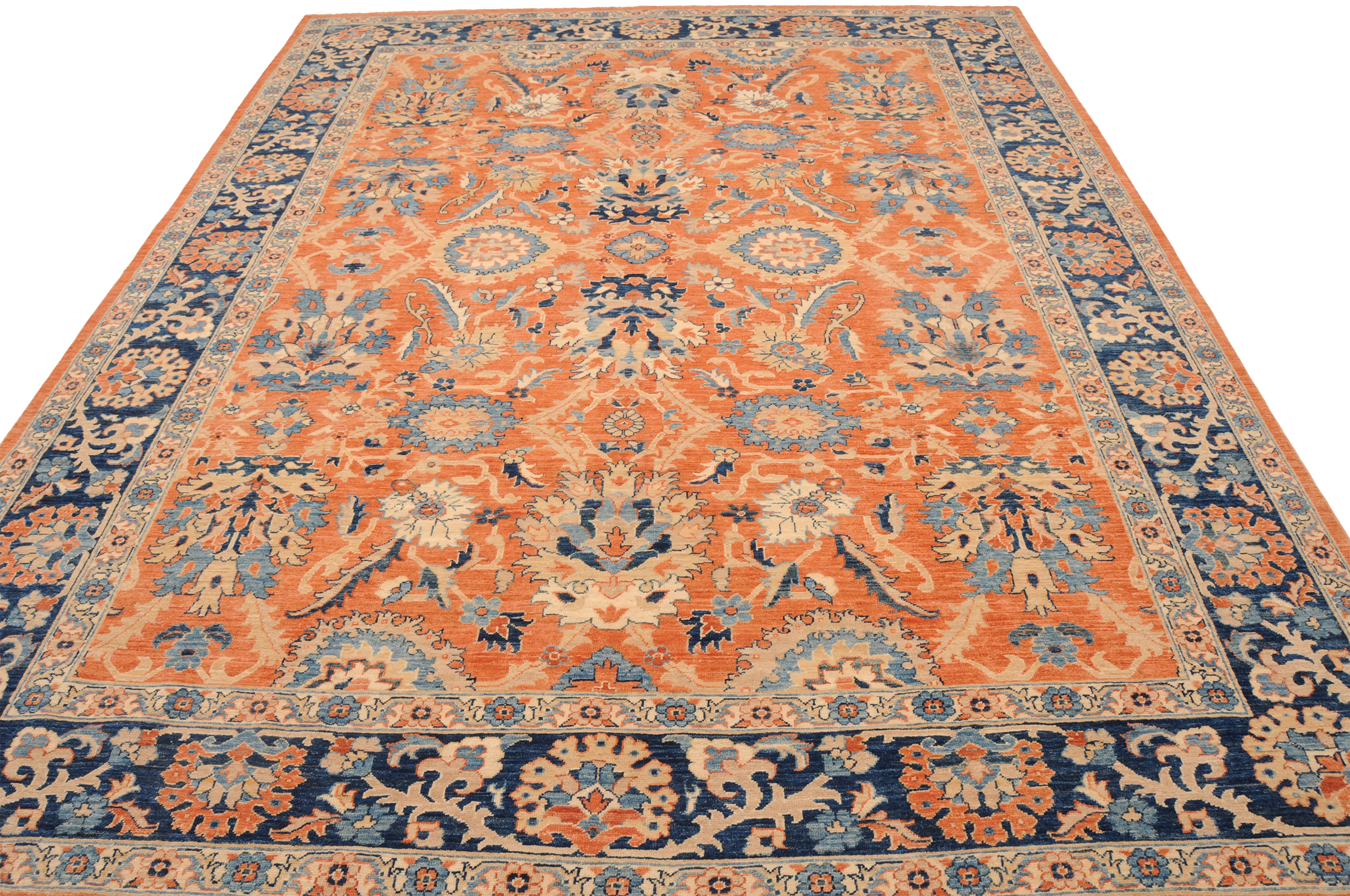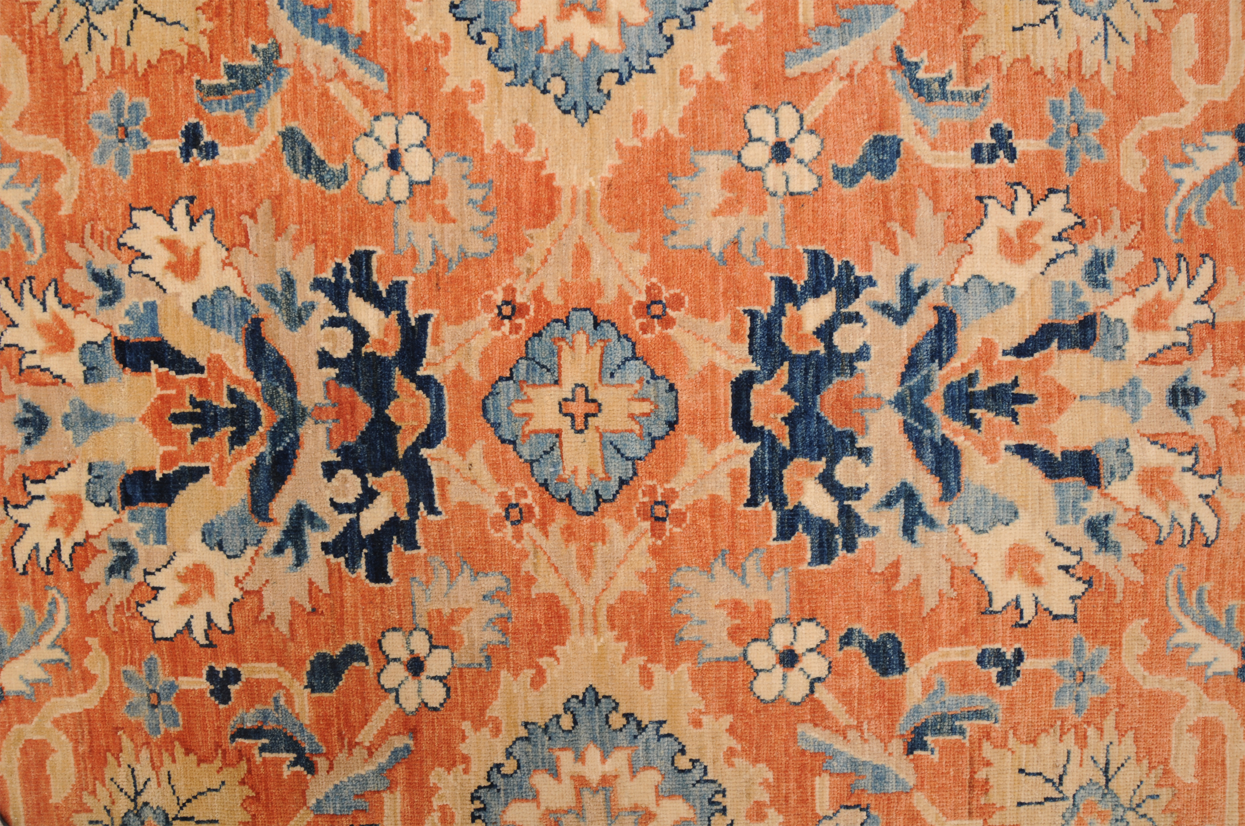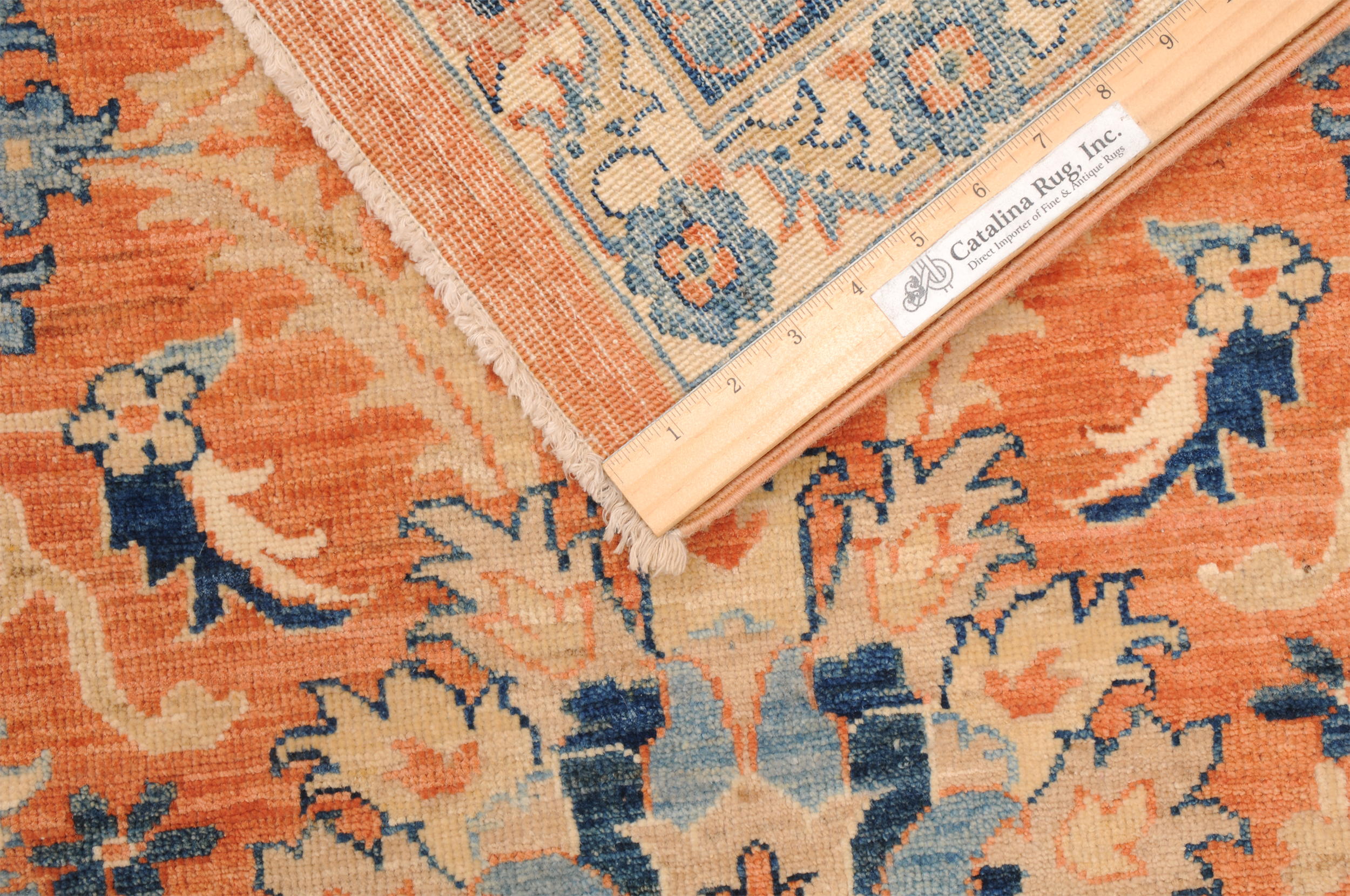 Introducing the Oushak Oriental Rug, a stunning addition to any space. Hand-knotted with care, this rug measures 7’10” x 9’9” and features a captivating orange and blue floral design. With approximately 225 knots per square inch (KPSI), this rug is made from 100% wool and cotton, boasting a low to medium pile height of 1/4″-1/3″. Excellent in quality and thoroughly washed, this rug is sure to bring warmth and beauty to your home.