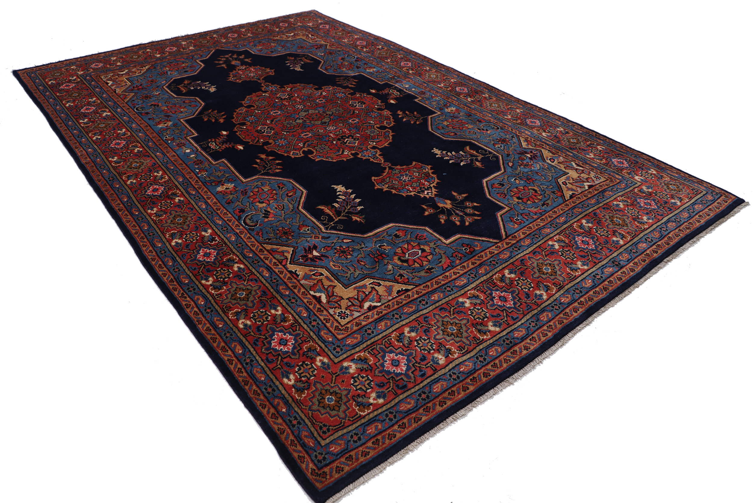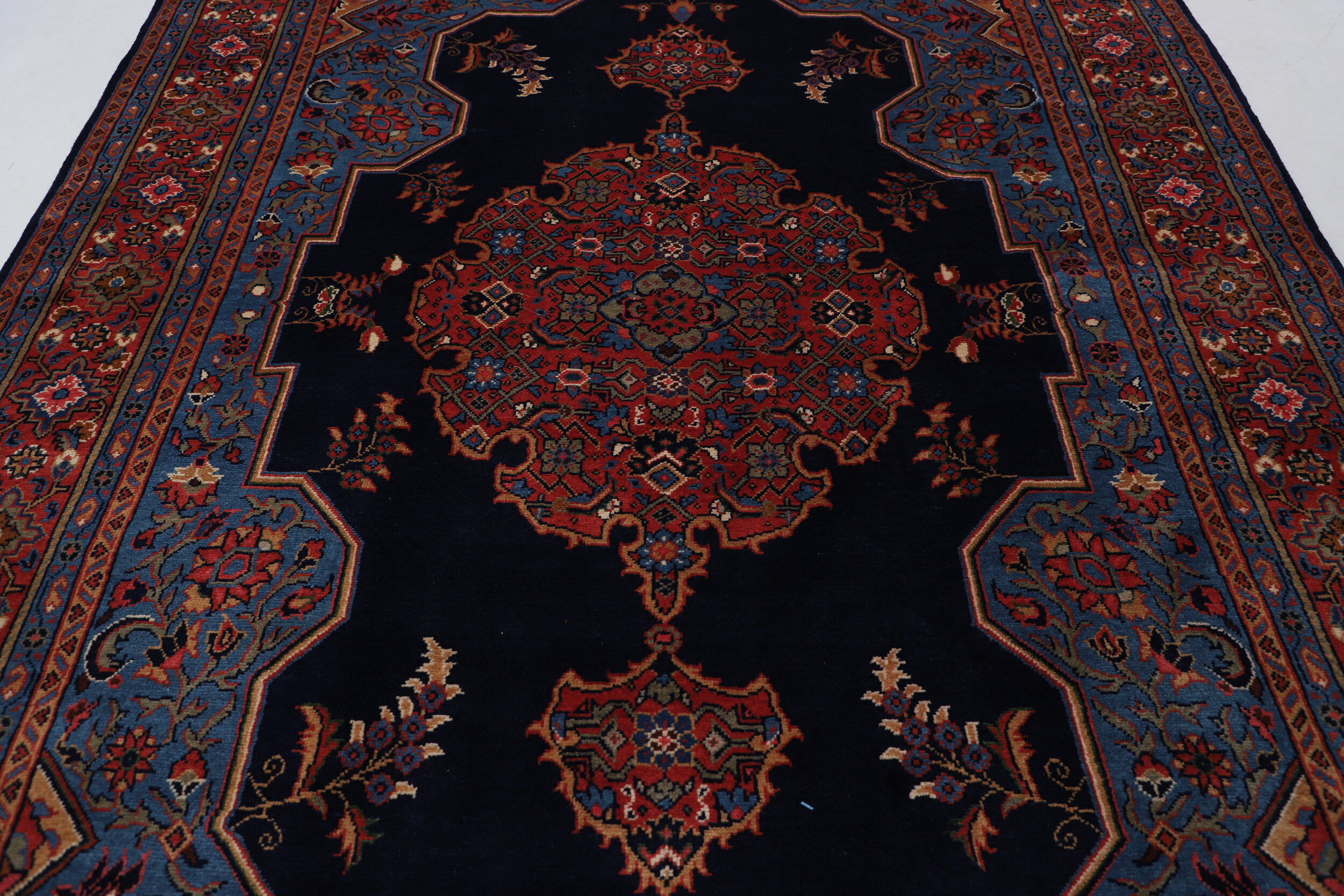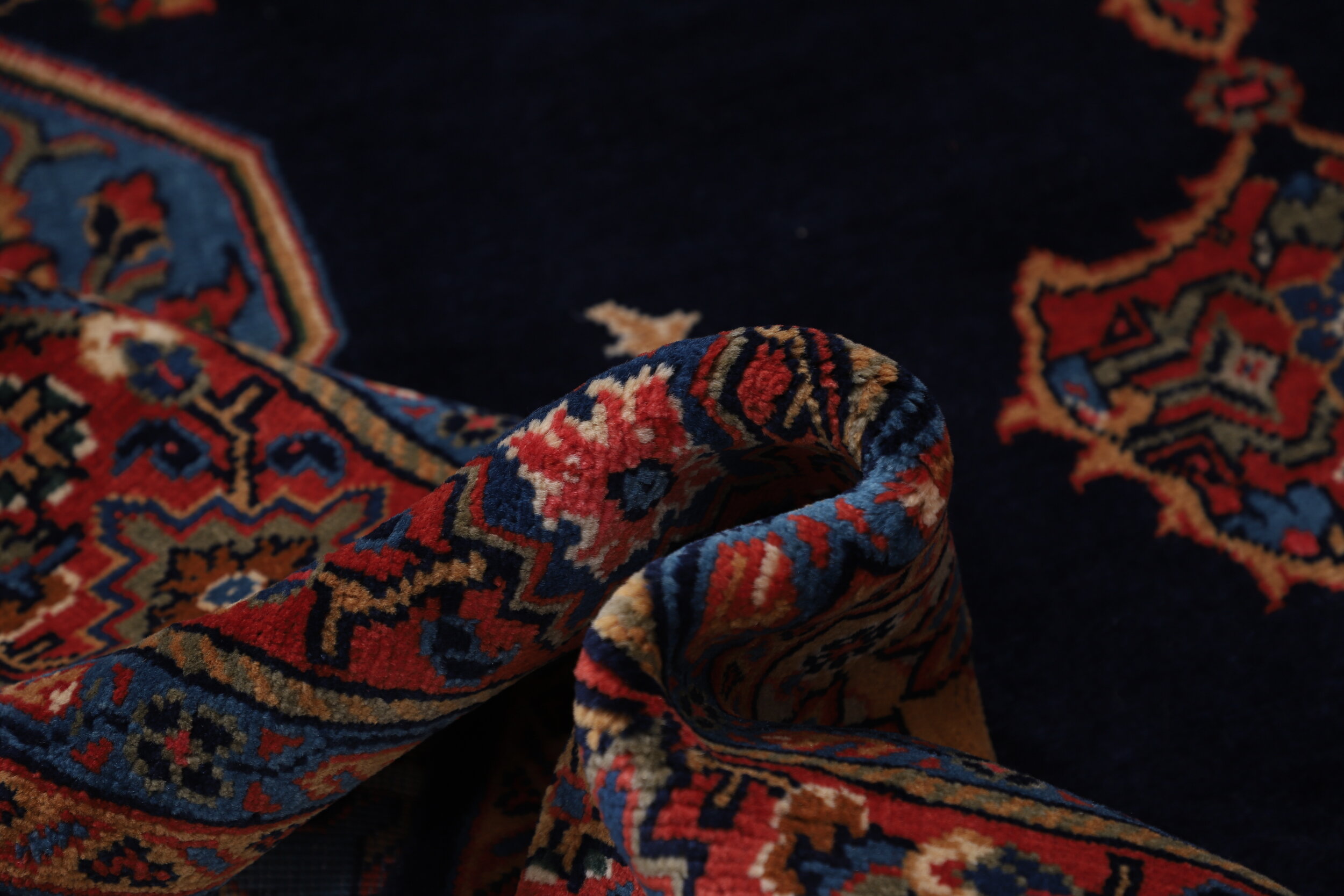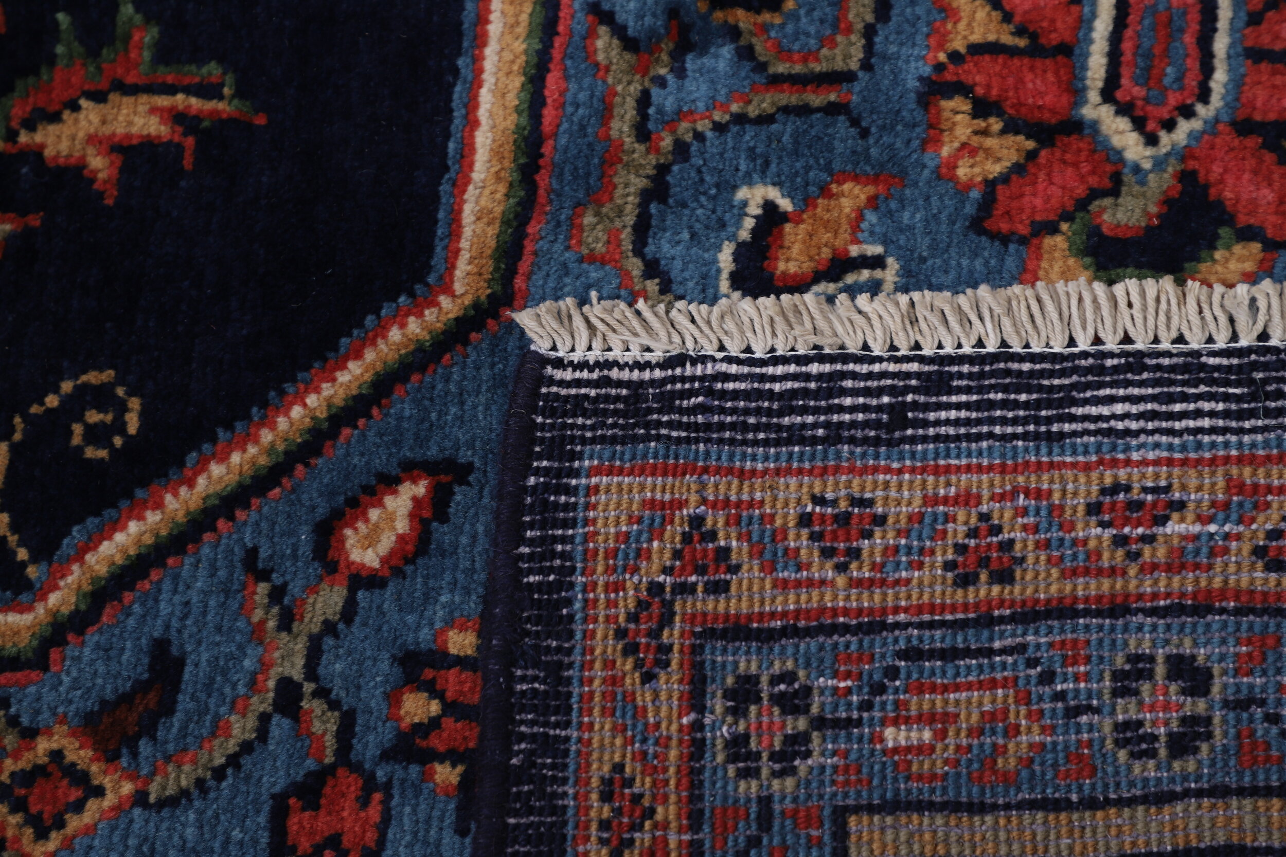 This Mahal rug has a Blue border with a Red Field featuring a Medallion design. Made with 100% Wool with Cotton foundation. It has a knot density of 120 kpsi.