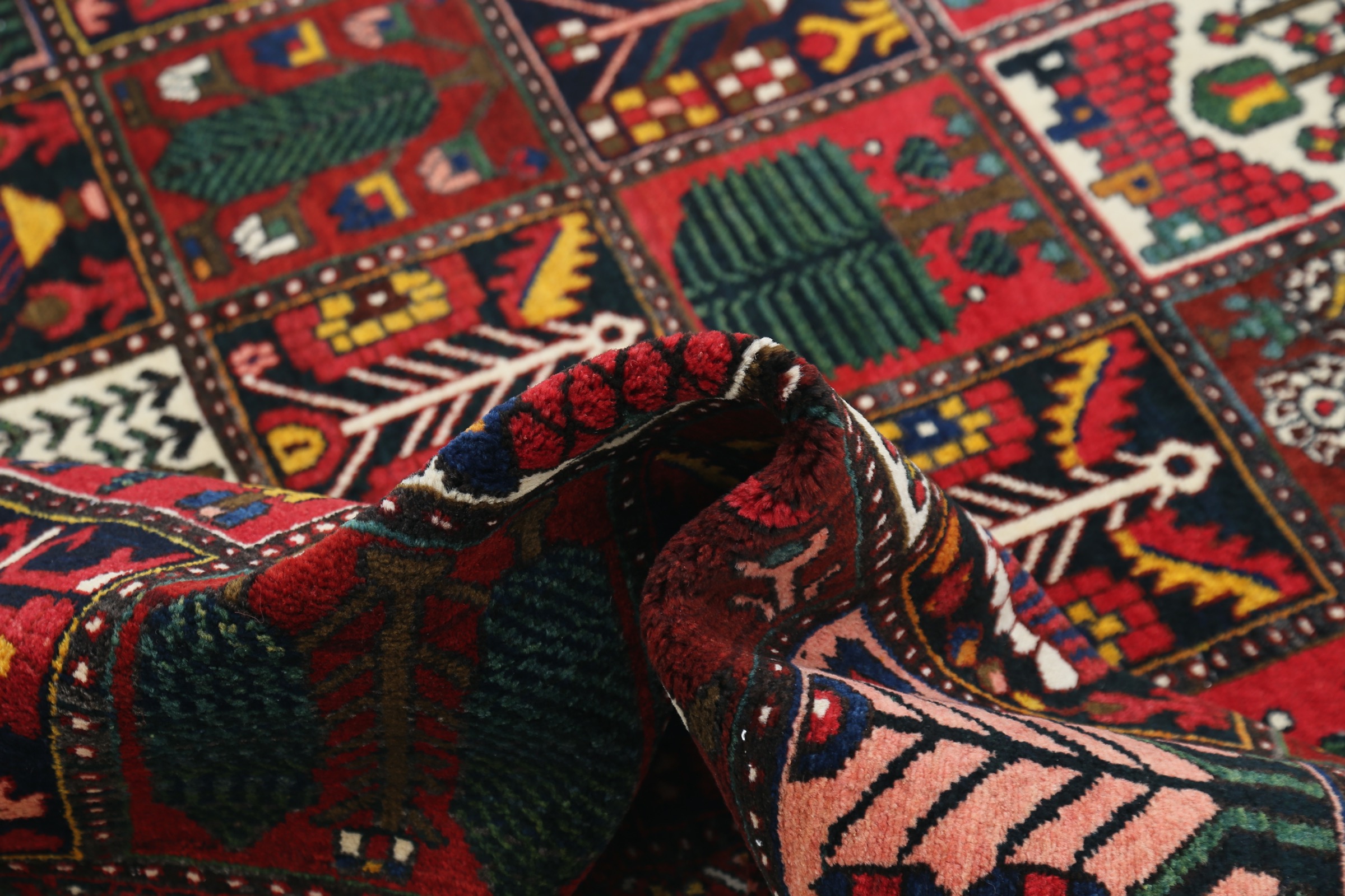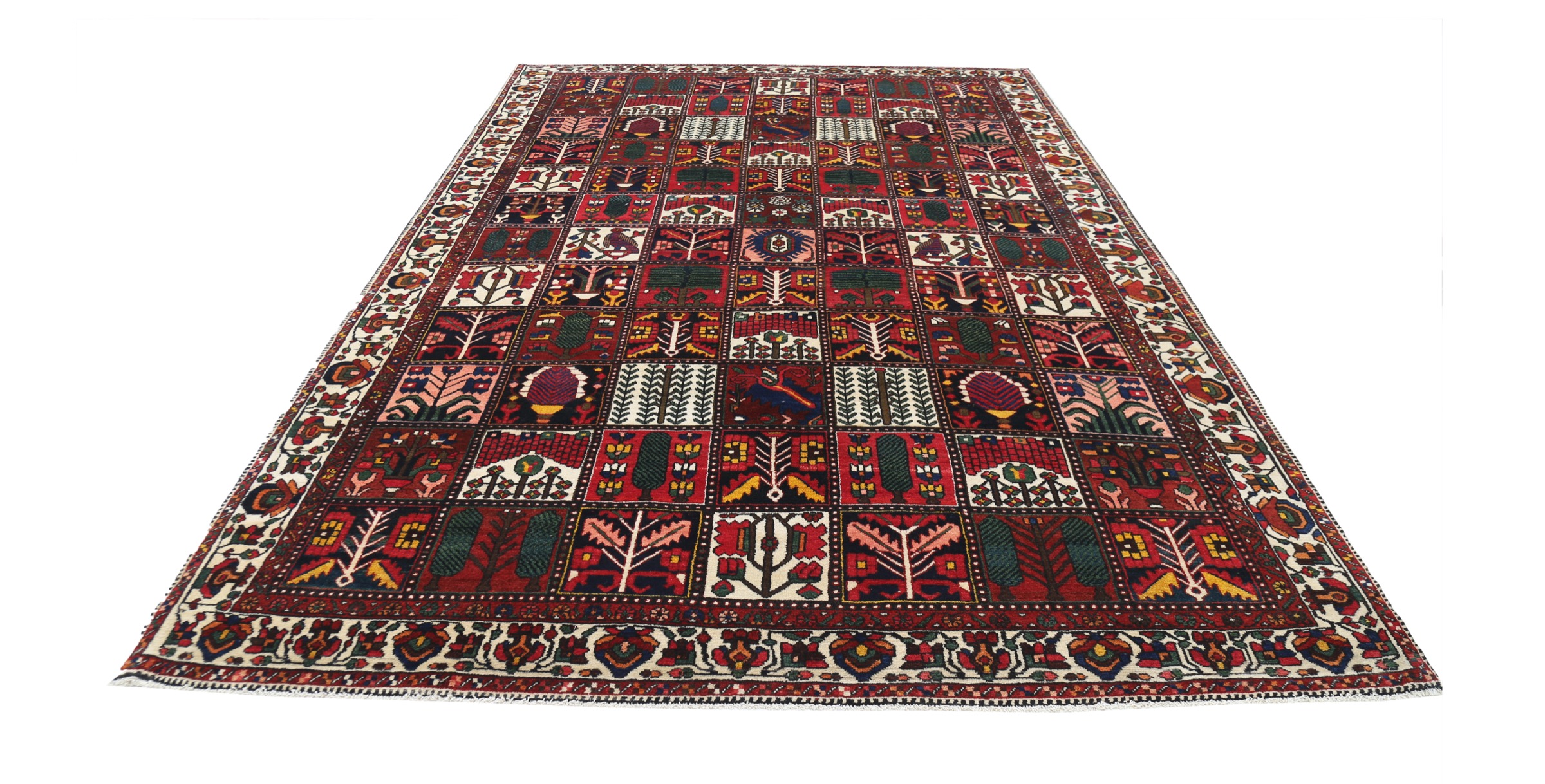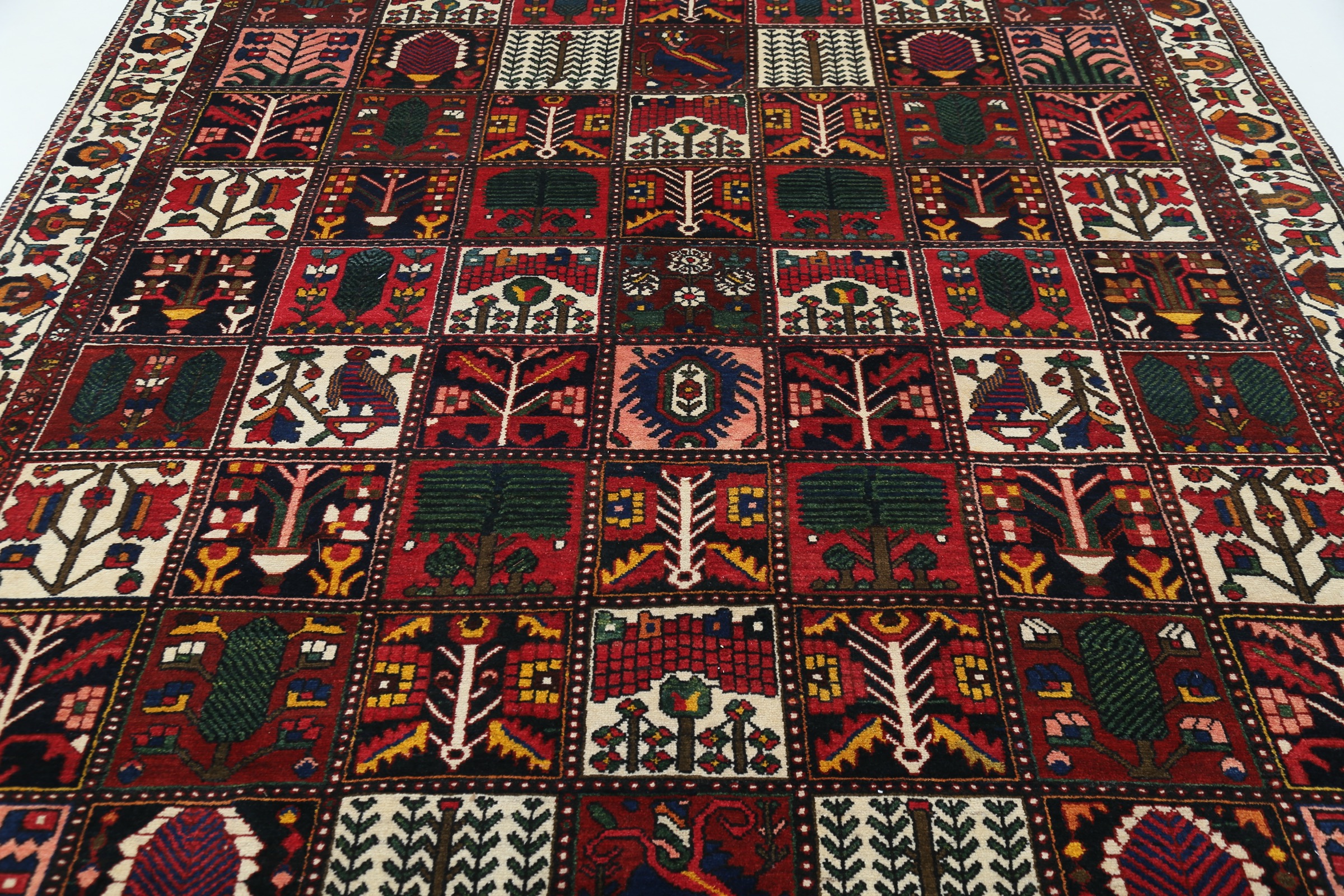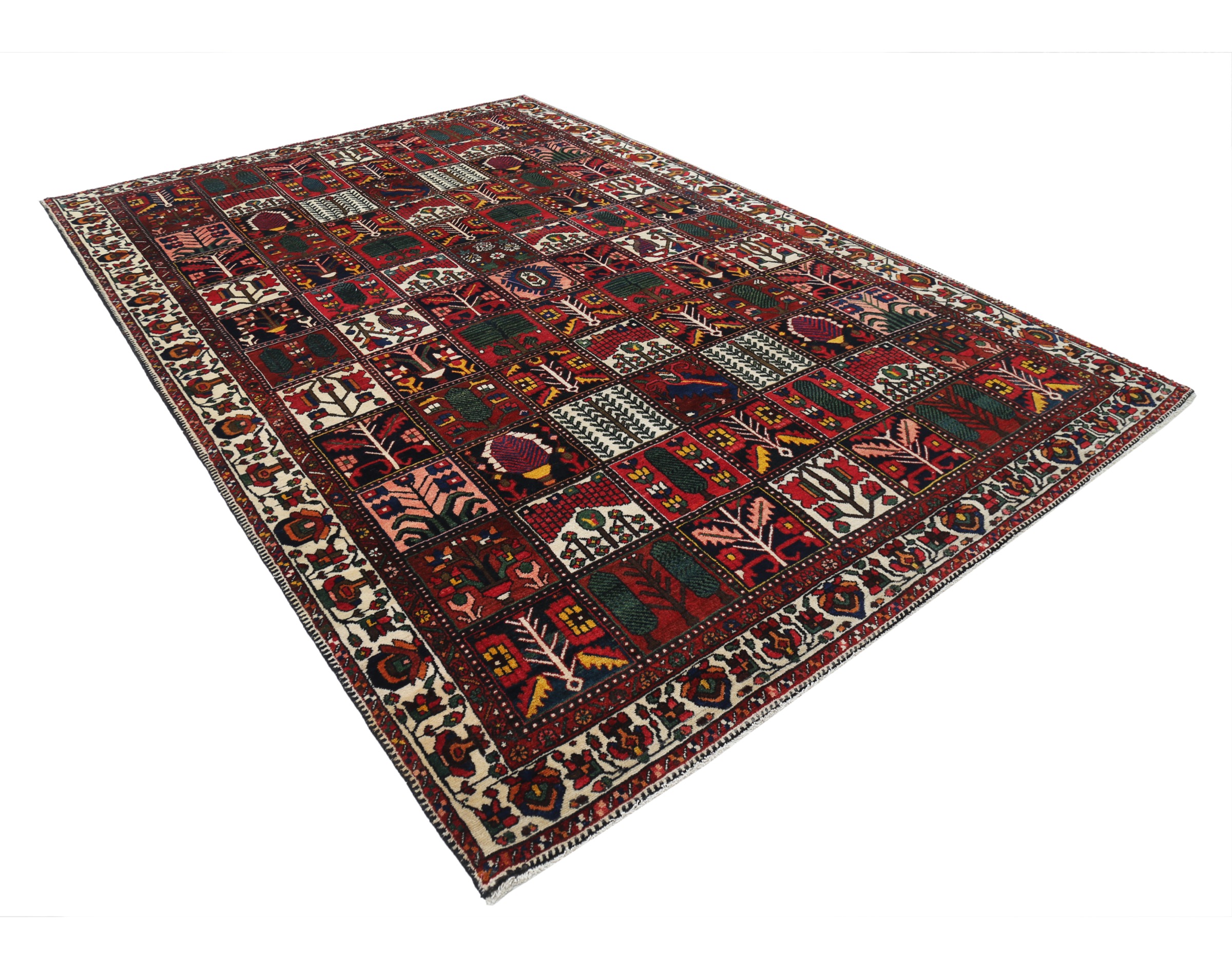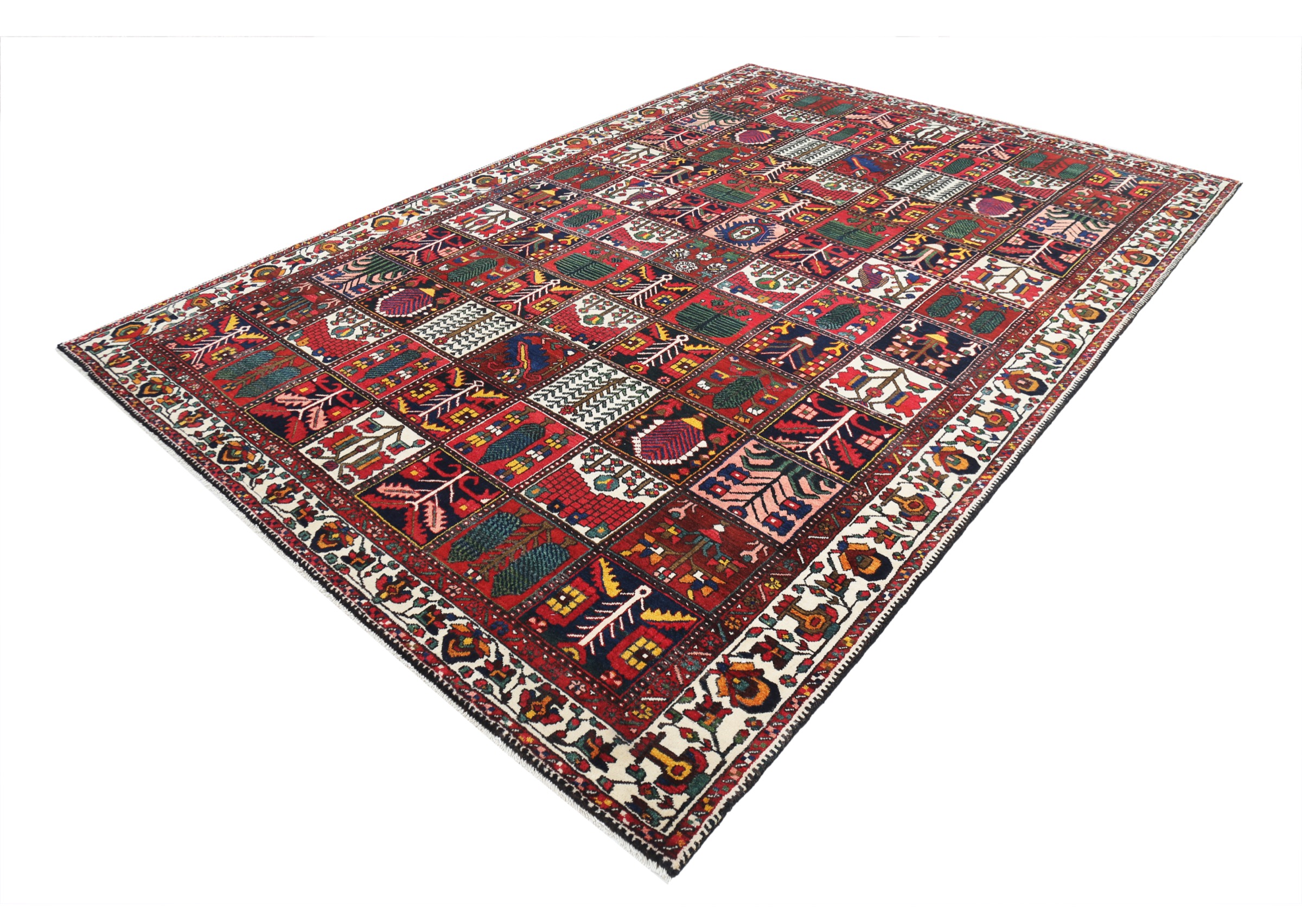 This Bakhtyari rug has a Rust field with a Beige border, featuring a Garden Design design. Made with 100% Wool with Cotton foundation. It has knot density of 196 kpsi.