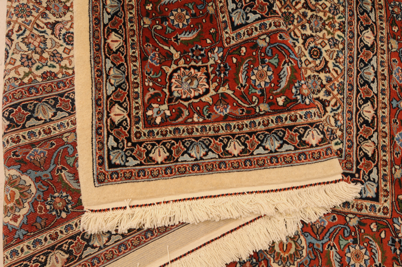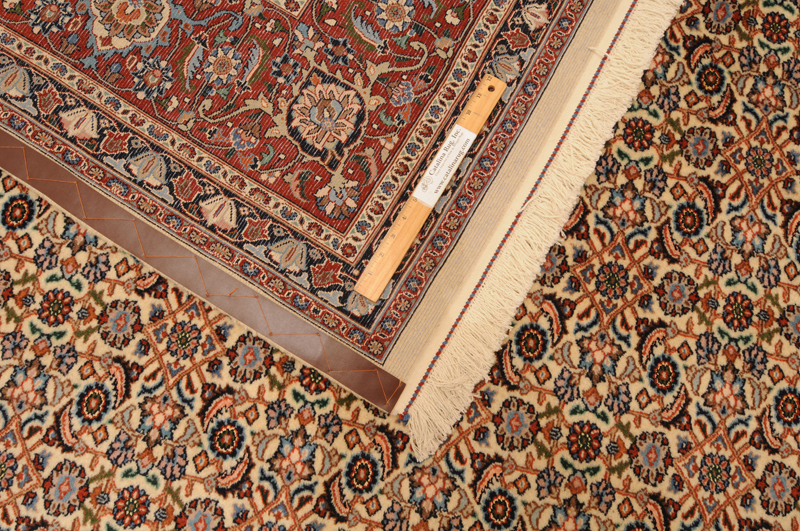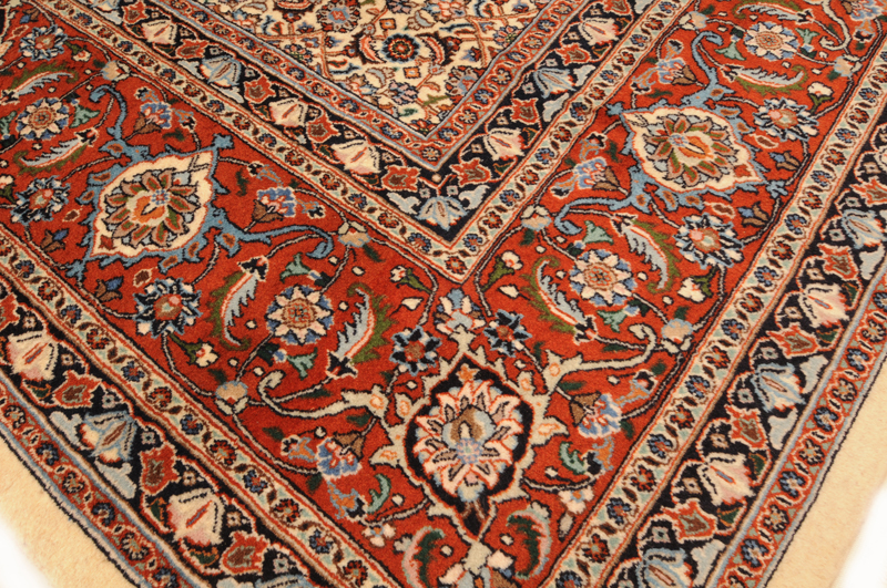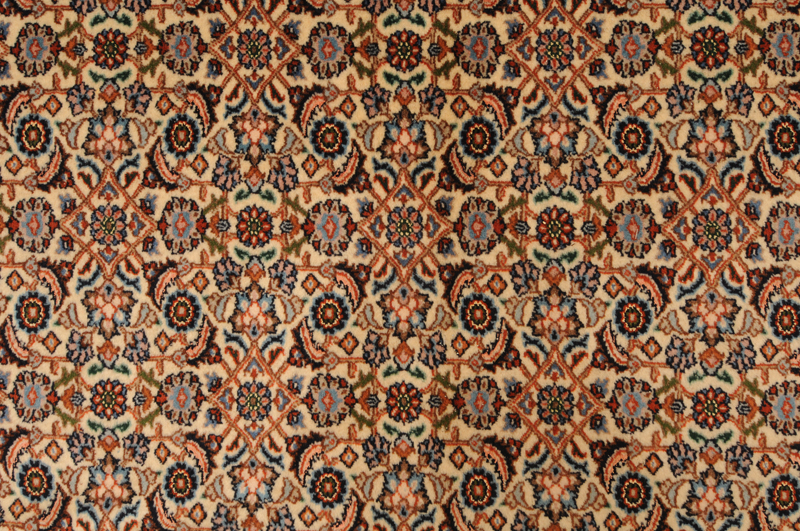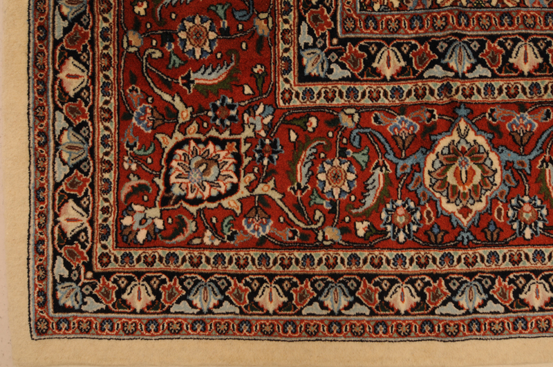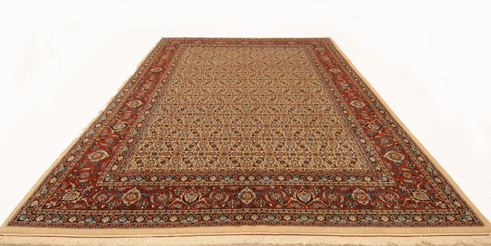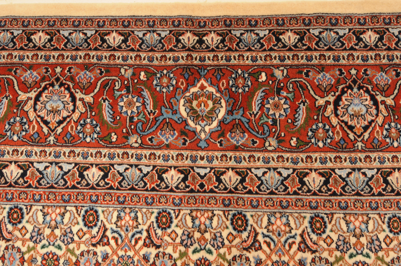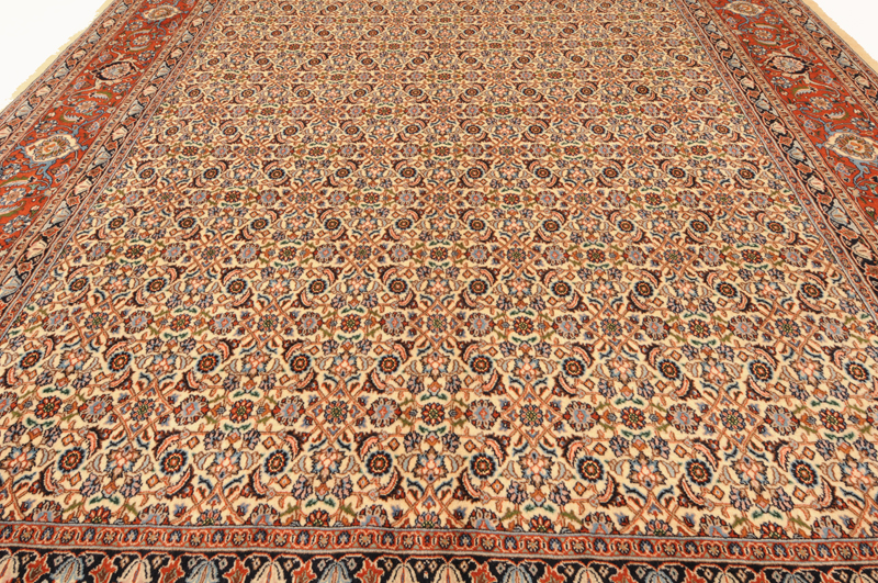 This Persian Rug is Hand Knotted with Wool & Silk Pile and Cotton Foundation. This Rug has a Herati Design and its Main colors are Blue, Orange, Beige