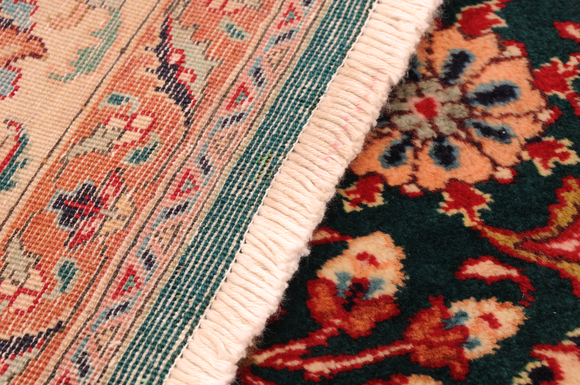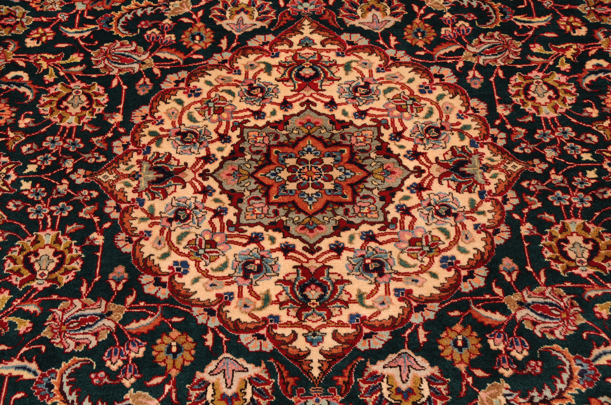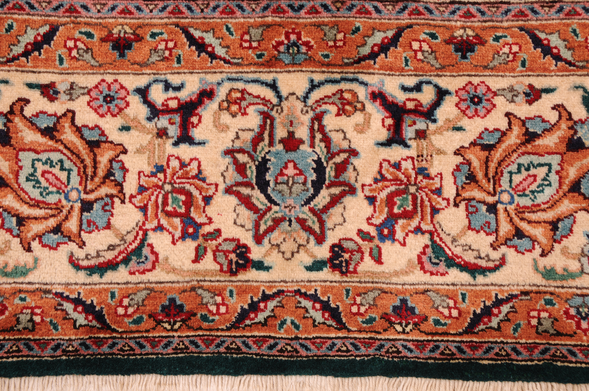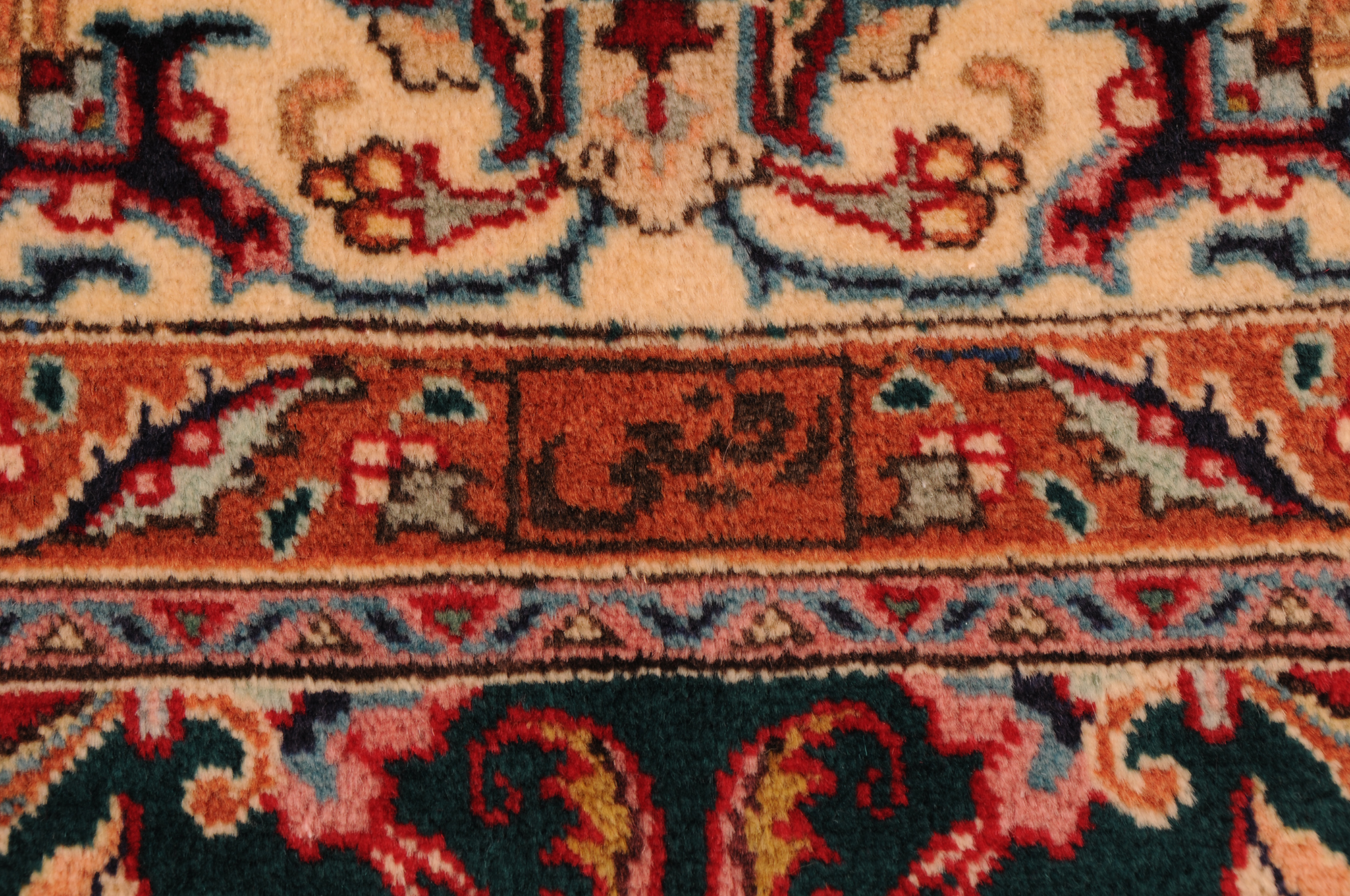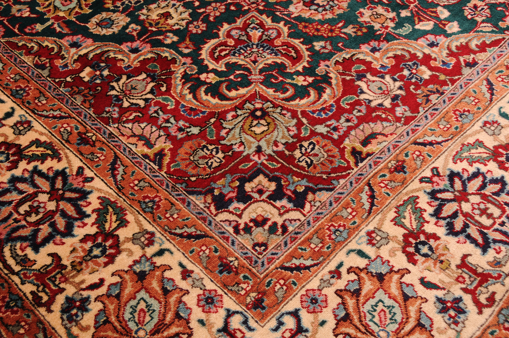 This Tabriz rug has a Green field with a Beige border, featuring a Medallion design. Made with 100% Wool with Cotton foundation. It has knot density of 196 kpsi.