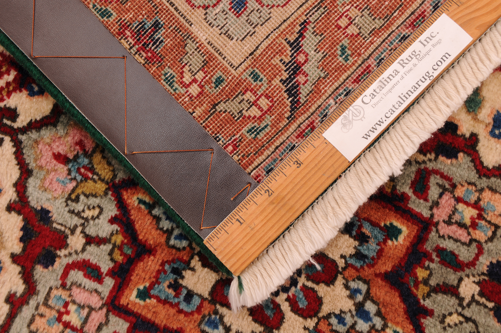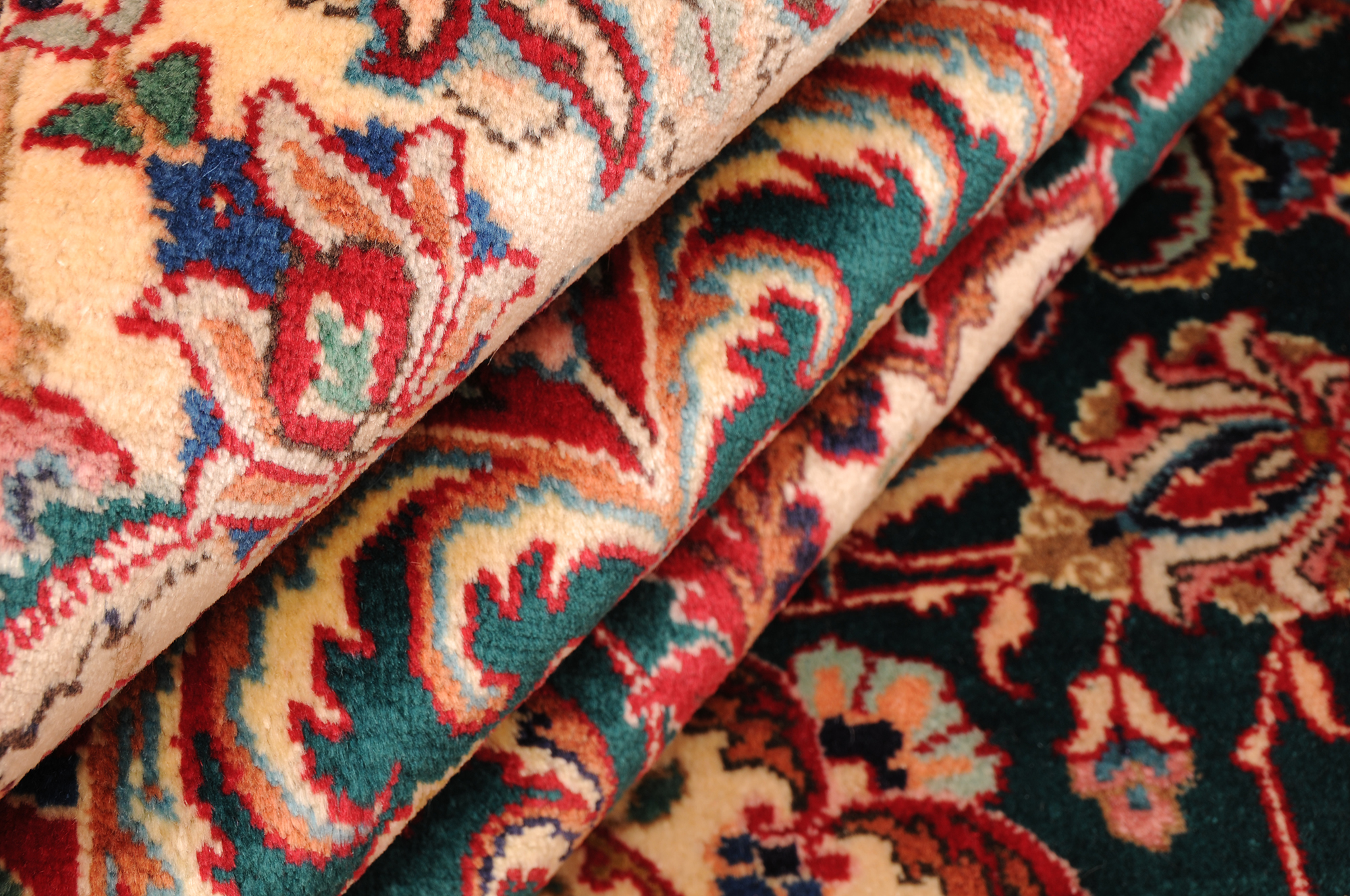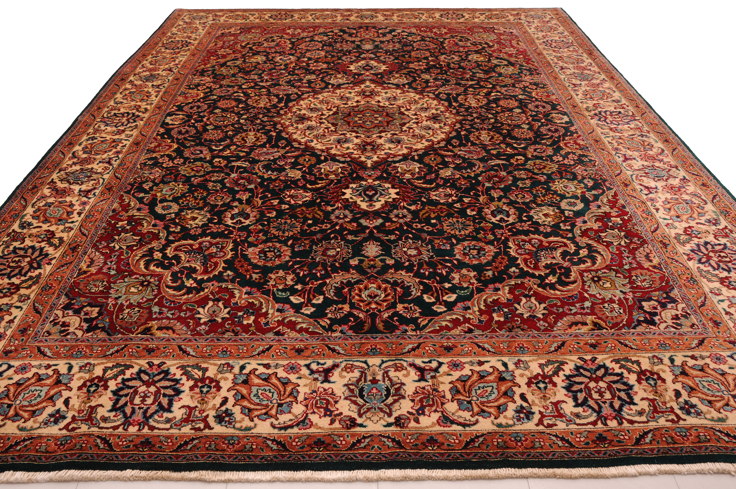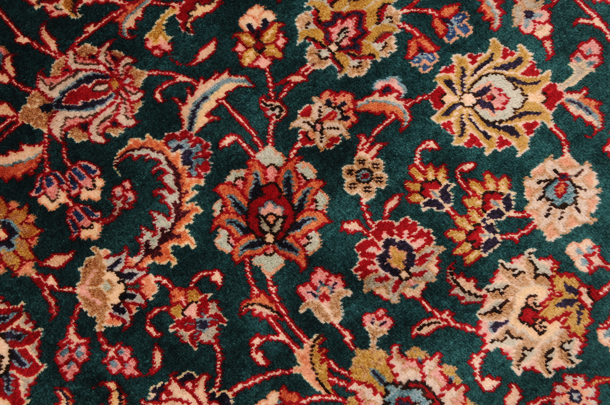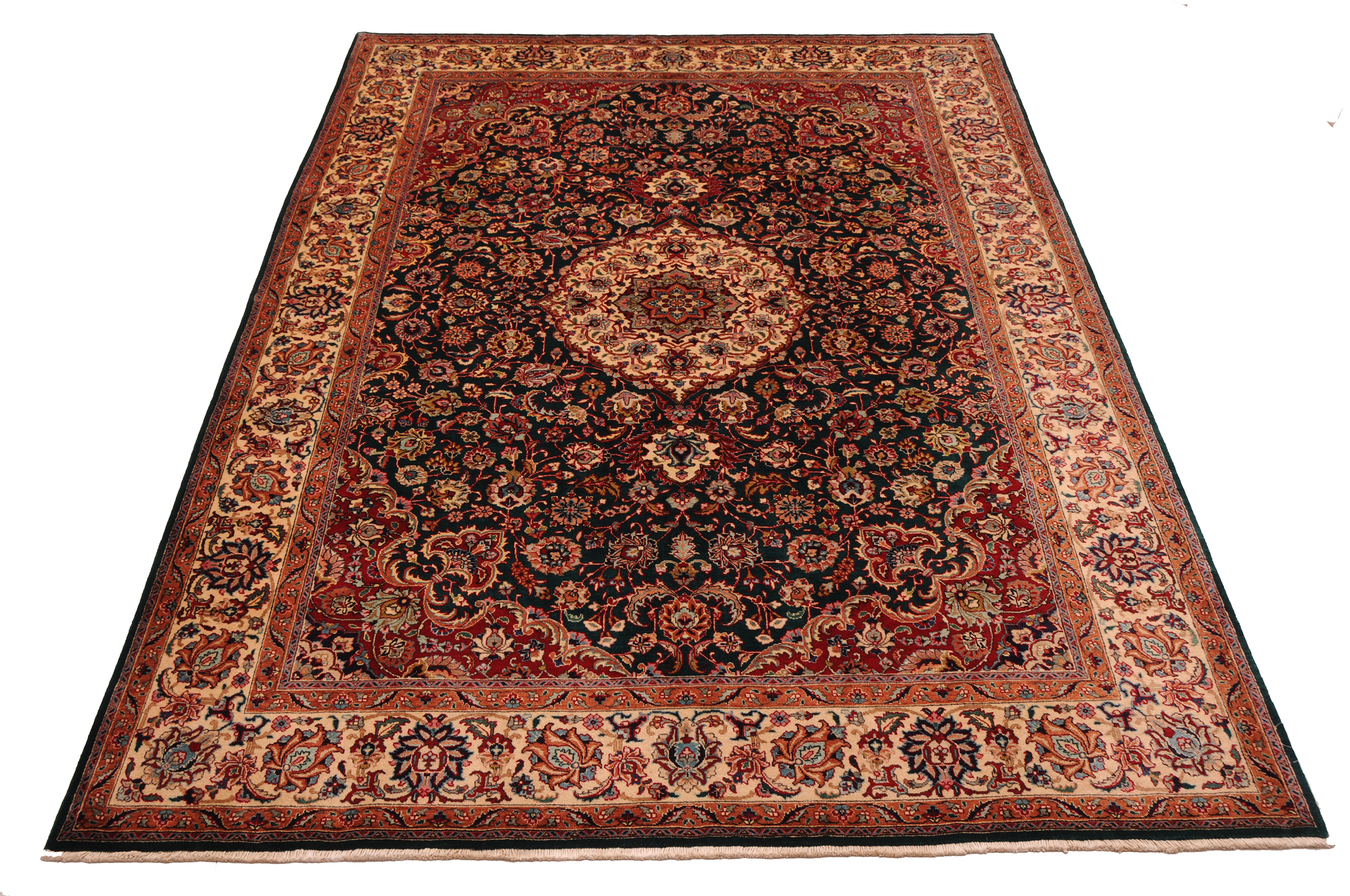 This Tabriz rug has a Green field with a Beige border, featuring a Medallion design. Made with 100% Wool with Cotton foundation. It has knot density of 196 kpsi.