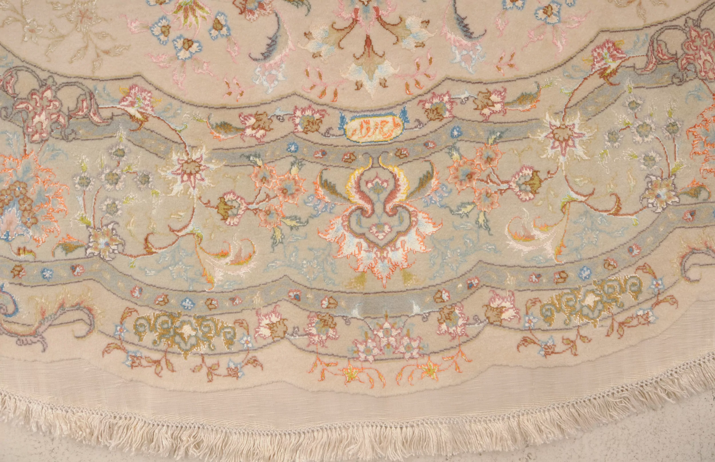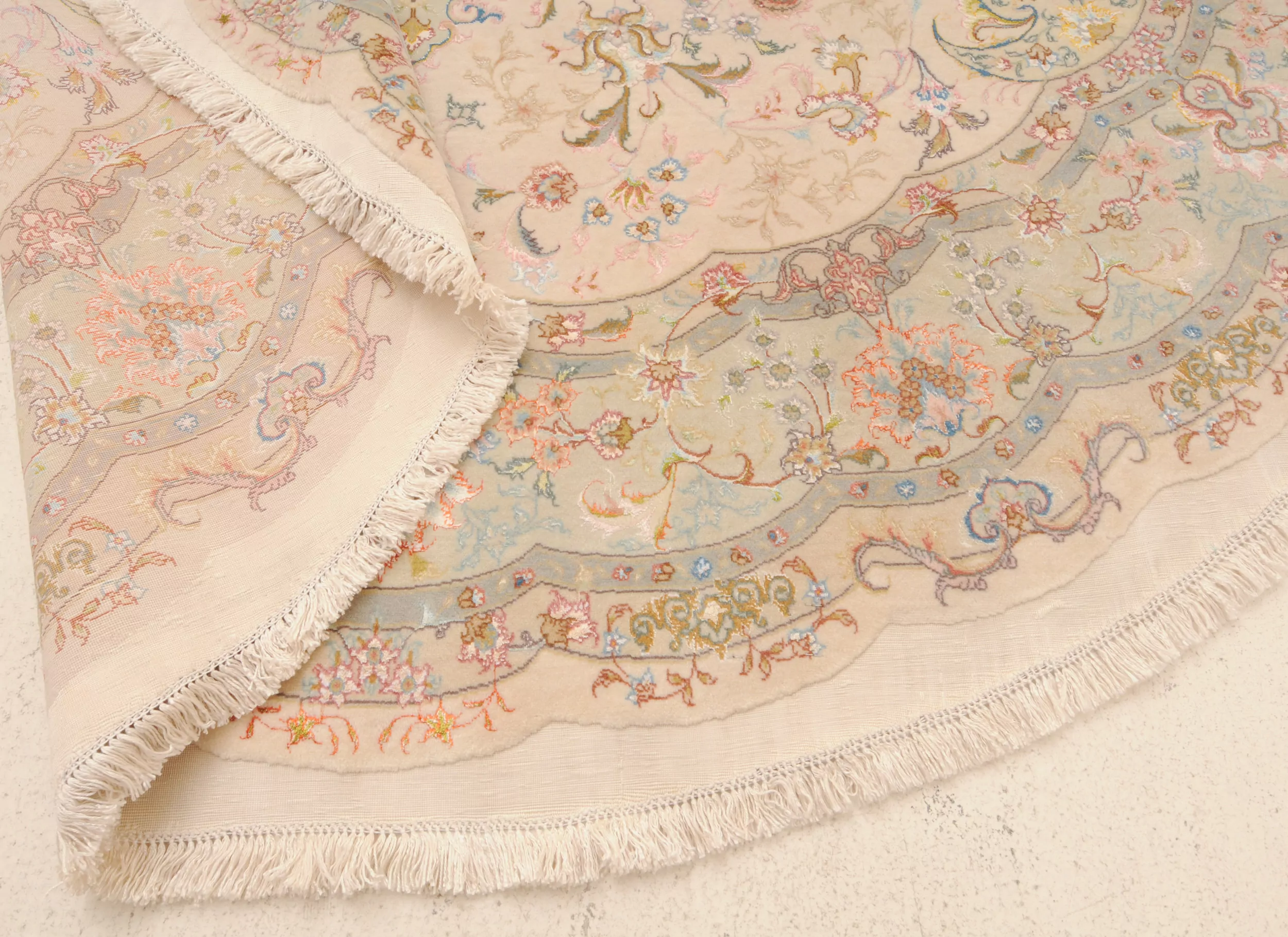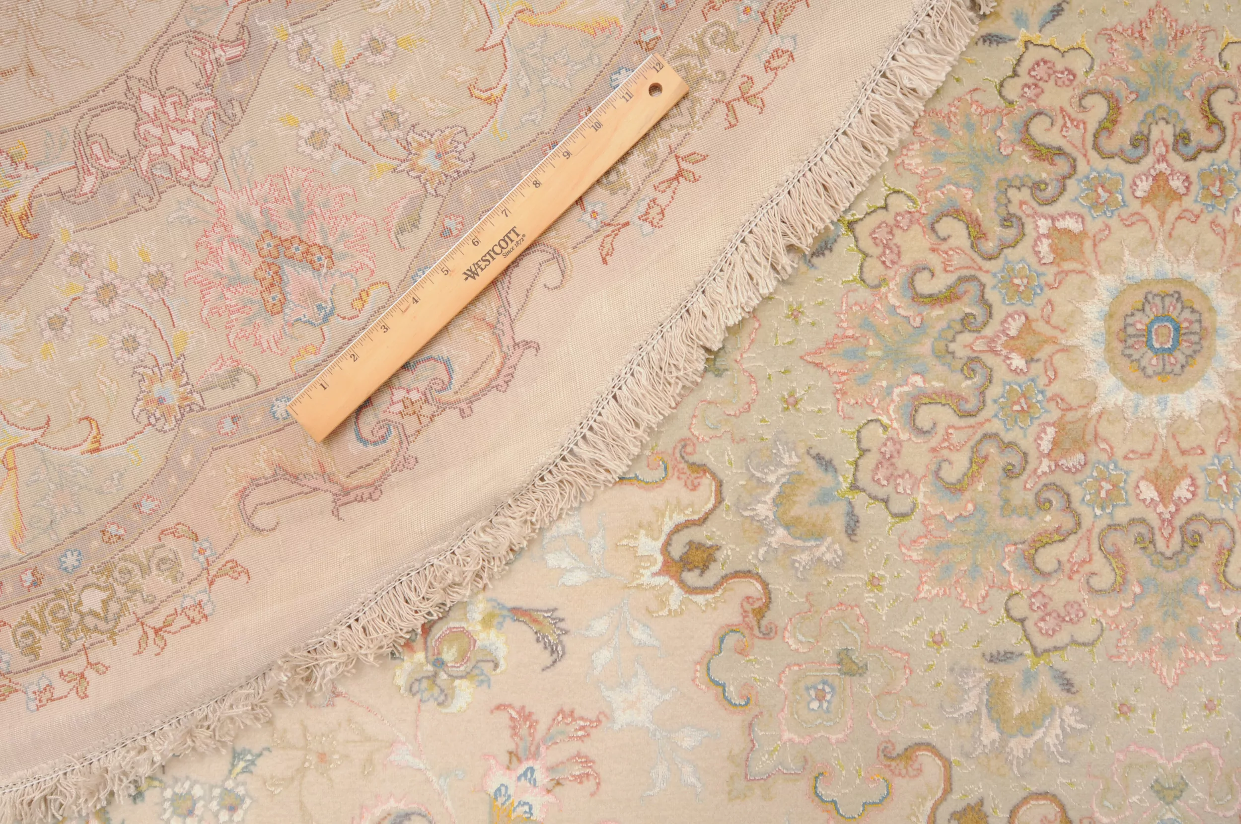 This new 8’3” x 8’3” round Persian Tabriz rug carries a beige, green, blue, and peach color palette, and an elaborate Floral design that took approximately 1164 days for weavers to finish handknotting this elegant piece at a high knot density of 625 KPSI. This particular rug has a low pile thickness of about 1/8″-1/4″ made with 100% handspun wool and silk pile with a silk foundation.