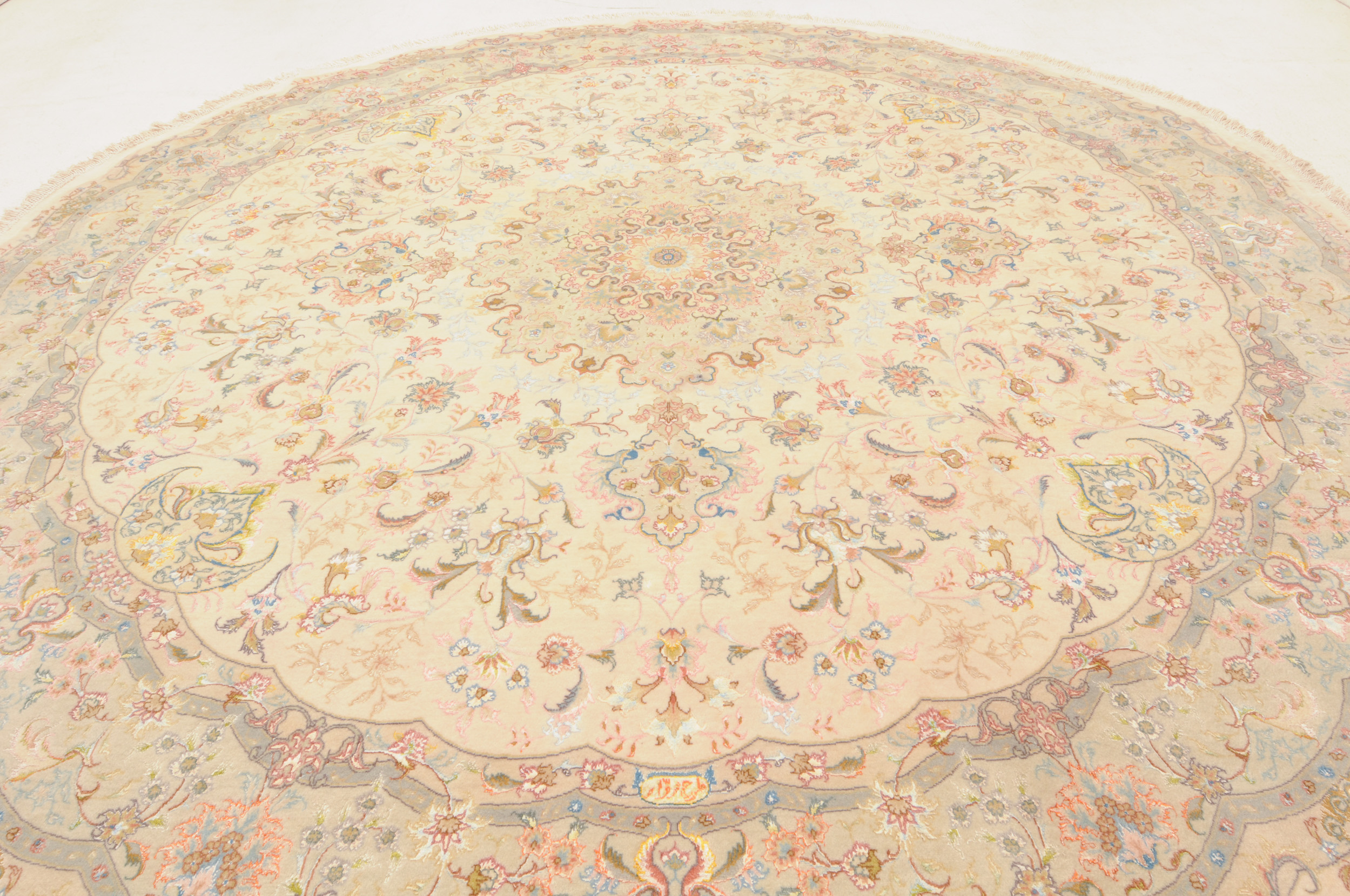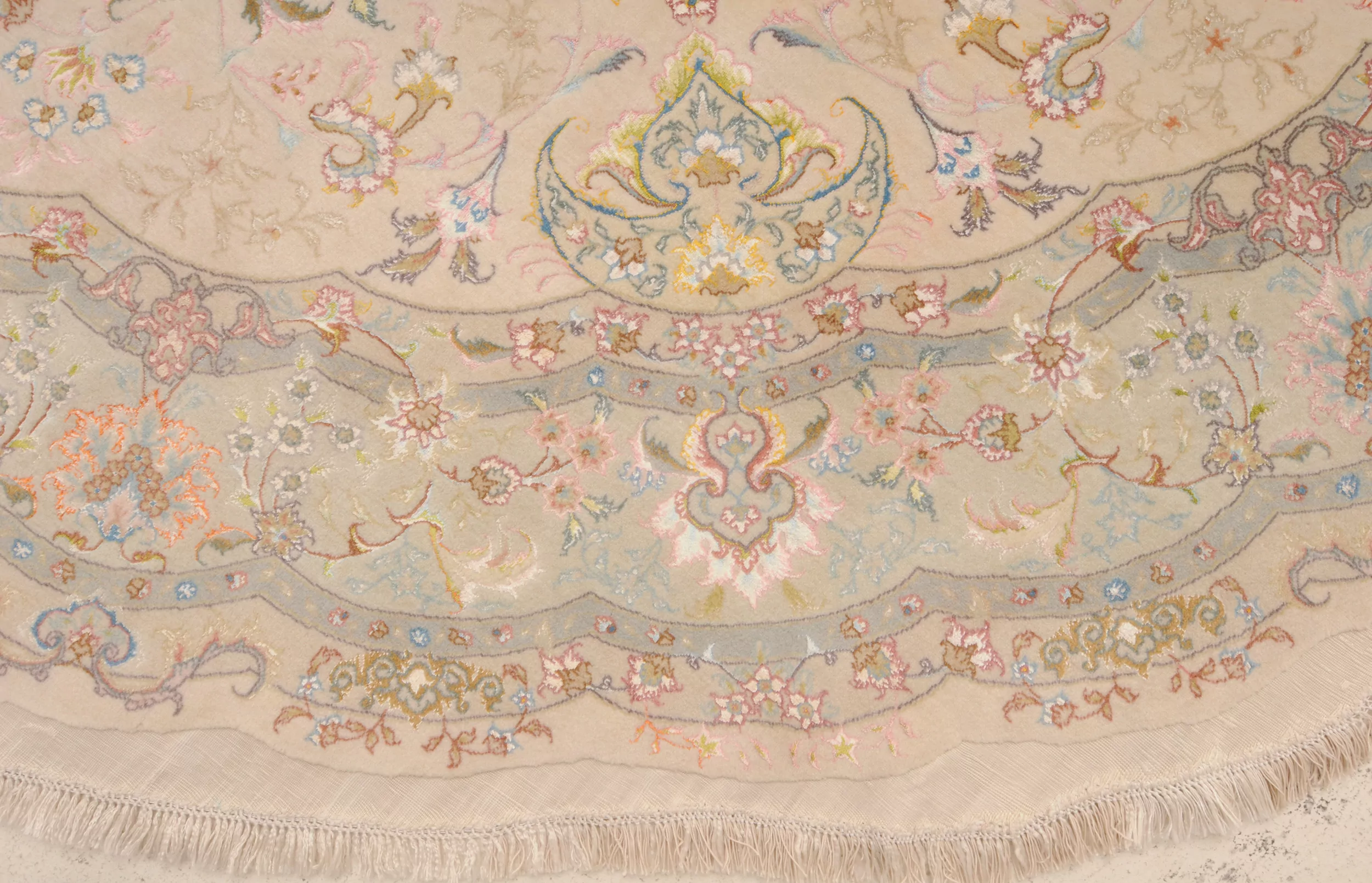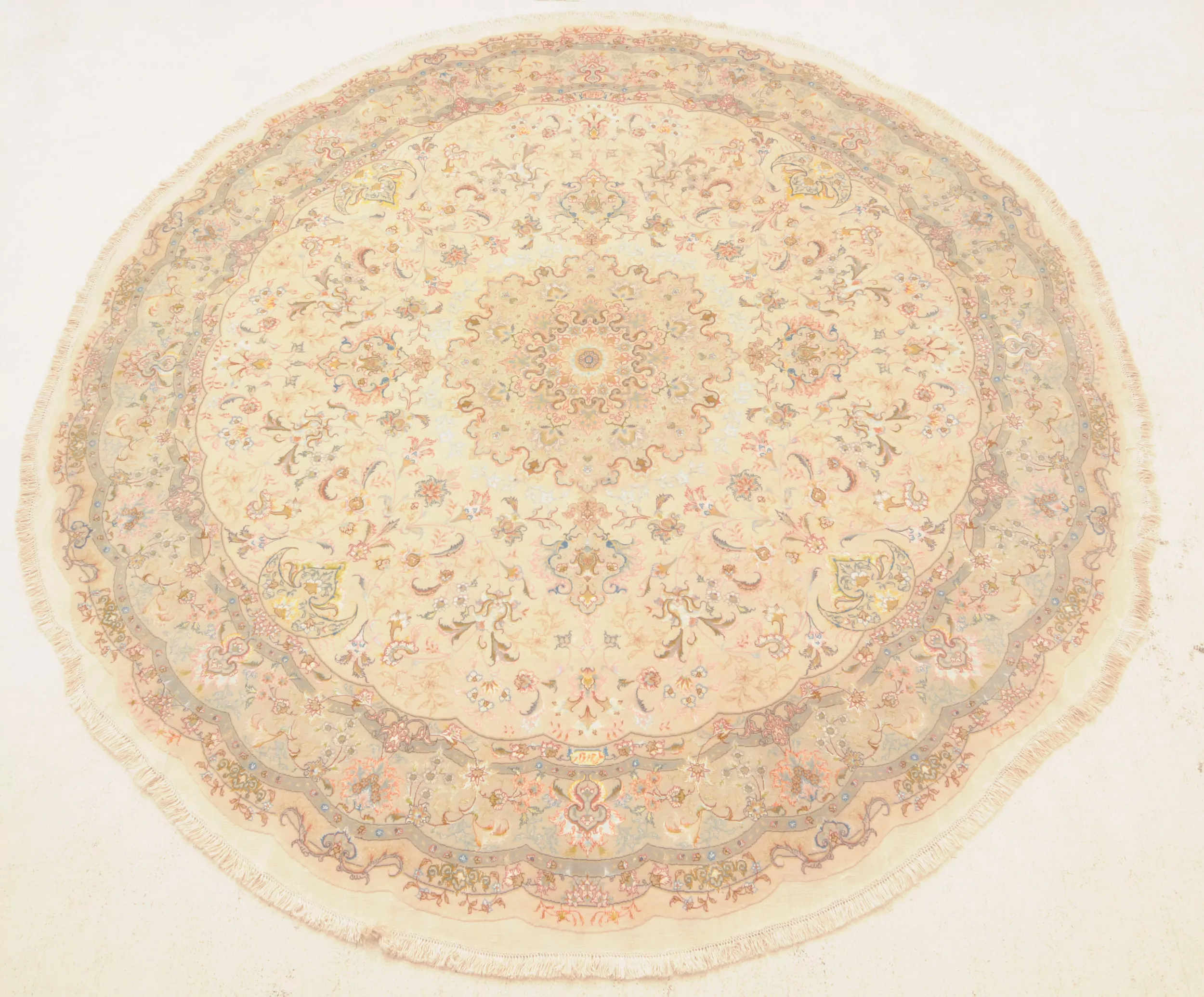 This new 8’3” x 8’3” round Persian Tabriz rug carries a beige, green, blue, and peach color palette, and an elaborate Floral design that took approximately 1164 days for weavers to finish handknotting this elegant piece at a high knot density of 625 KPSI. This particular rug has a low pile thickness of about 1/8″-1/4″ made with 100% handspun wool and silk pile with a silk foundation.