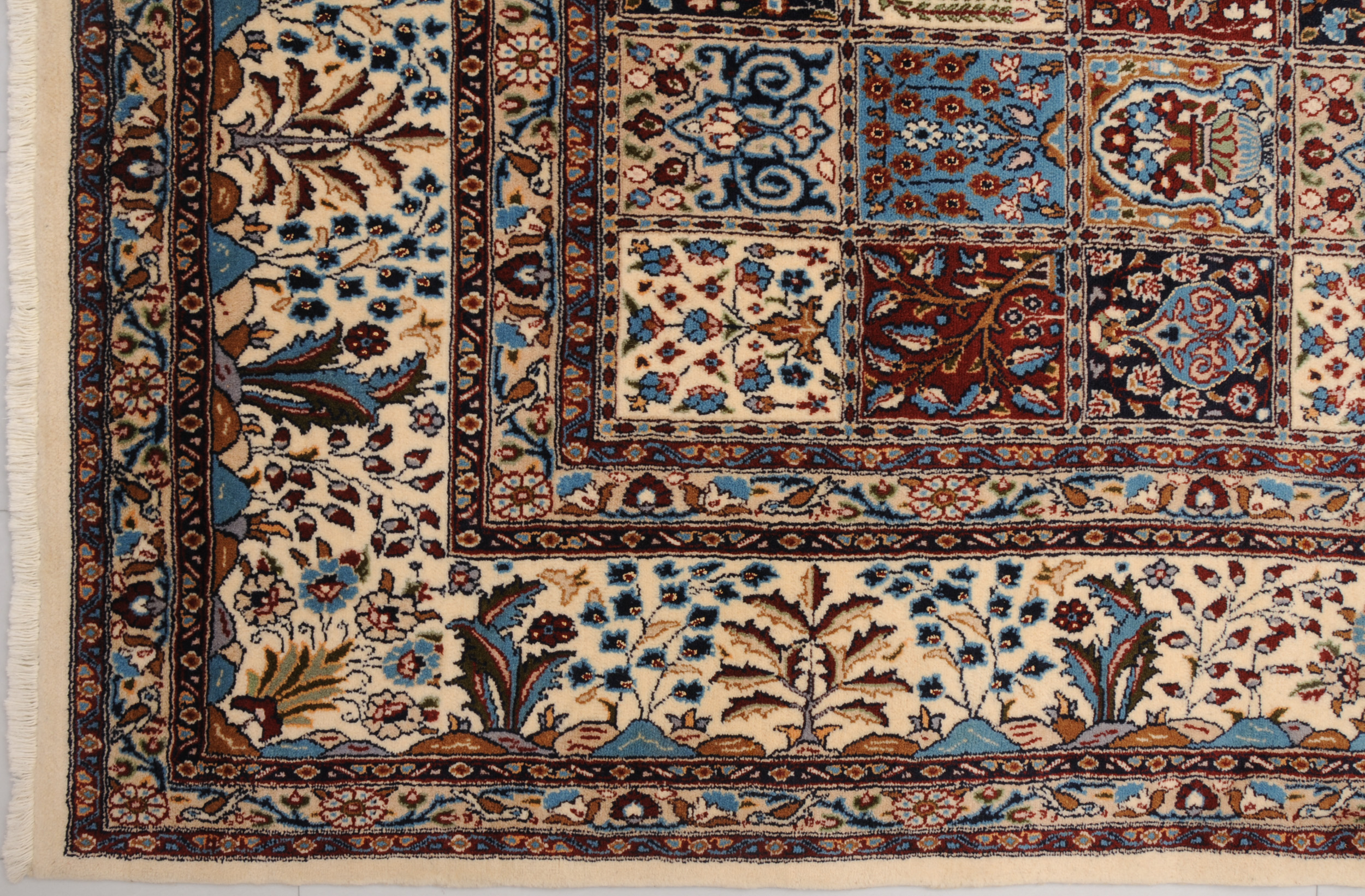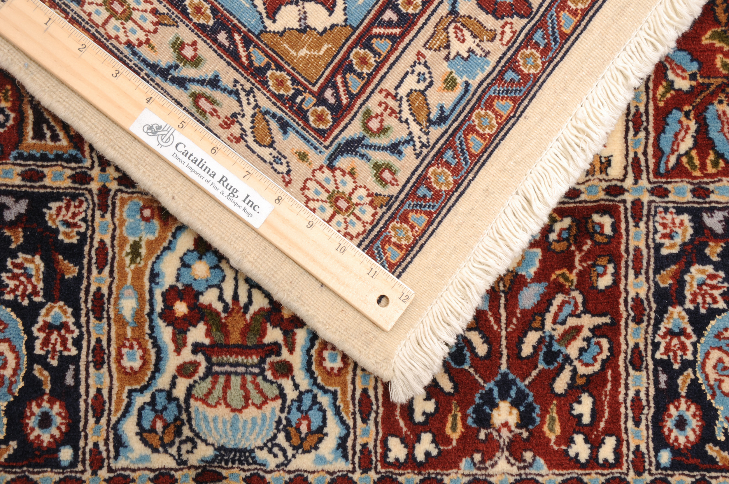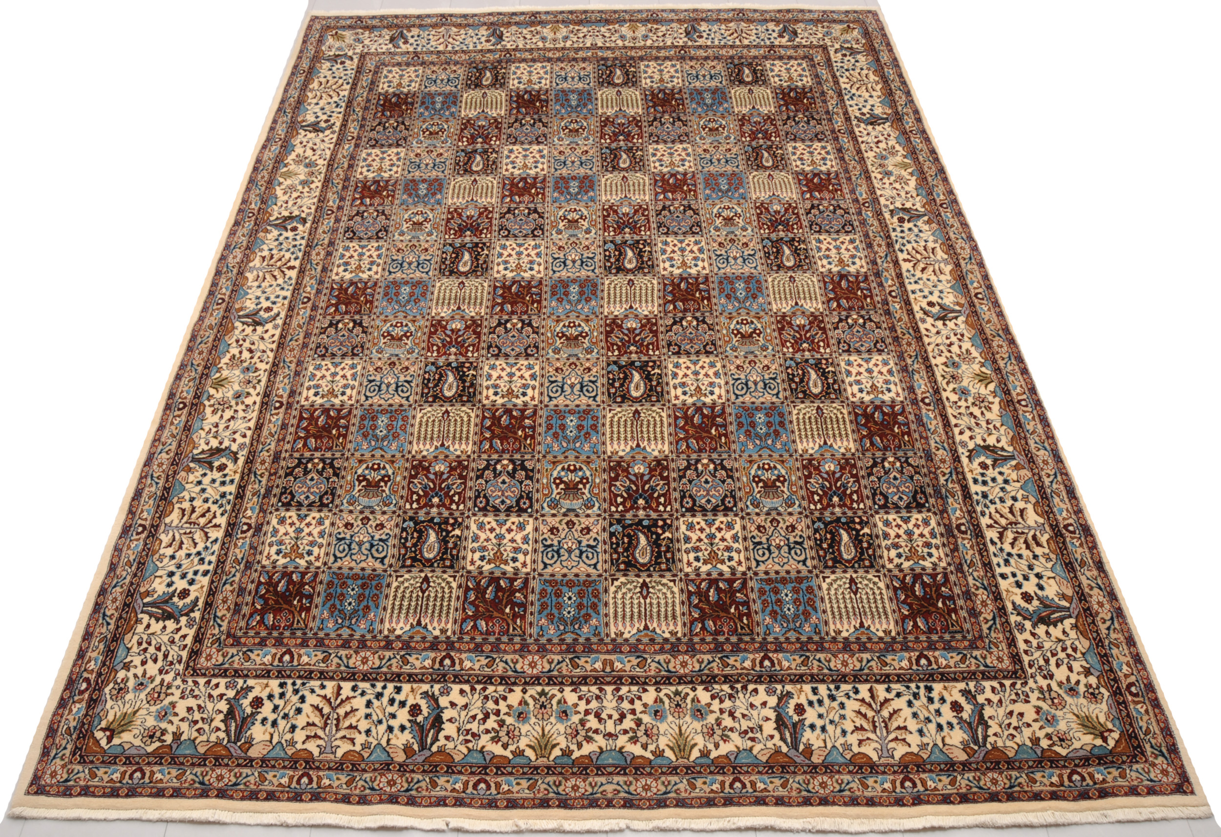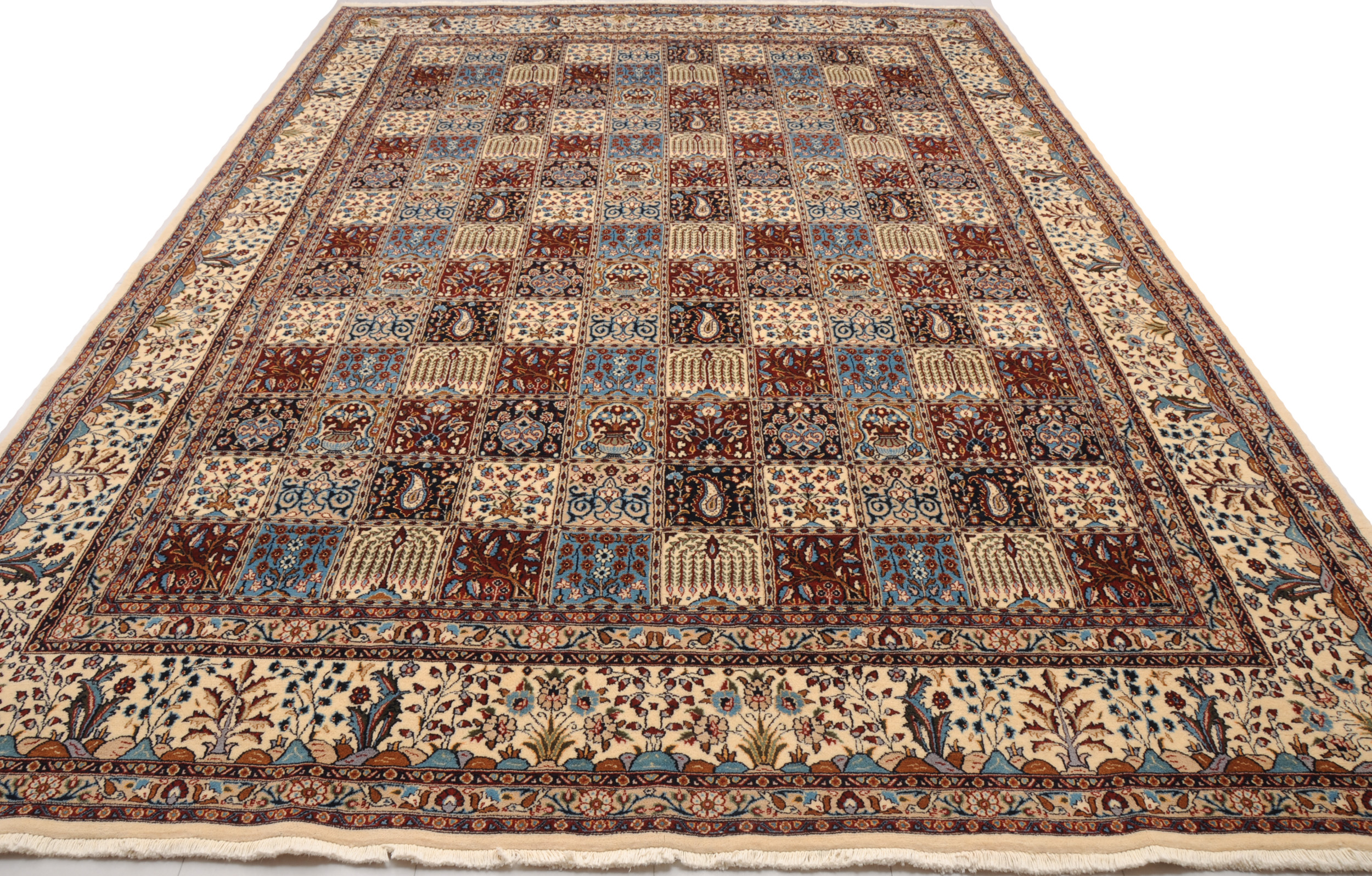 This Persian Rug is Hand Knotted with Wool & Silk Pile and Cotton Foundation. This Rug has a Garden Design and its Main colors are Rust, Orange, Blue, and Beige.