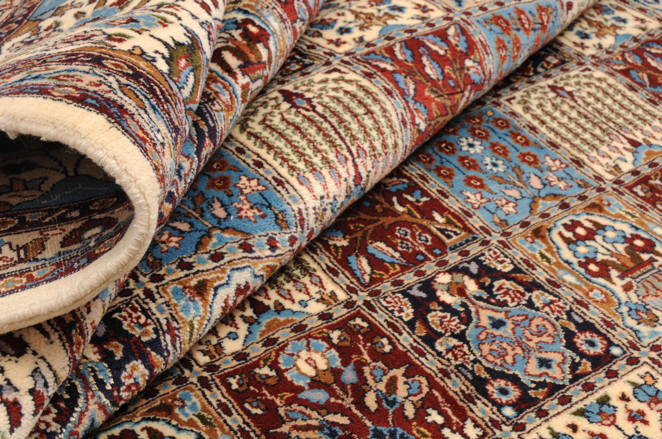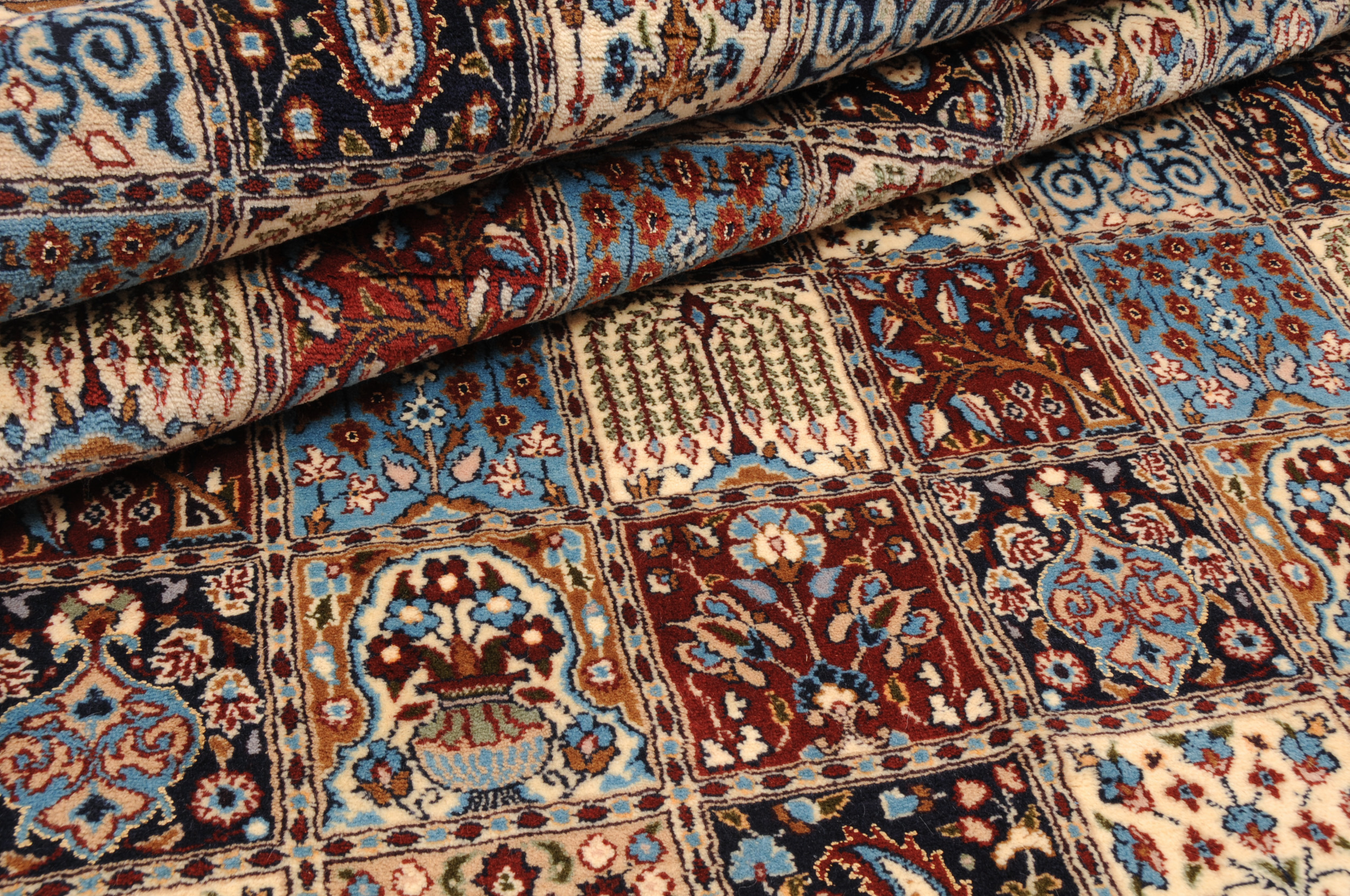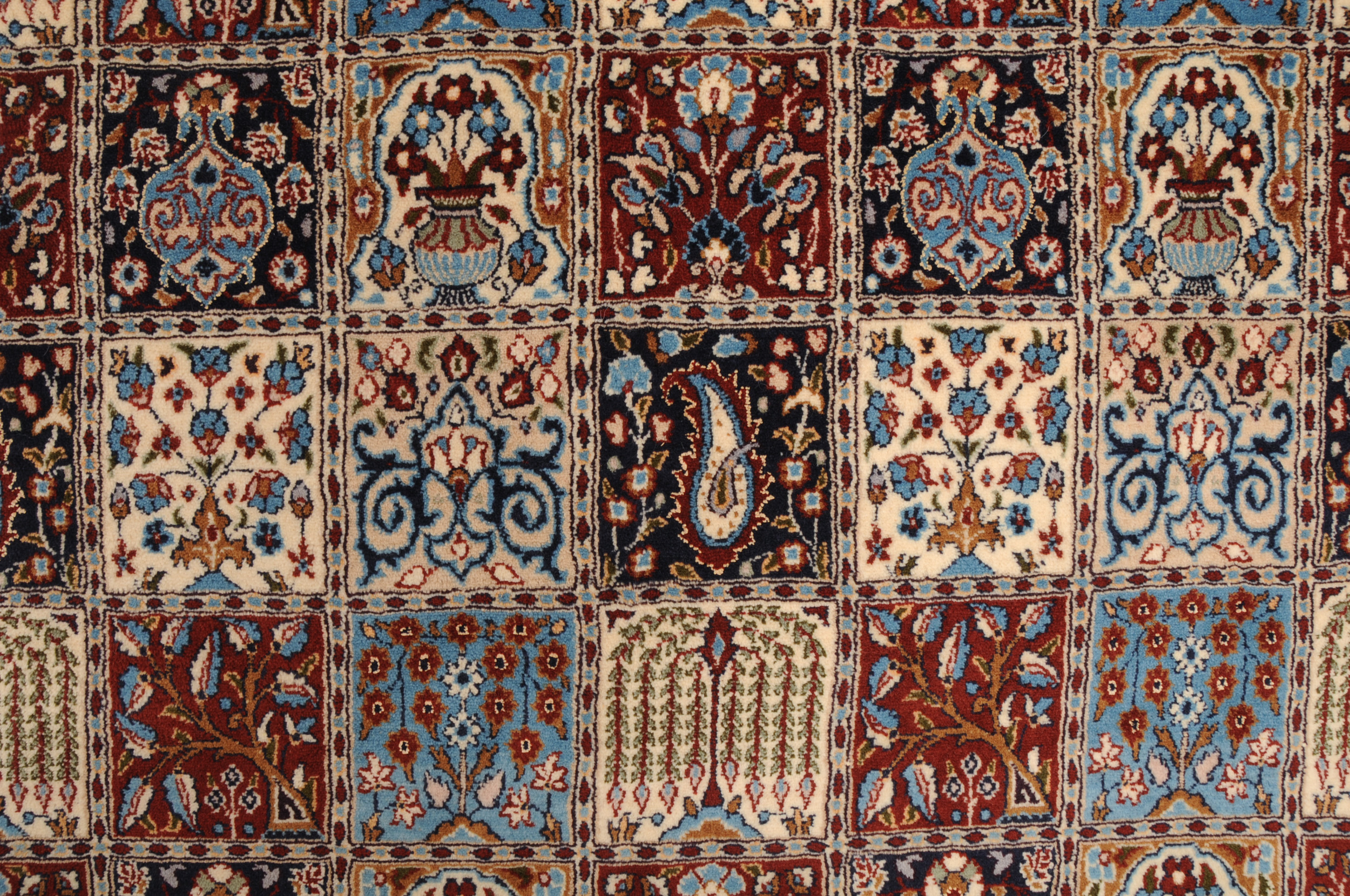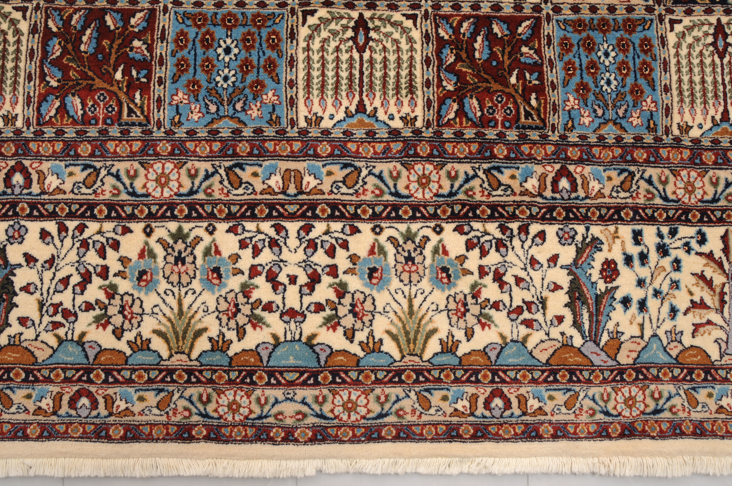 This Persian Rug is Hand Knotted with Wool & Silk Pile and Cotton Foundation. This Rug has a Garden Design and its Main colors are Rust, Orange, Blue, and Beige.