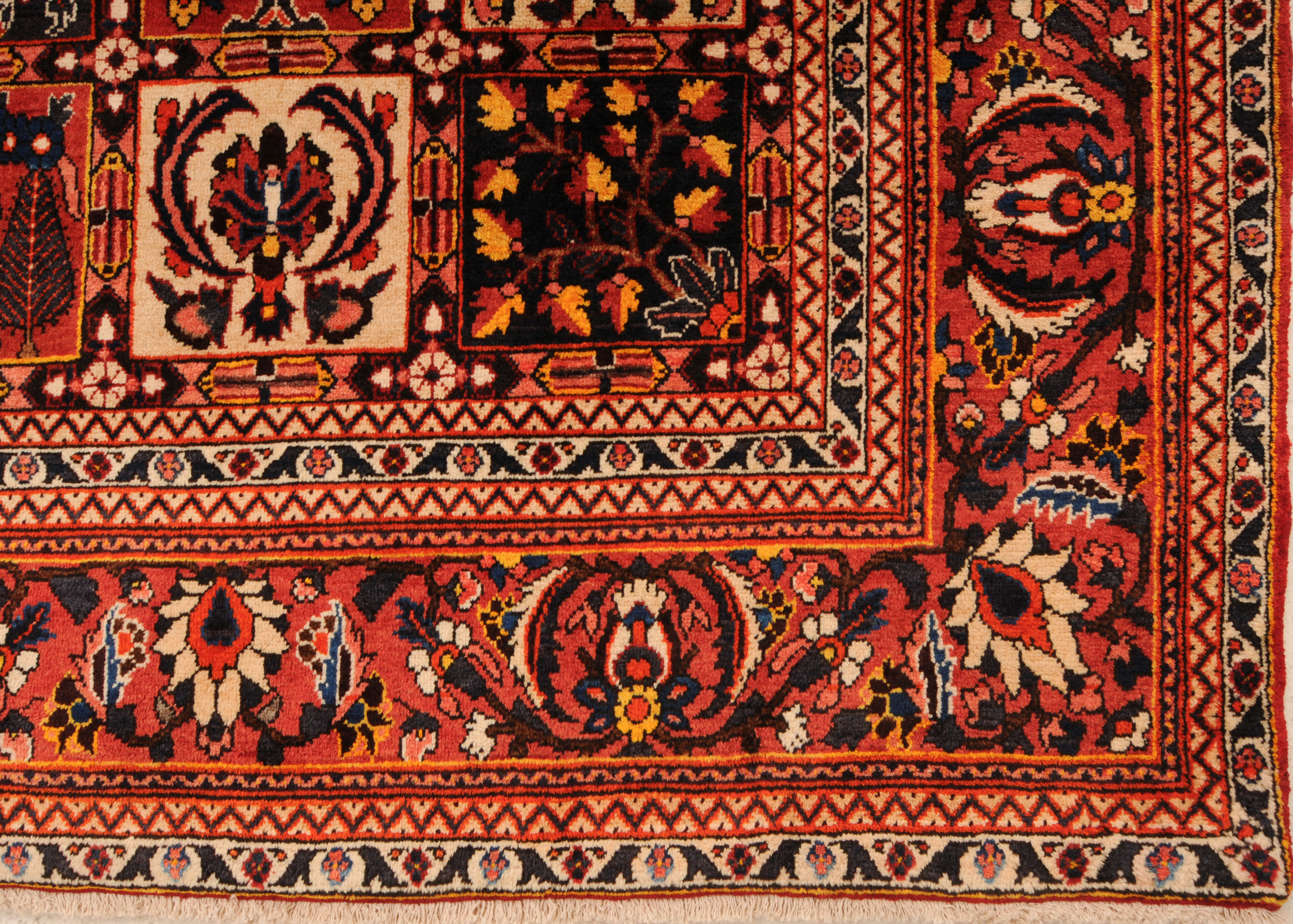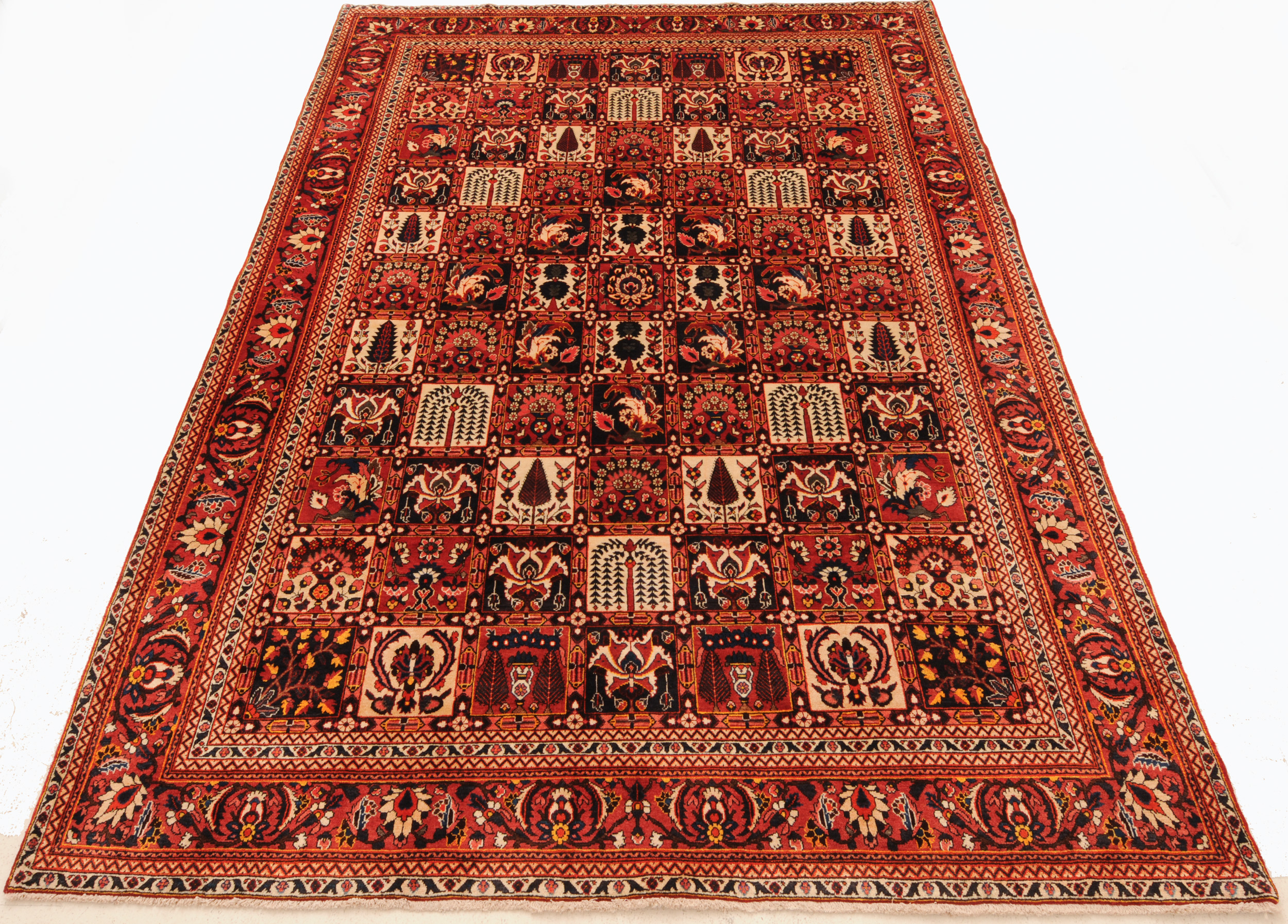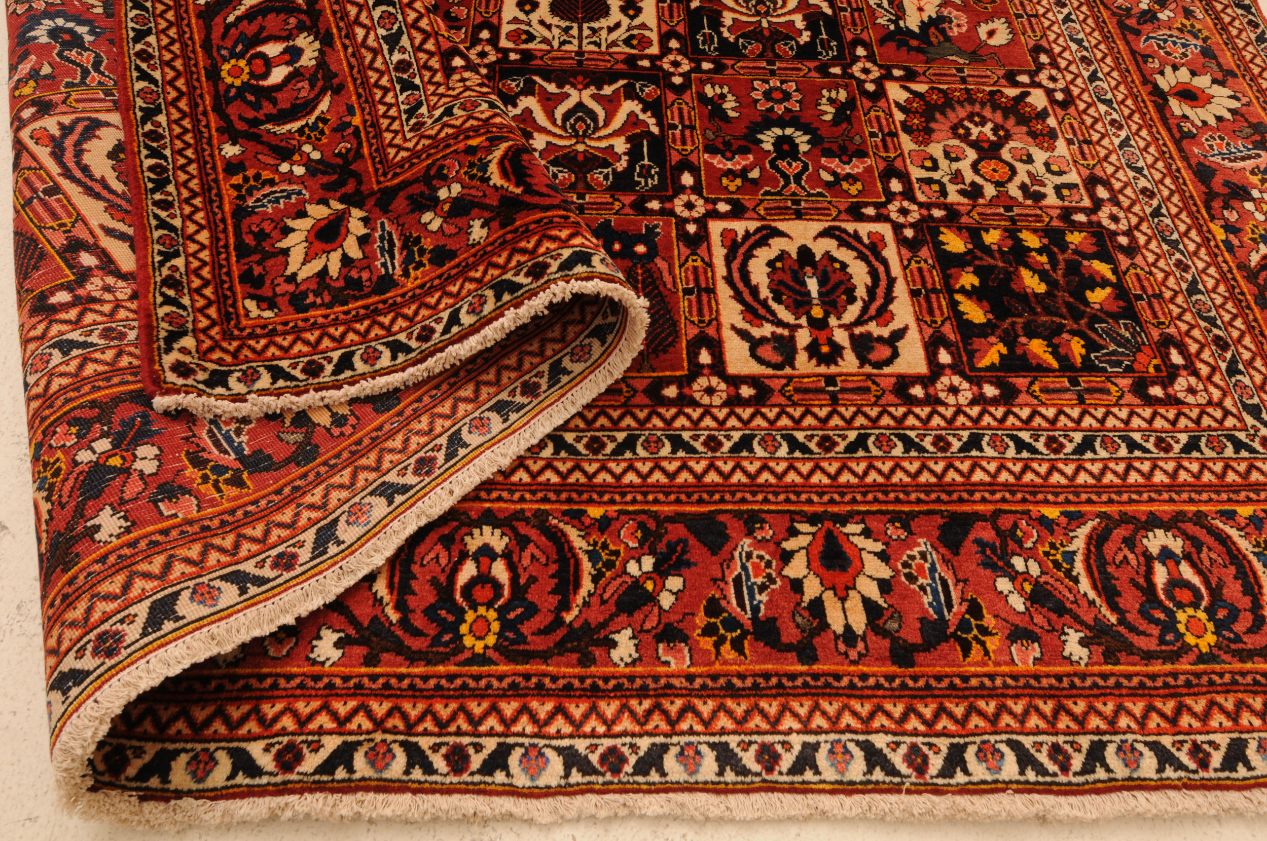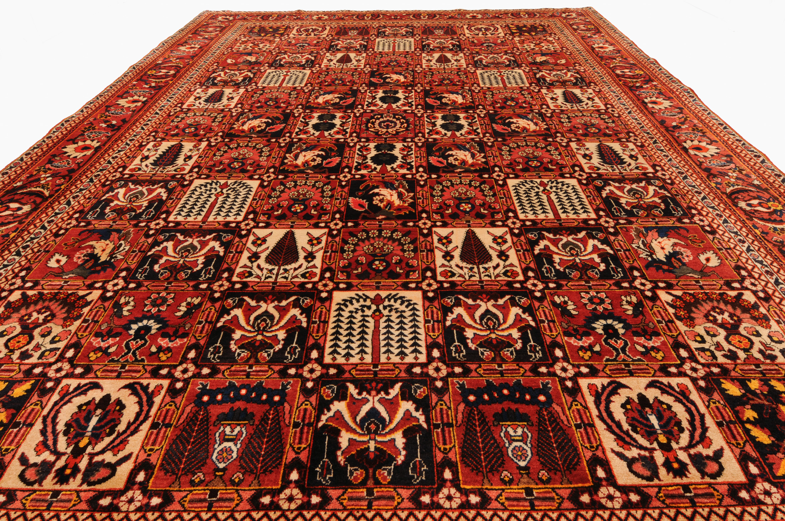 This Persian Rug is Hand Knotted with 100% Wool Pile and Cotton Foundation. This Rug has a Garden Design Design and its Main colors are Orange, Brown, and Peach.
