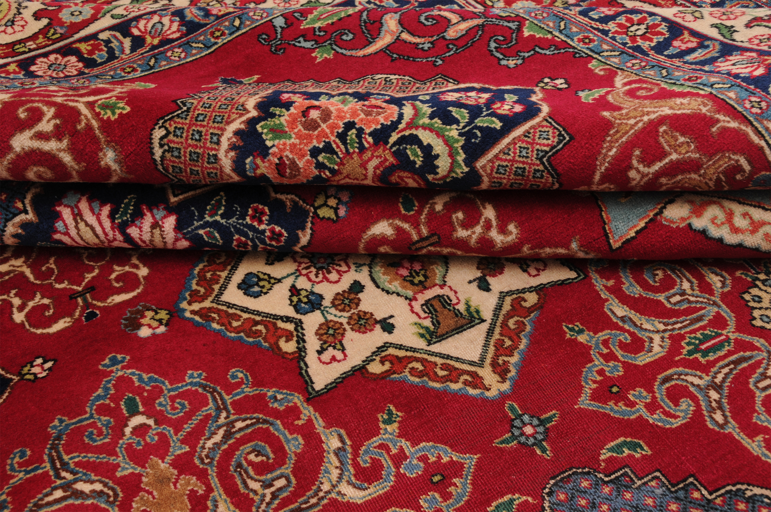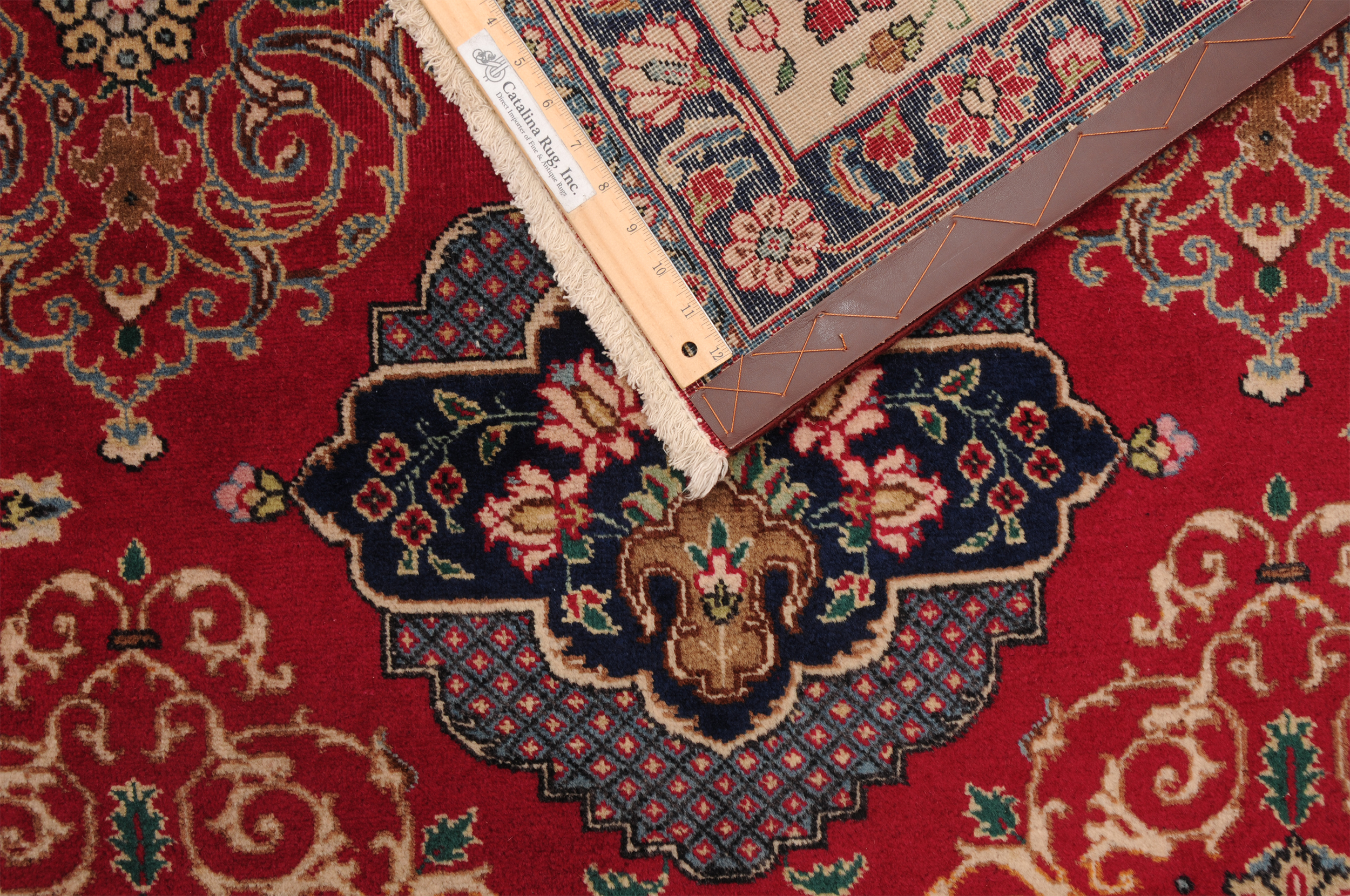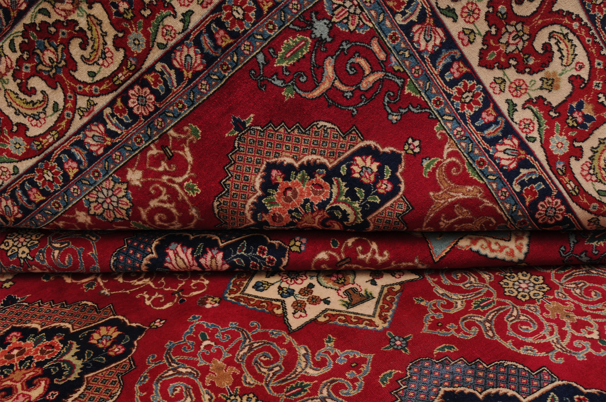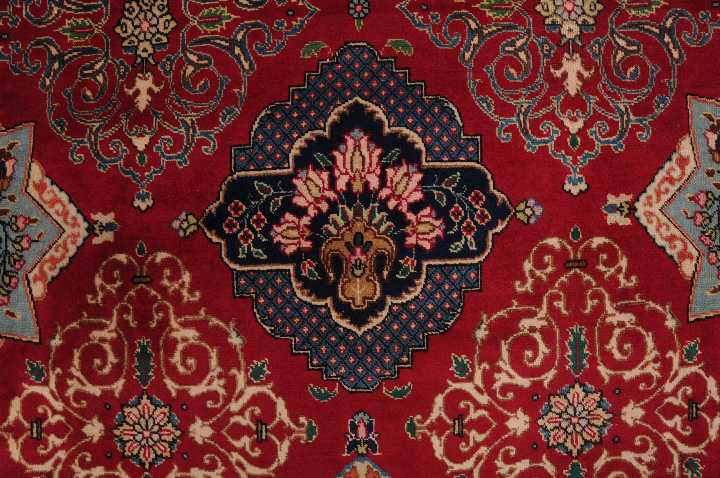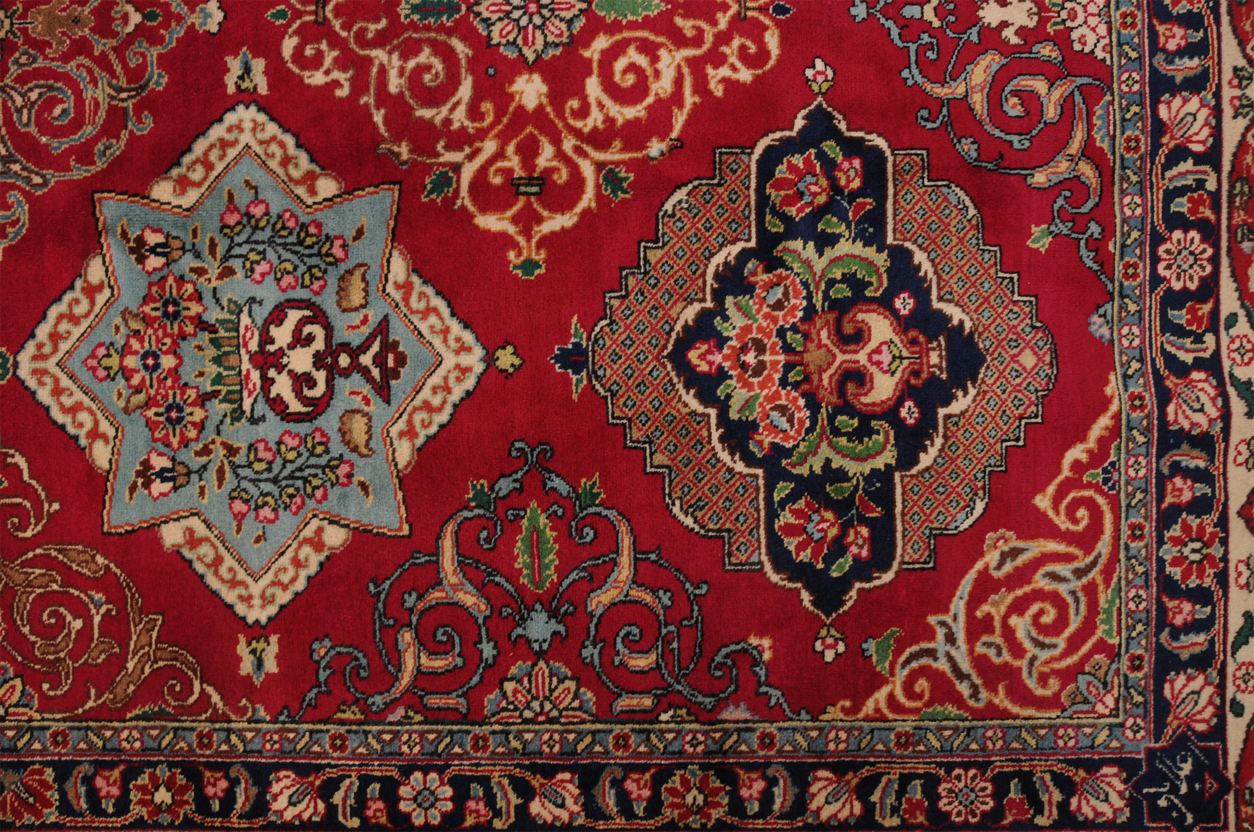 This Tabriz Persian rug features a beautiful Floral design in Red and Beige. It is made of 100% wool and has a medium pile height of 1/3″-3/8″ and a knot density of approximately 196 KPSI. Perfect for dining and living room.