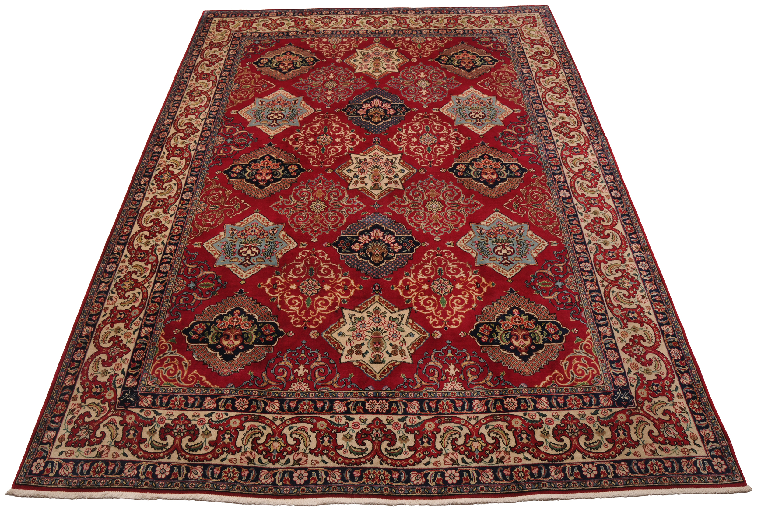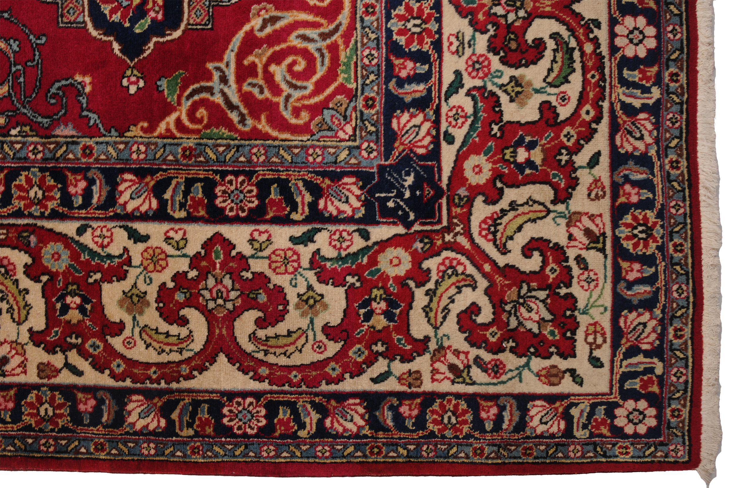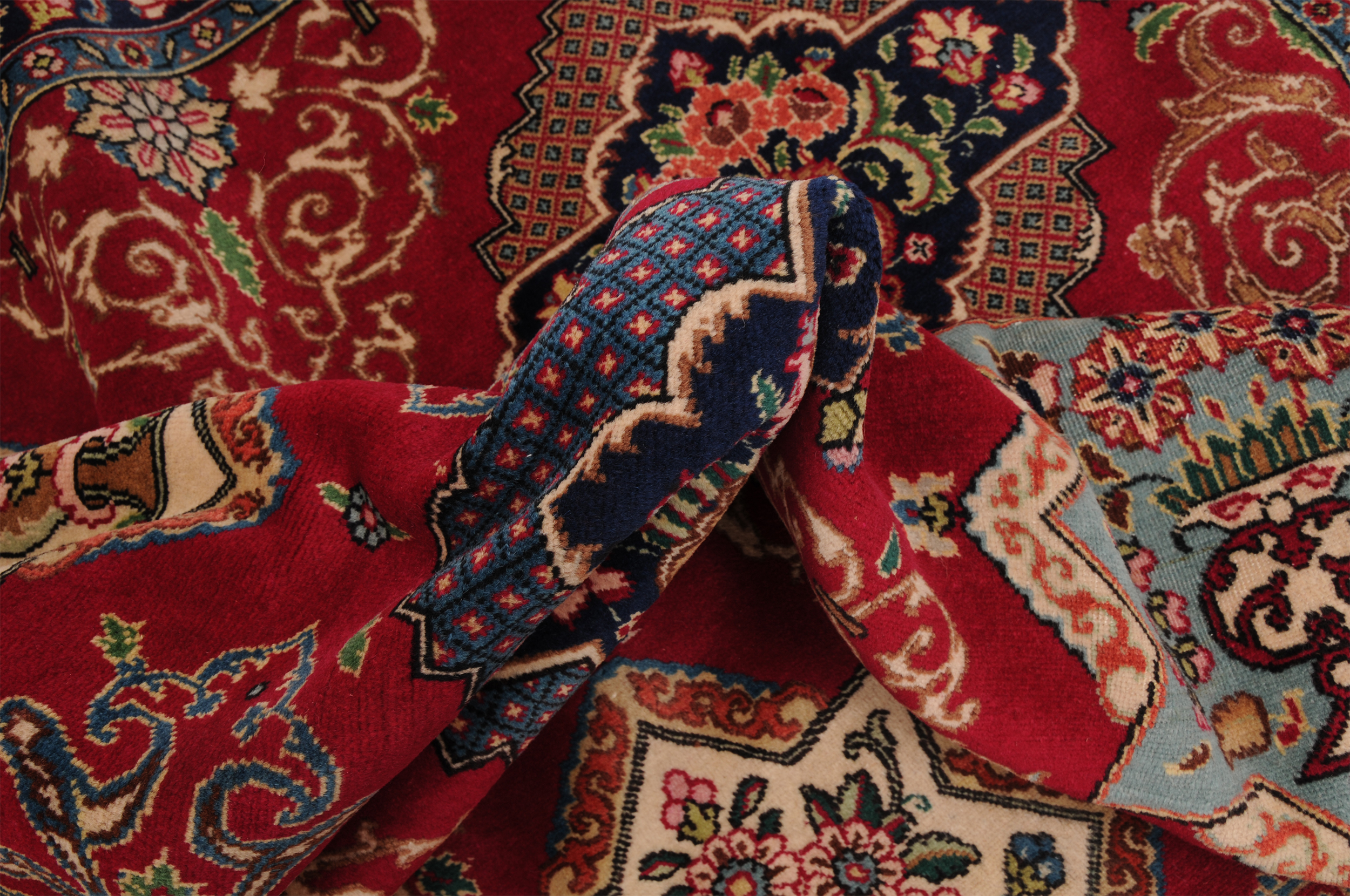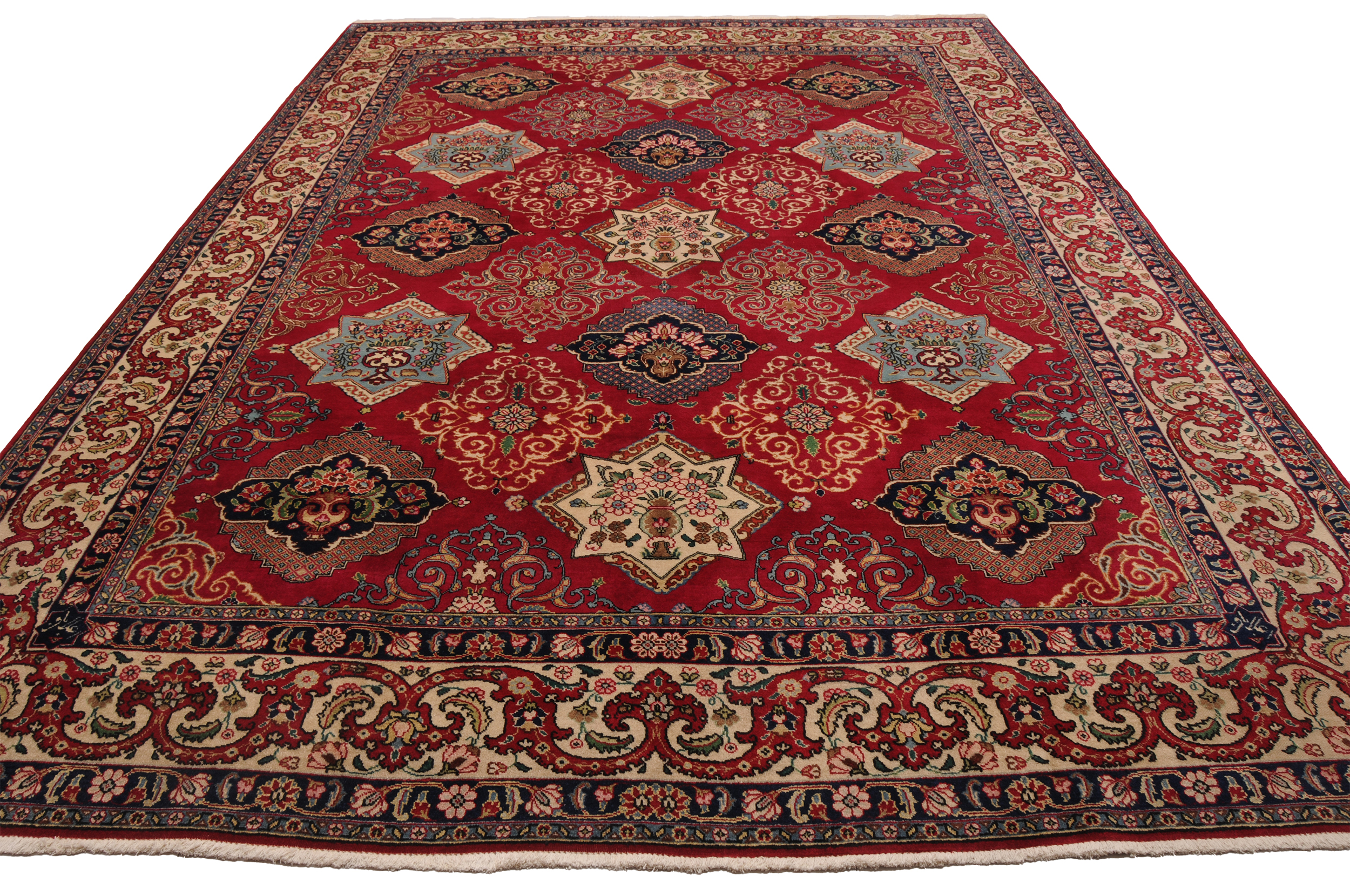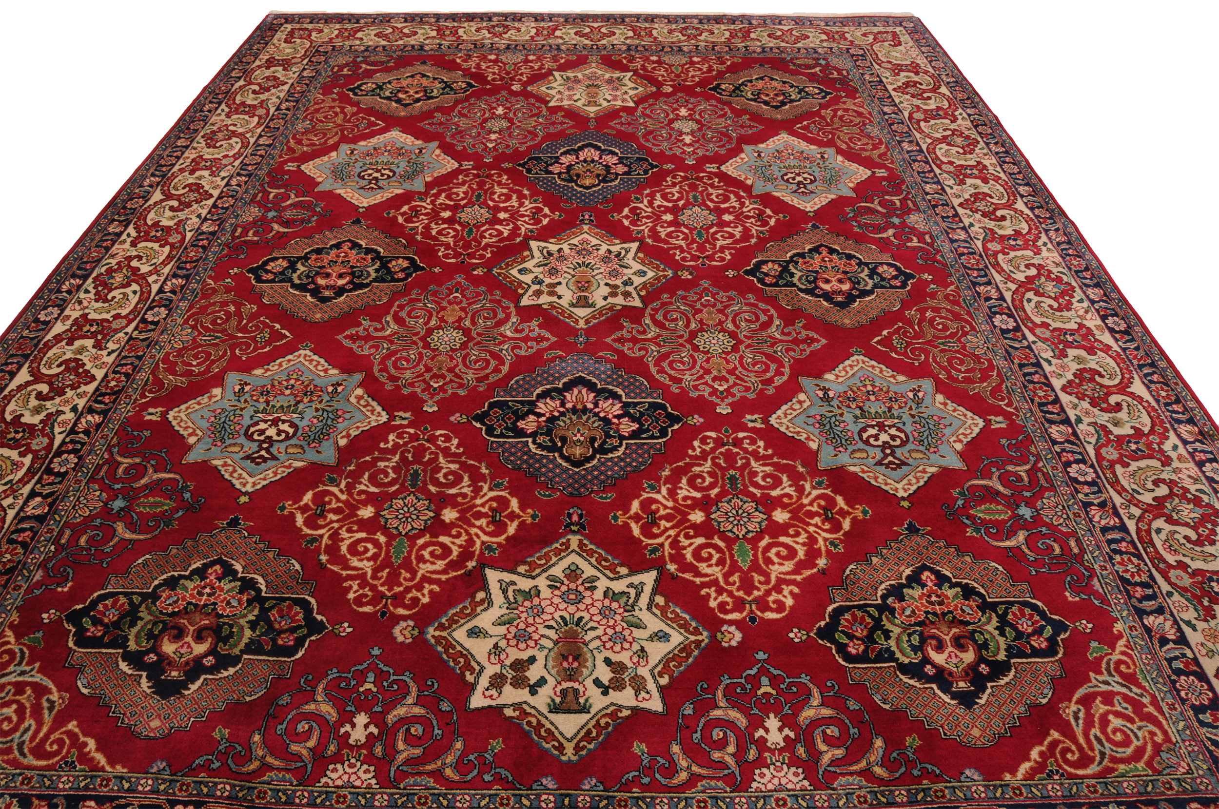 This Tabriz Persian rug features a beautiful Floral design in Red and Beige. It is made of 100% wool and has a medium pile height of 1/3″-3/8″ and a knot density of approximately 196 KPSI. Perfect for dining and living room.