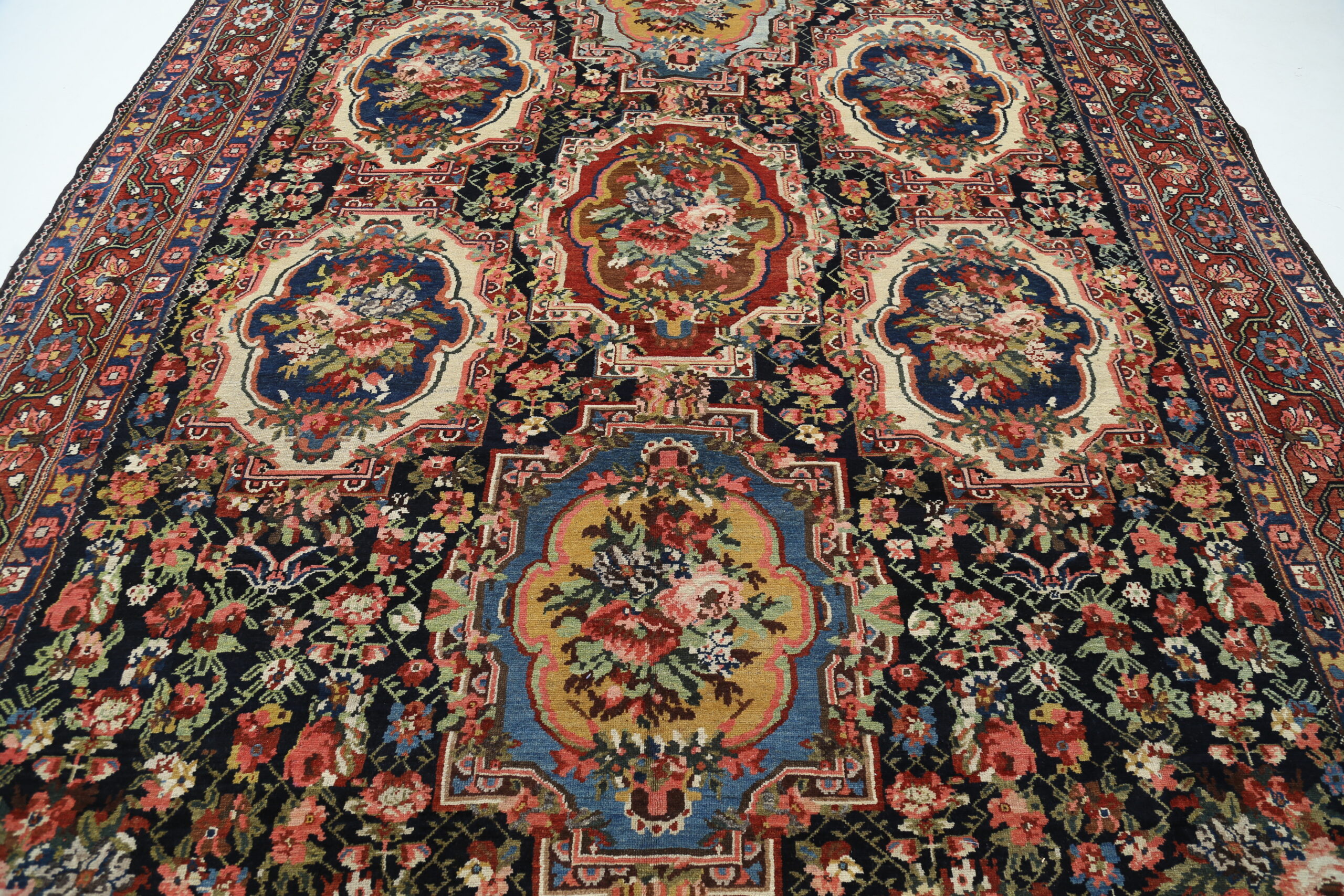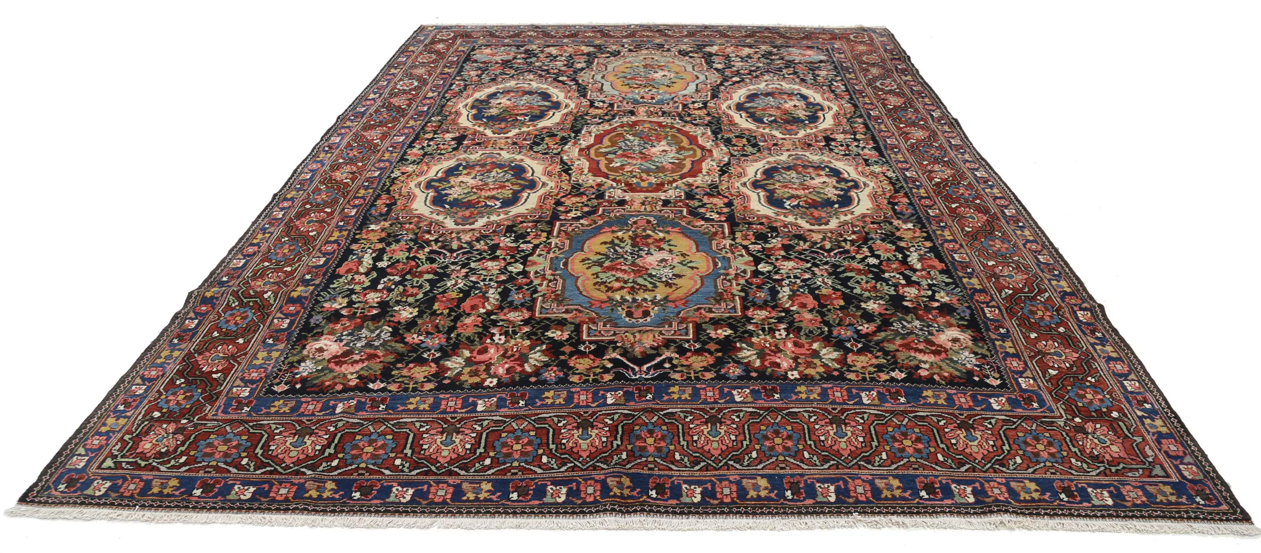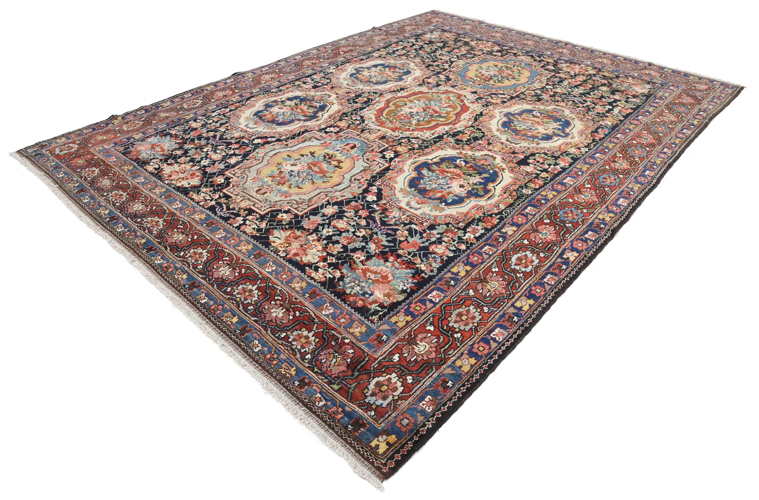 This exquisite Bakhtiari Persian rug, aged 80-100 years, features a stunning combination of rust, peach, yellow, and green colors. Made from 100% wool with a medium pile of 1/3″-3/8″, it boasts a knot density of approximately 225 KPSI. The panel design in blue adds a touch of elegance to this 9’1″ x 12’6″ masterpiece.