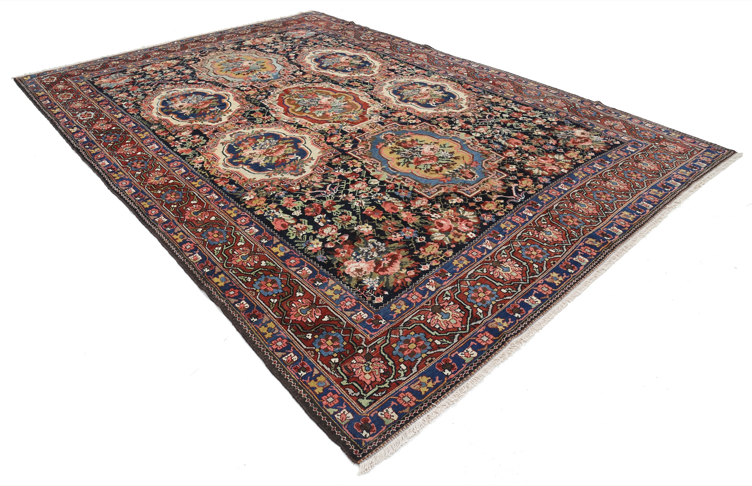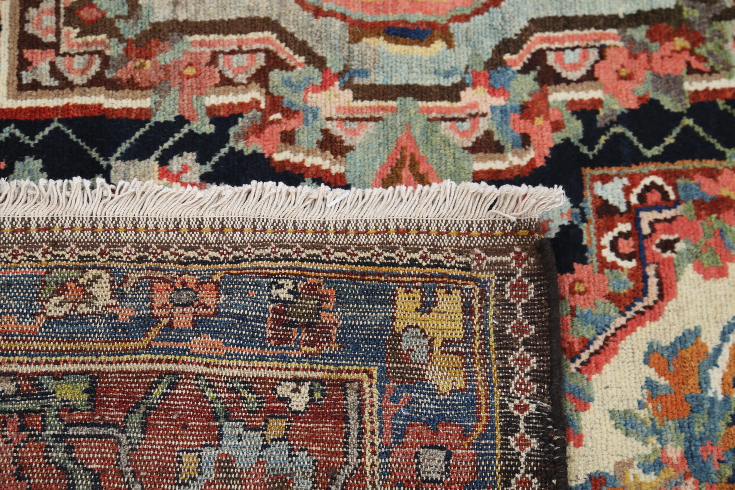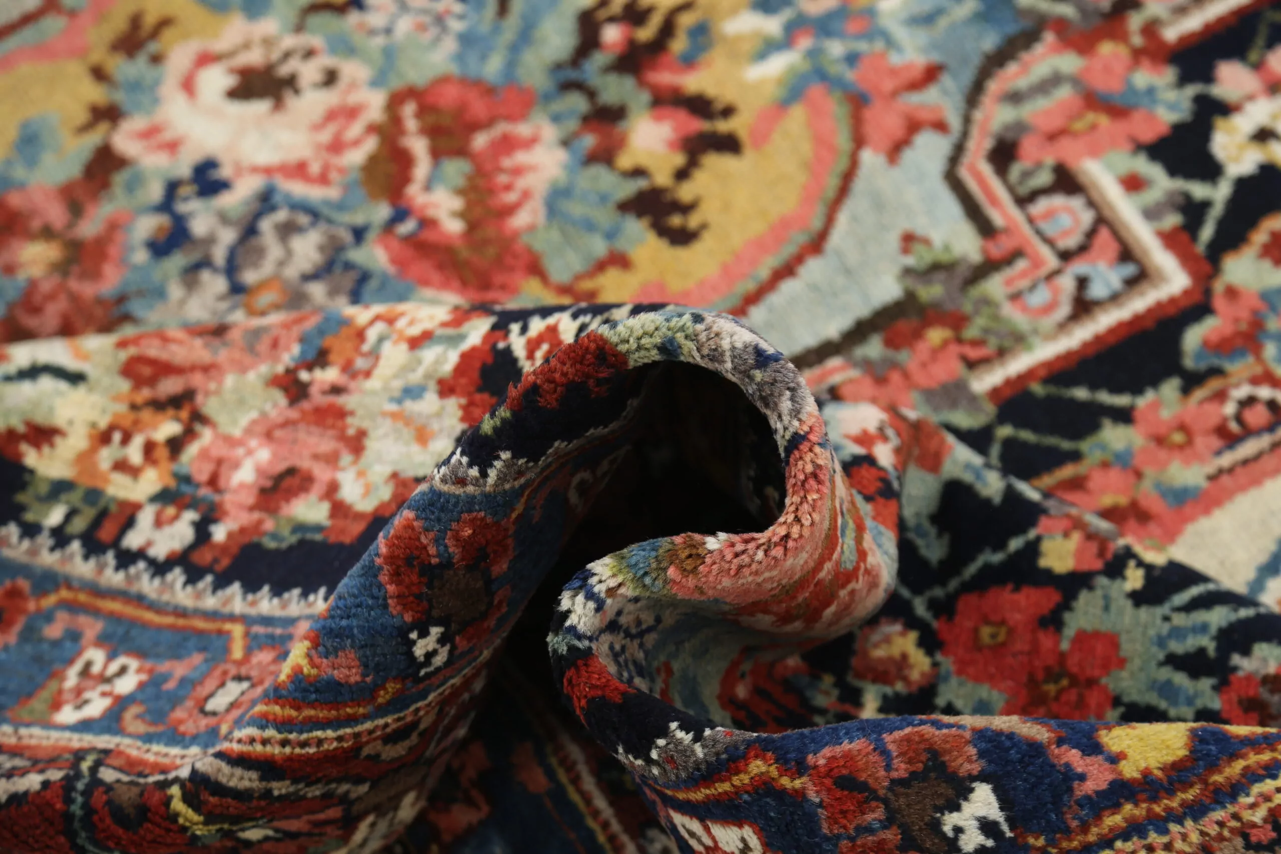 This exquisite Bakhtiari Persian rug, aged 80-100 years, features a stunning combination of rust, peach, yellow, and green colors. Made from 100% wool with a medium pile of 1/3″-3/8″, it boasts a knot density of approximately 225 KPSI. The panel design in blue adds a touch of elegance to this 9’1″ x 12’6″ masterpiece.