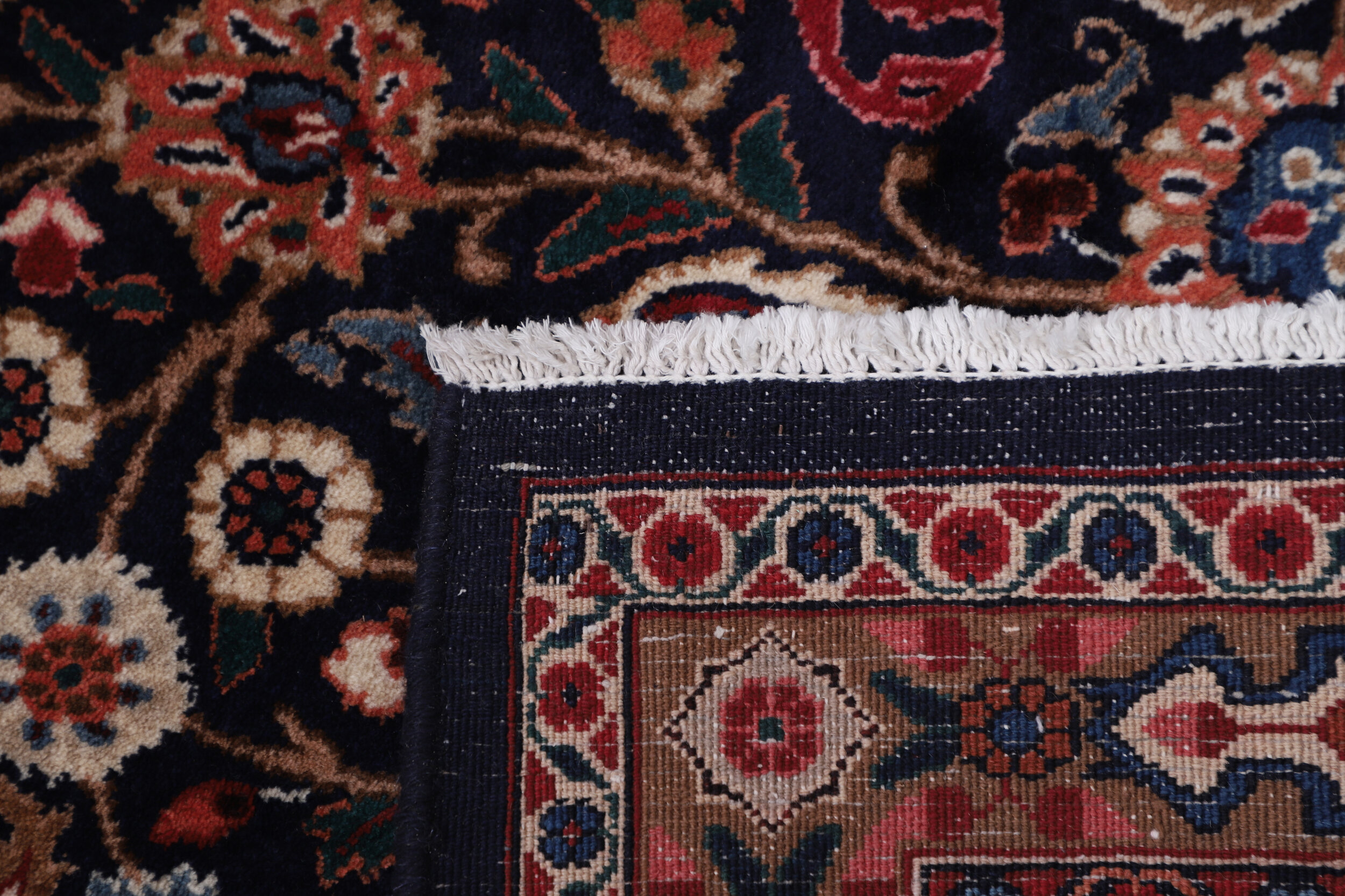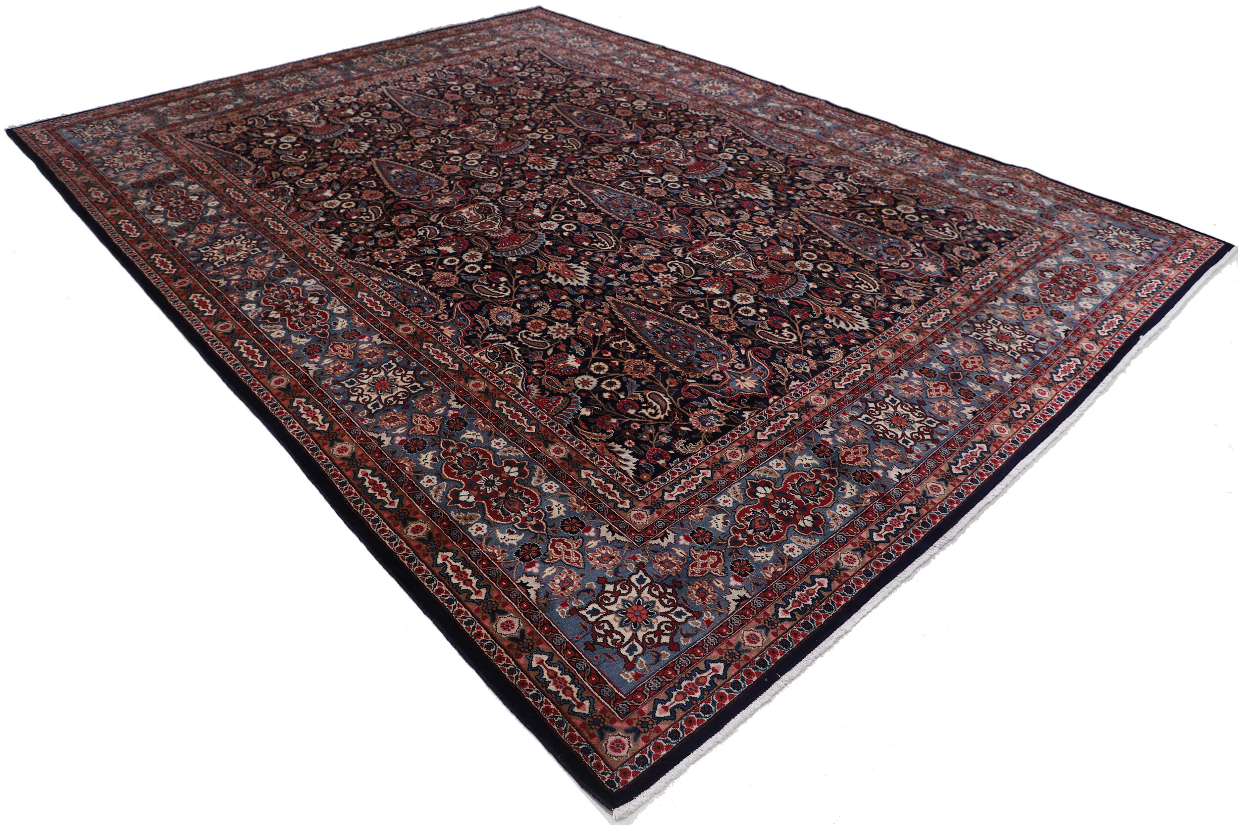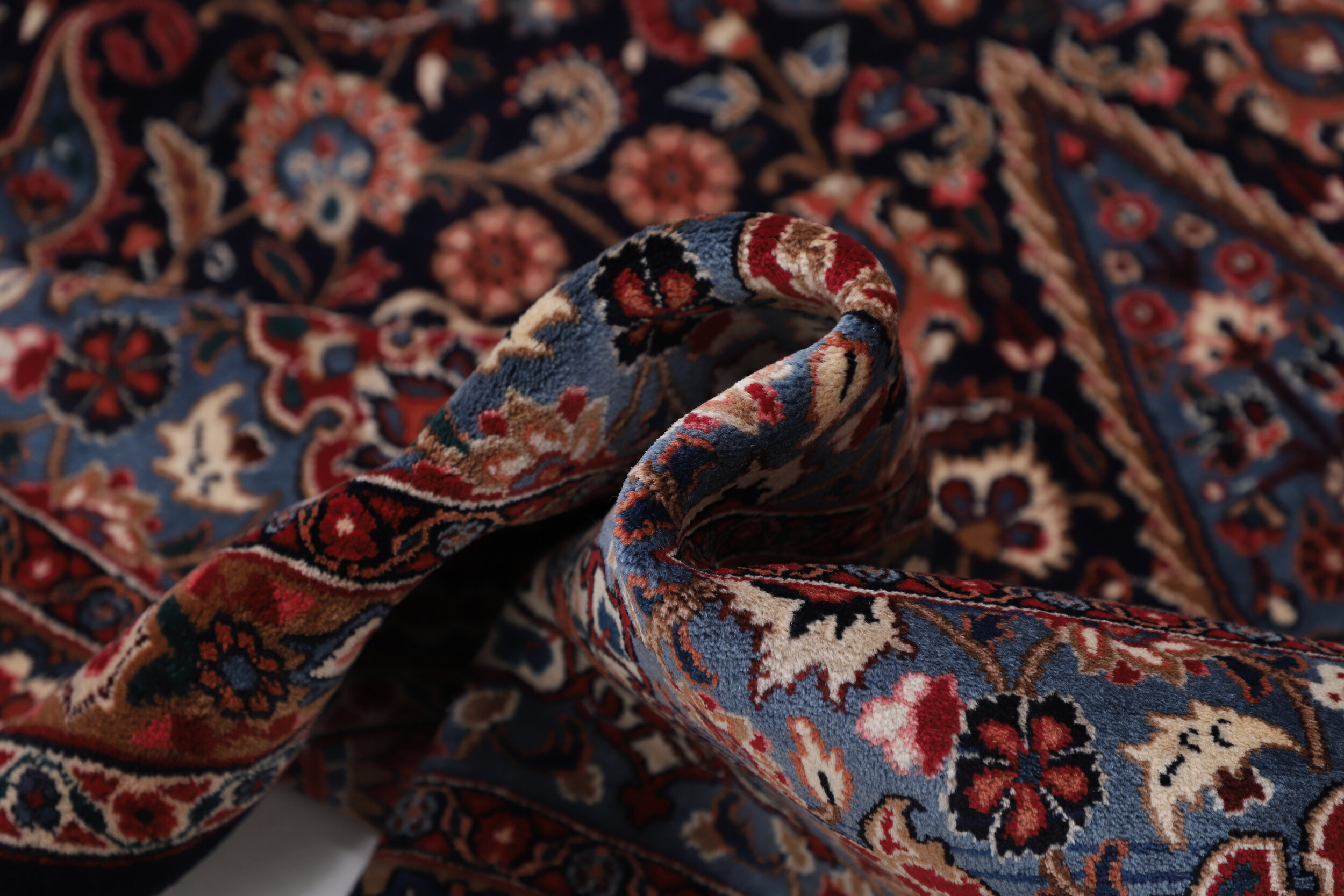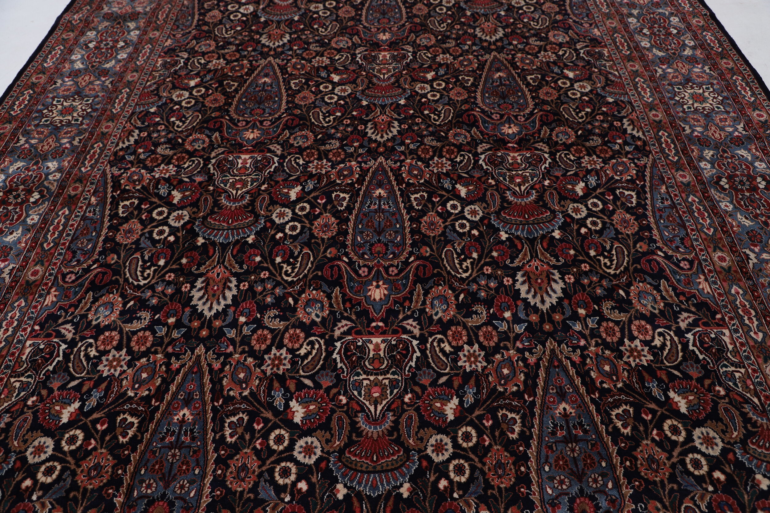 Hand Knotted Moud 9’7″ x 12’9″ Aged (40-50 years) Blue Floral Persian Rug. This exquisite rug showcases intricate floral patterns in vibrant shades of red and blue. With a dense knot count of approximately 225 knots per square inch, this rug is meticulously crafted using 100% wool on a cotton foundation. The medium pile height of 1/3″-3/8″ provides a luxurious feel underfoot. Perfect for adding a touch of elegance and sophistication to any space.