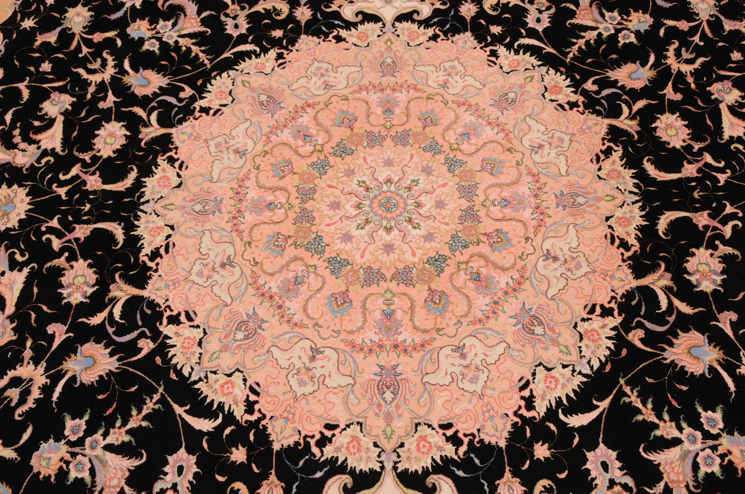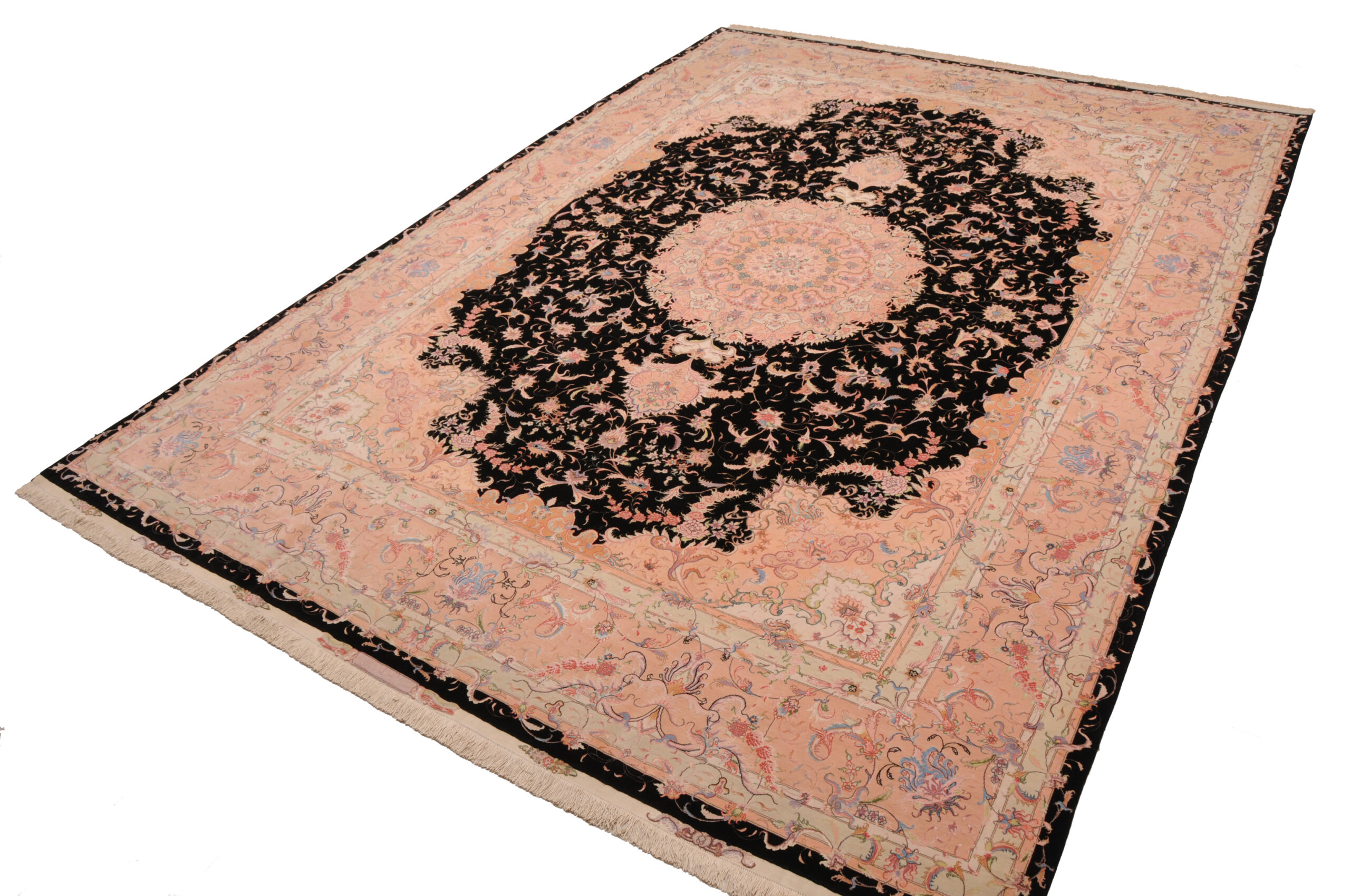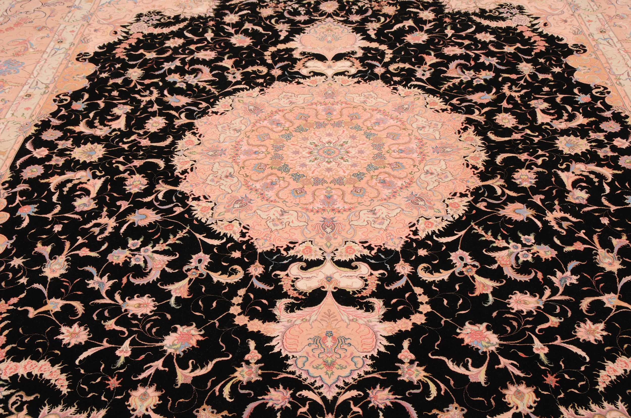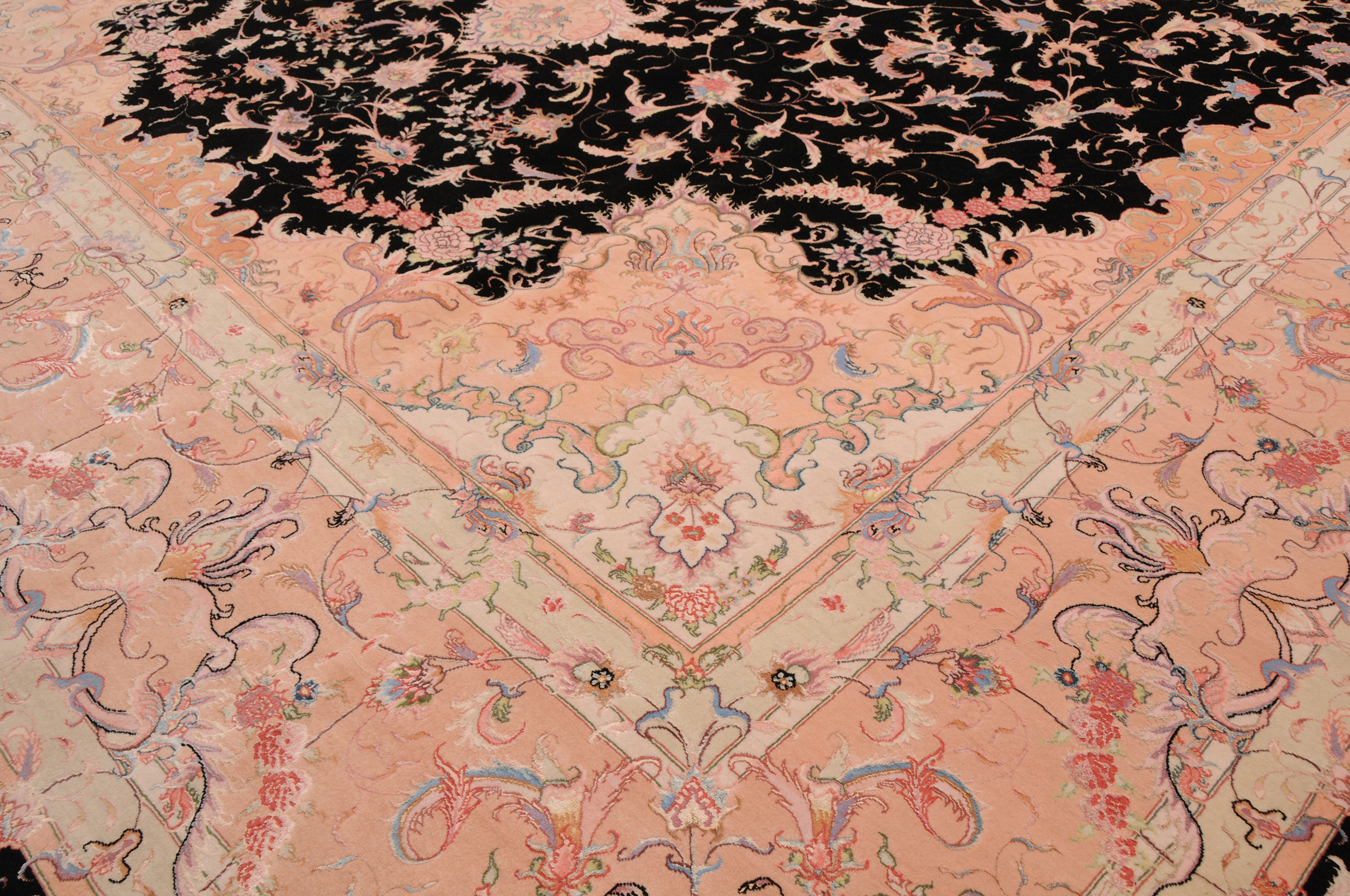 This 9’7″ x 13’3″ Tabriz rug, hand-knotted in Persian, features a medallion design. It is woven with Approx.484 KPS, showcasing a field in Black and a Pink border. The rug has a Medium Pile and a Silk & Wool pile, and is in excellent condition.