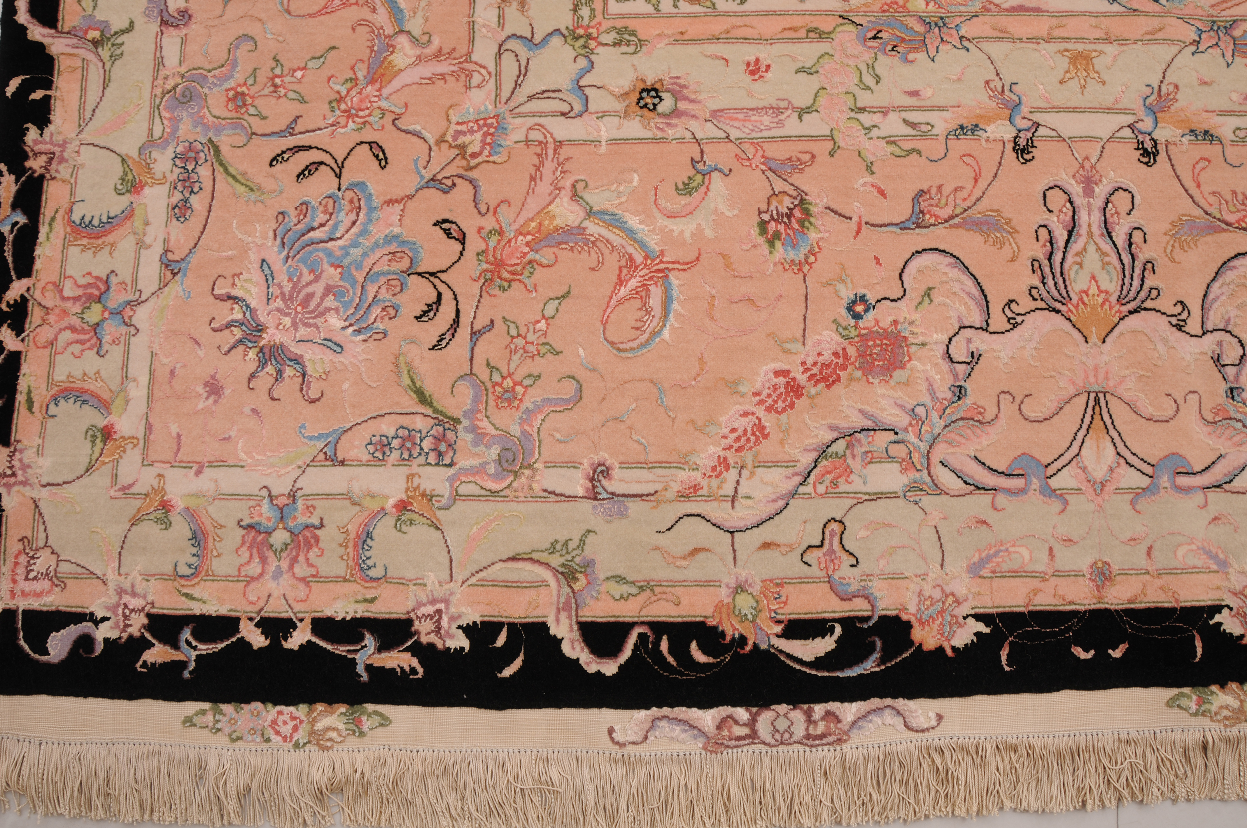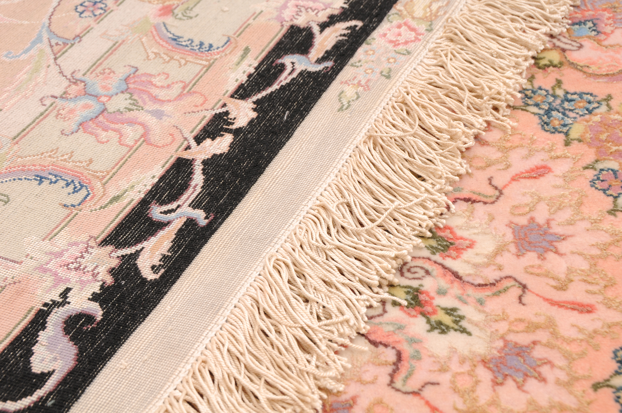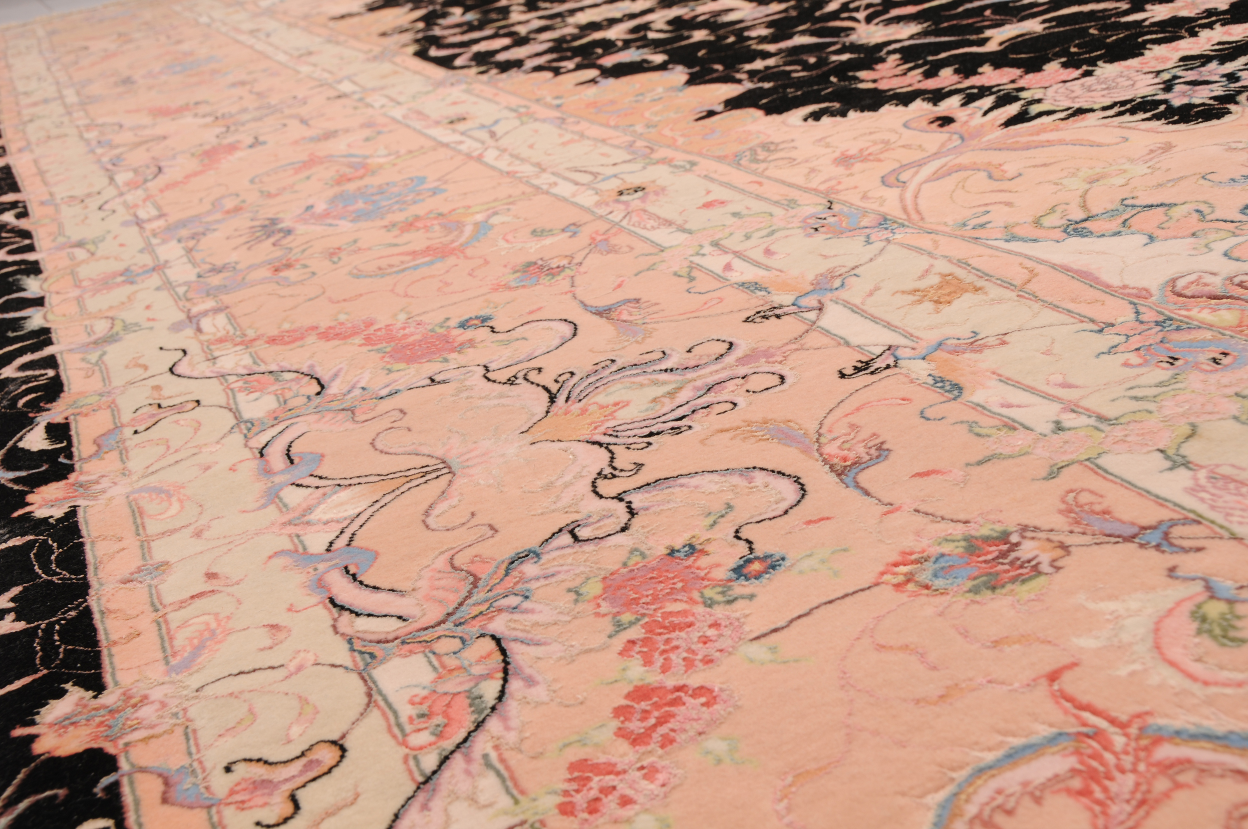 This 9’7″ x 13’3″ Tabriz rug, hand-knotted in Persian, features a medallion design. It is woven with Approx.484 KPS, showcasing a field in Black and a Pink border. The rug has a Medium Pile and a Silk & Wool pile, and is in excellent condition.
