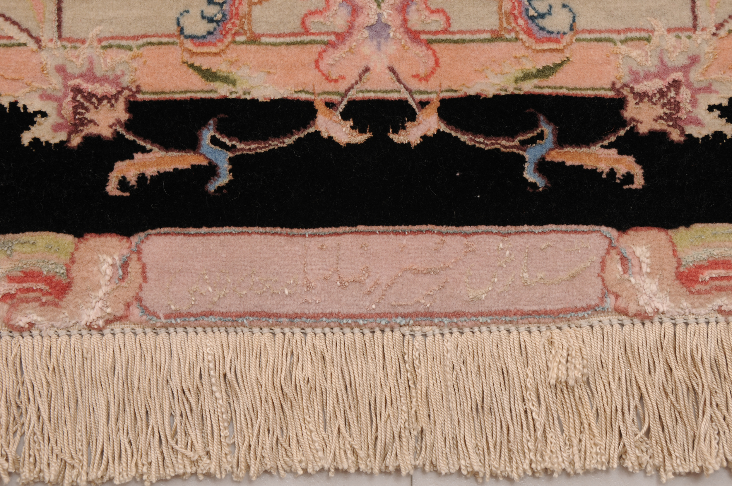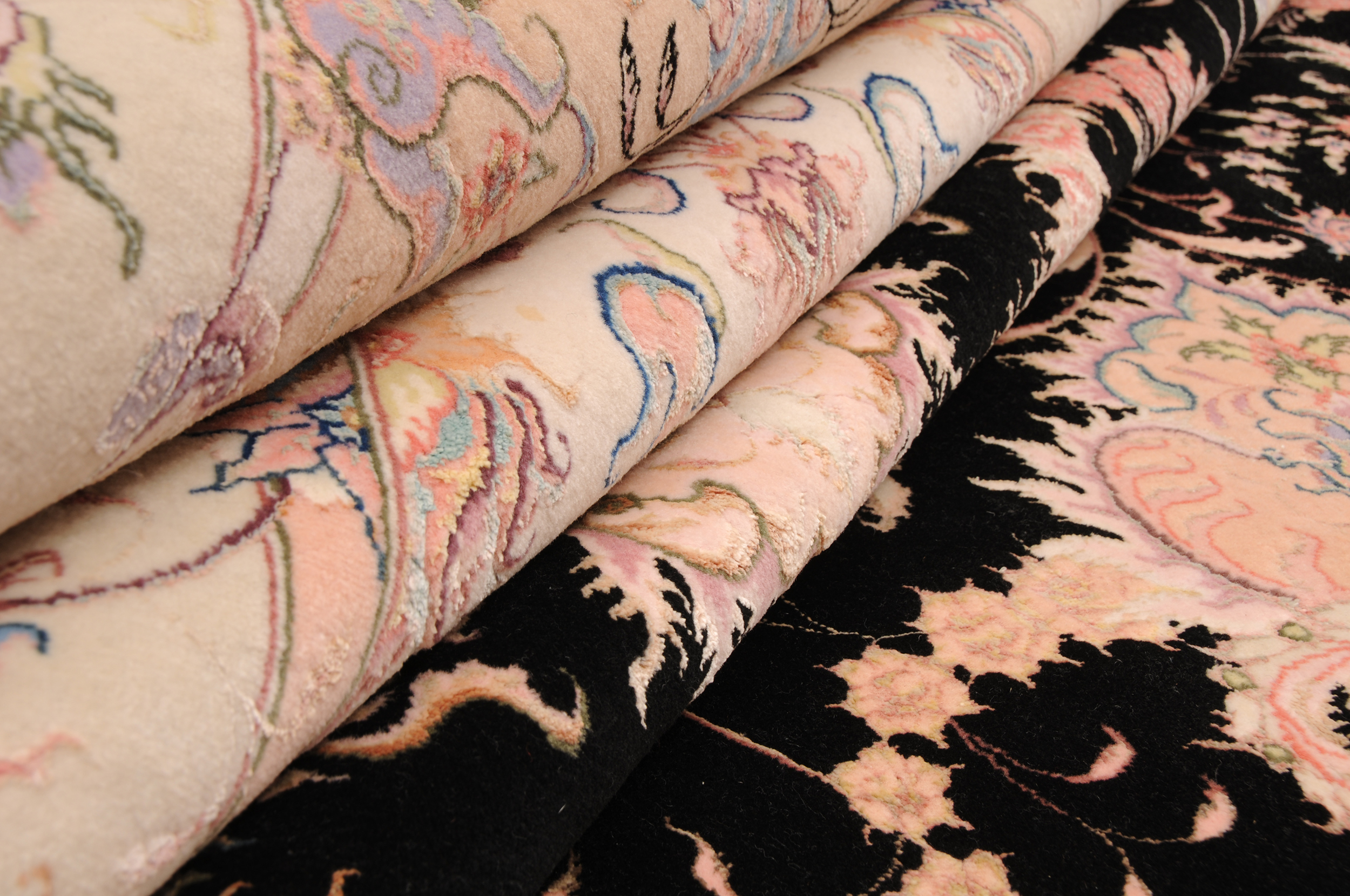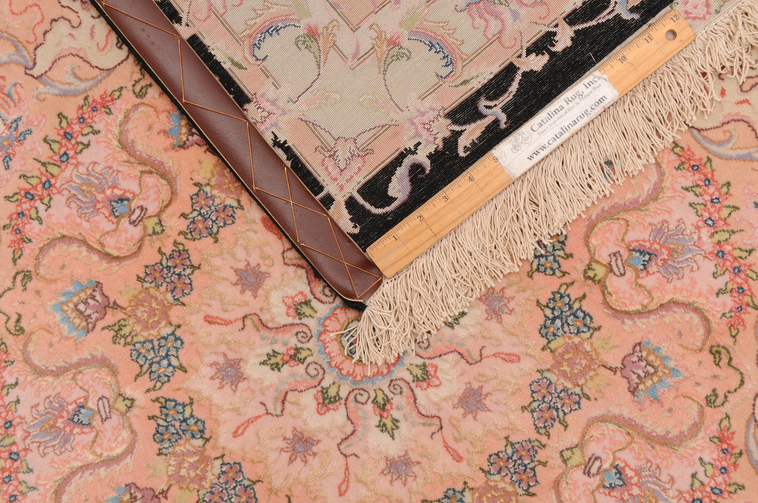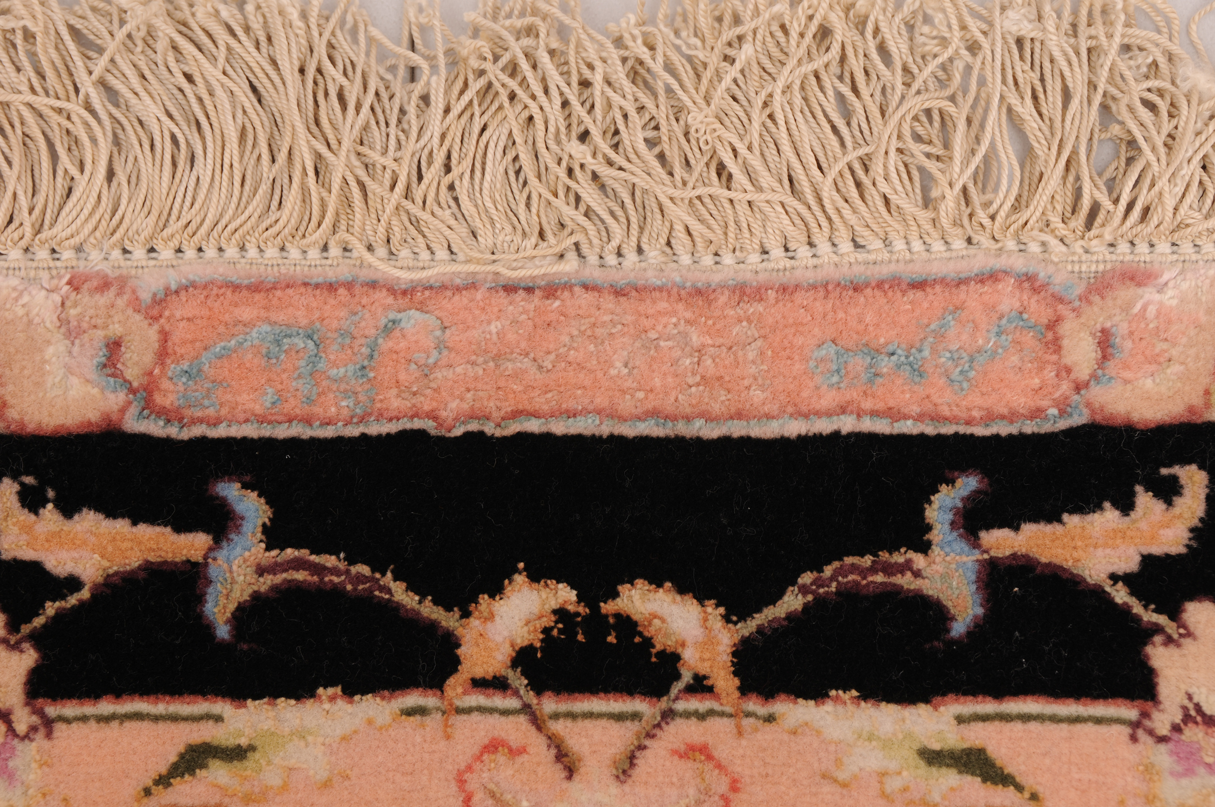 This 9’7″ x 13’3″ Tabriz rug, hand-knotted in Persian, features a medallion design. It is woven with Approx.484 KPS, showcasing a field in Black and a Pink border. The rug has a Medium Pile and a Silk & Wool pile, and is in excellent condition.