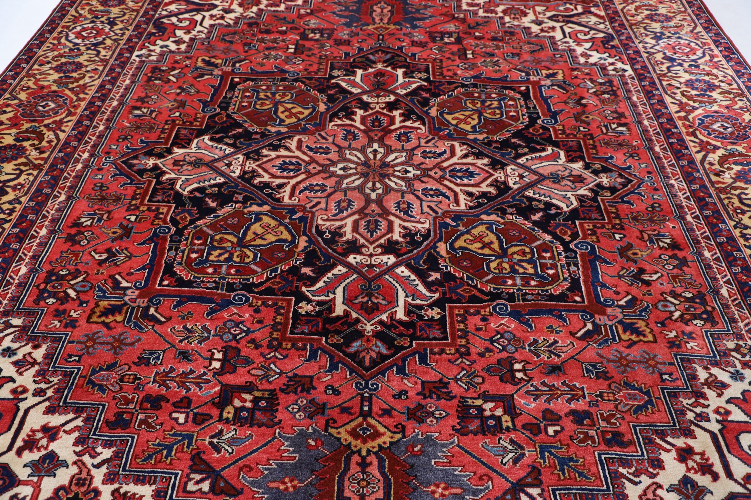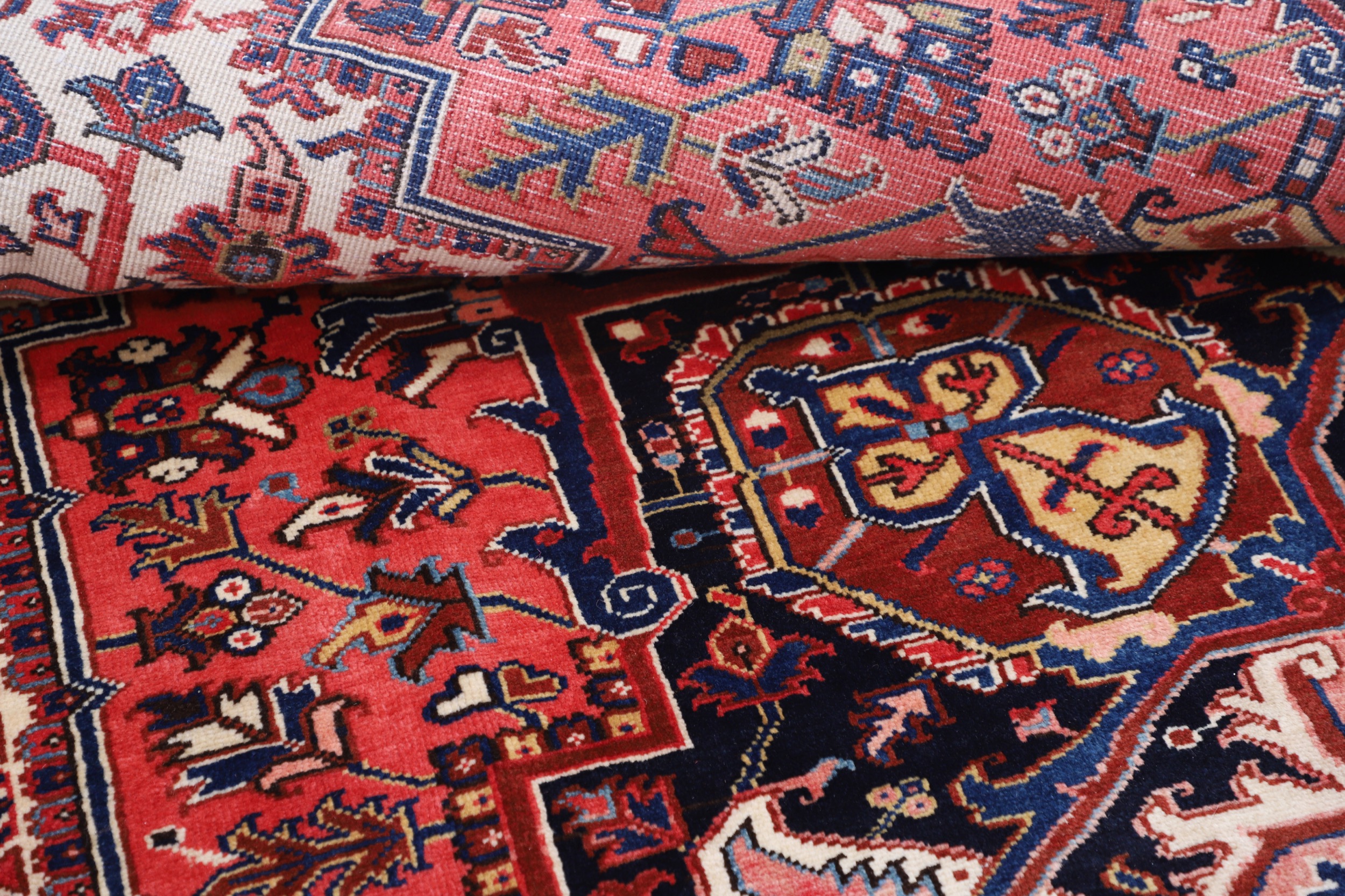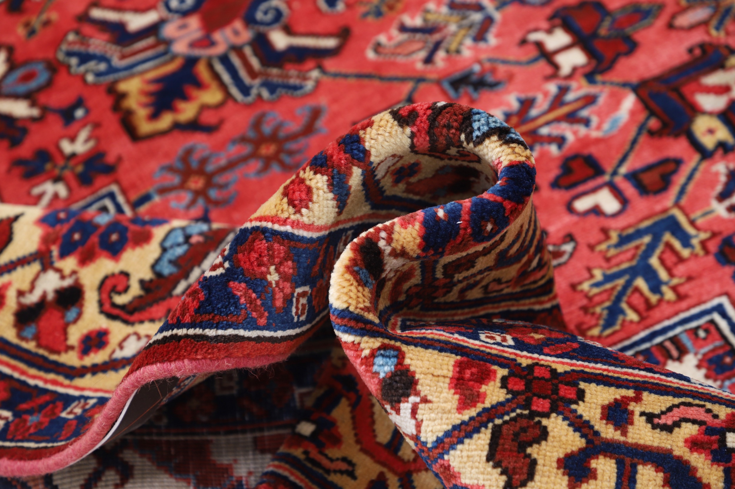 Handcrafted with precision and artistry, this Persian rug showcases the timeless beauty of a Hand Knotted Heriz design. Measuring 9’8″ x 13’2″, this rare piece holds a special charm as it has gracefully aged for 60-70 years, adding a sense of history and character. The stunning combination of blue and yellow geometrical patterns adds a vibrant touch to any space. With approximately 156 knots per square inch, this rug guarantees exceptional quality and durability. Made from 100% wool with a high pile ranging from 1/2″ to 5/8″, this cotton-based masterpiece offers both comfort and style.