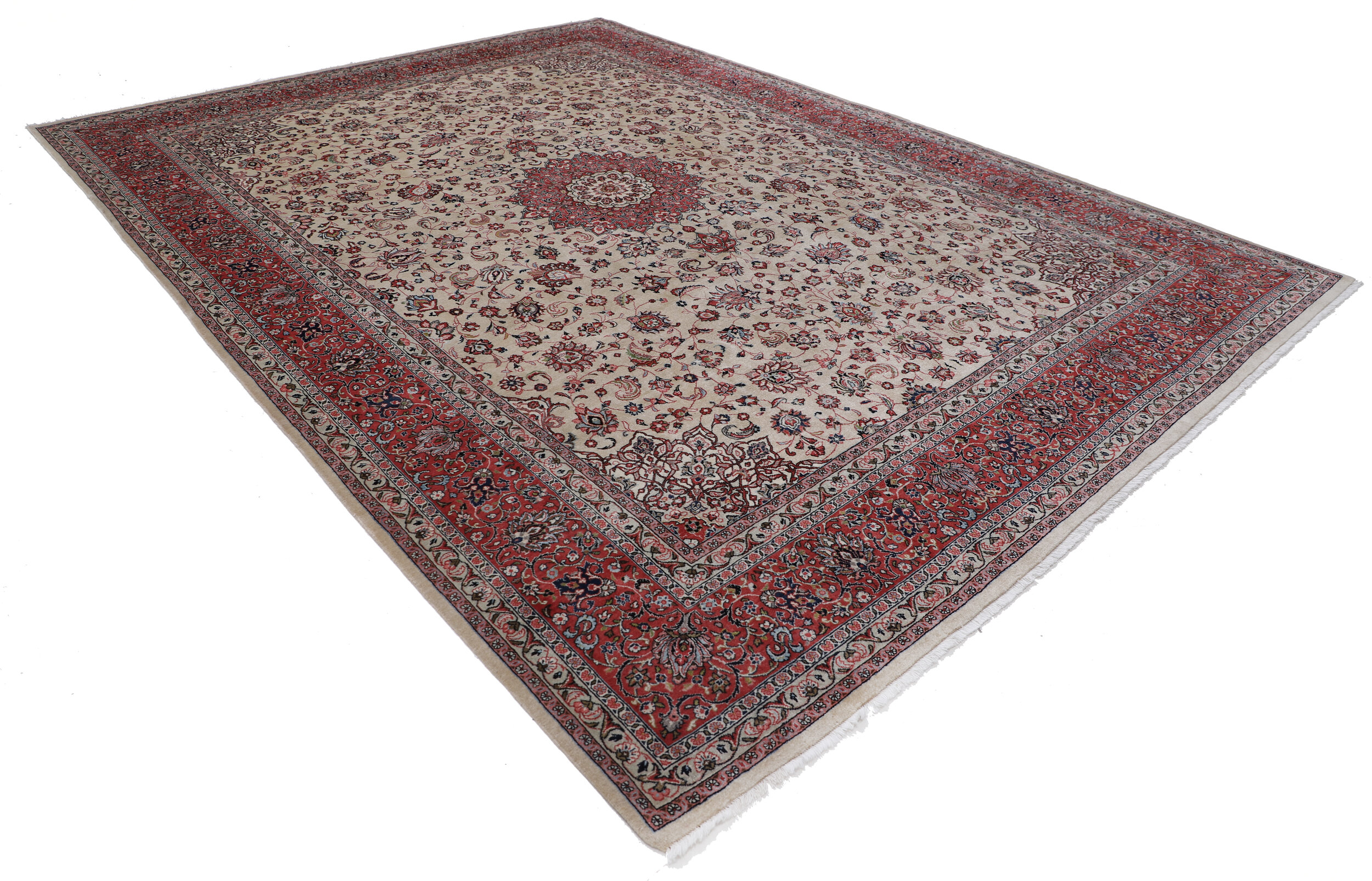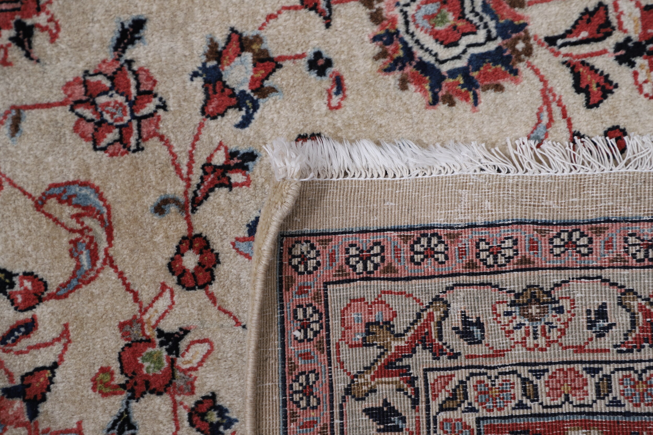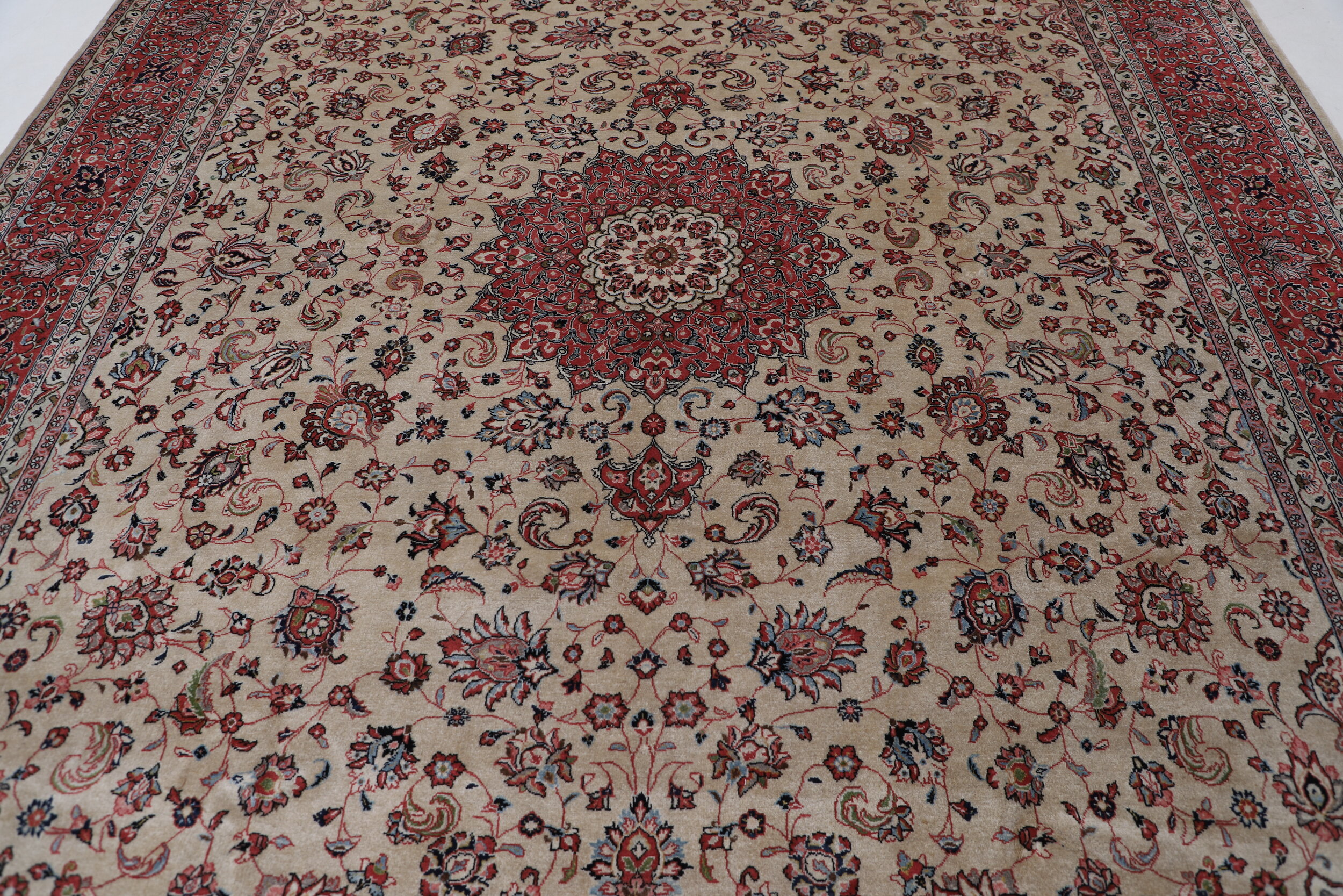 This Persian Rug is hand-knot with 100% Wool Pile and Cotton Foundation. This Rug has a Floral design, and its Main Colors are Beige, Red, Brown, and Peach.