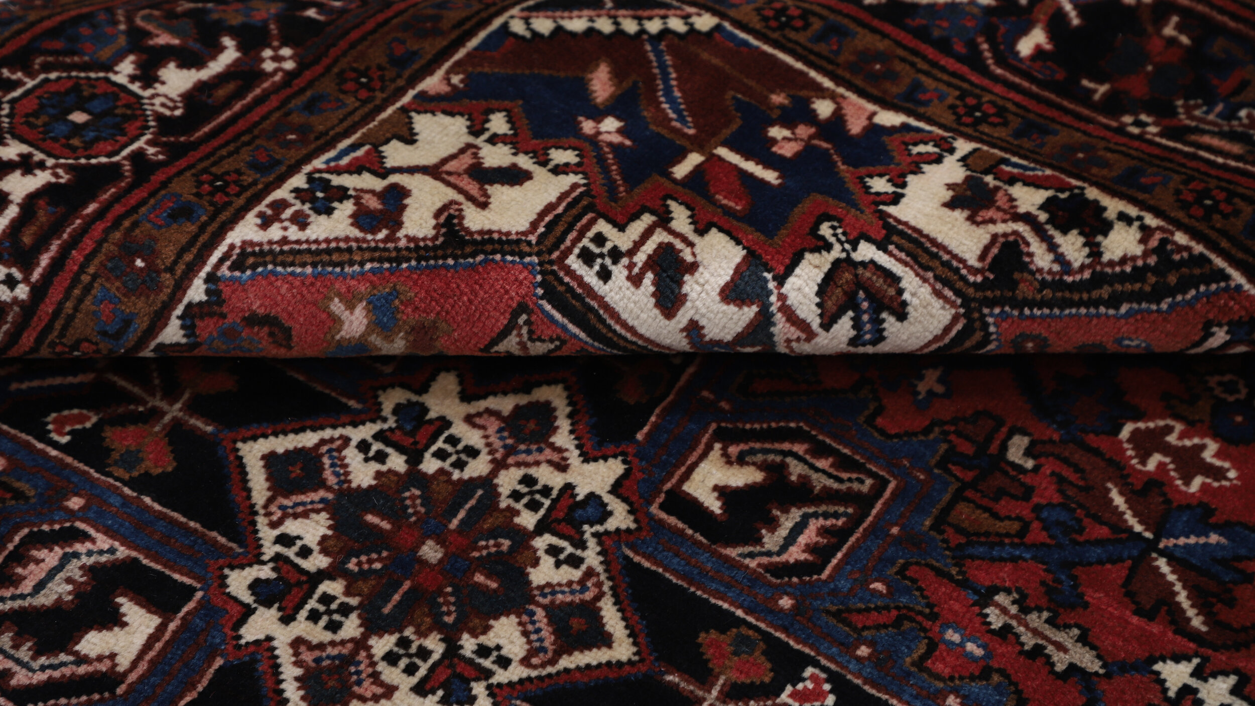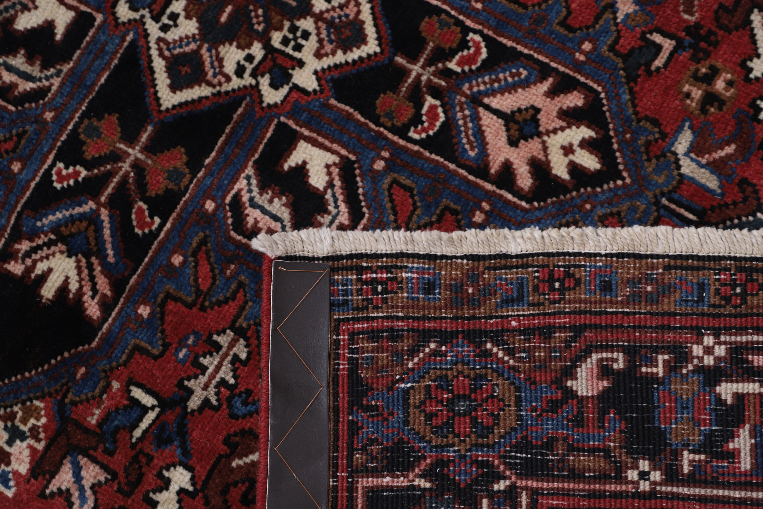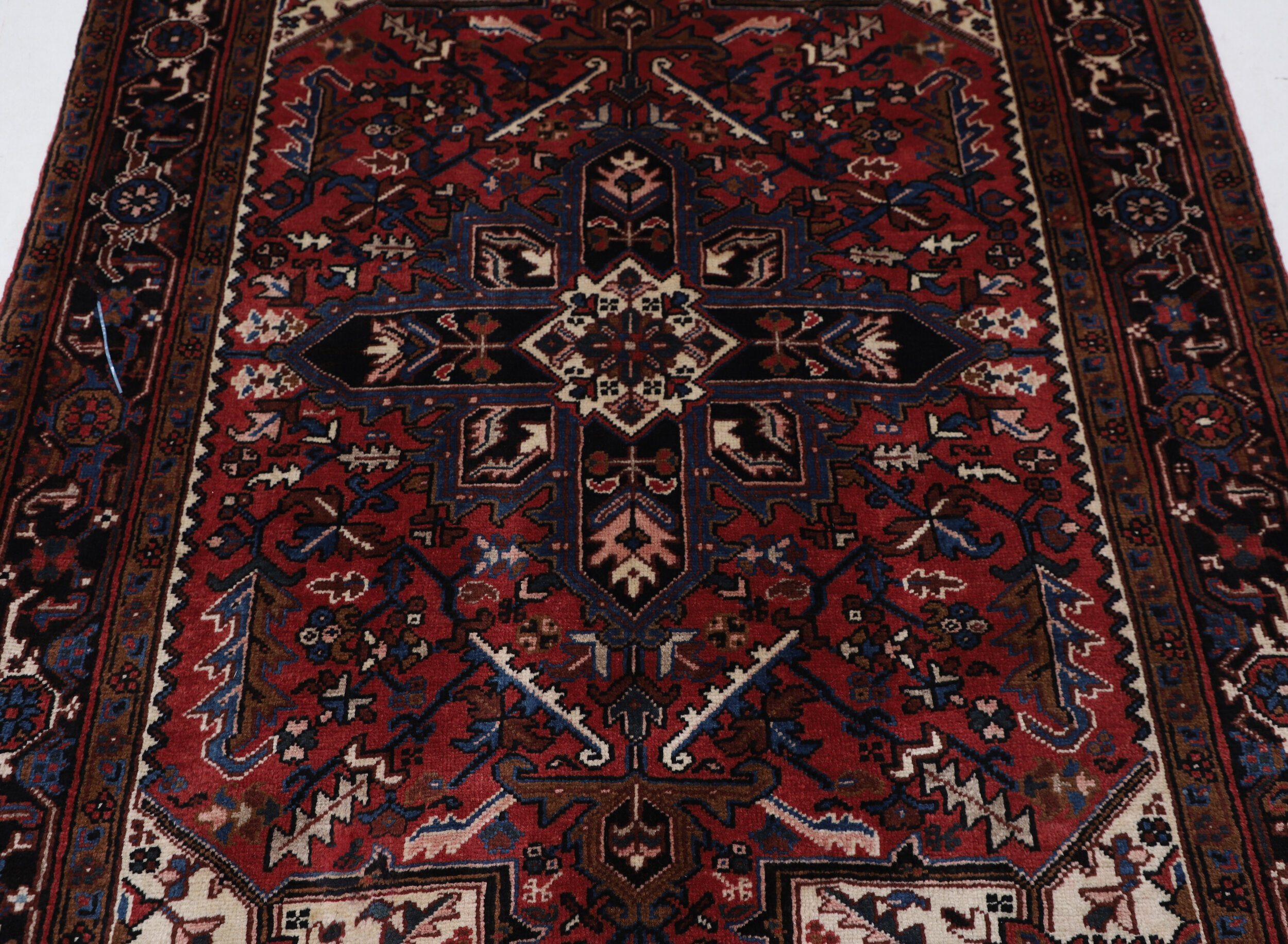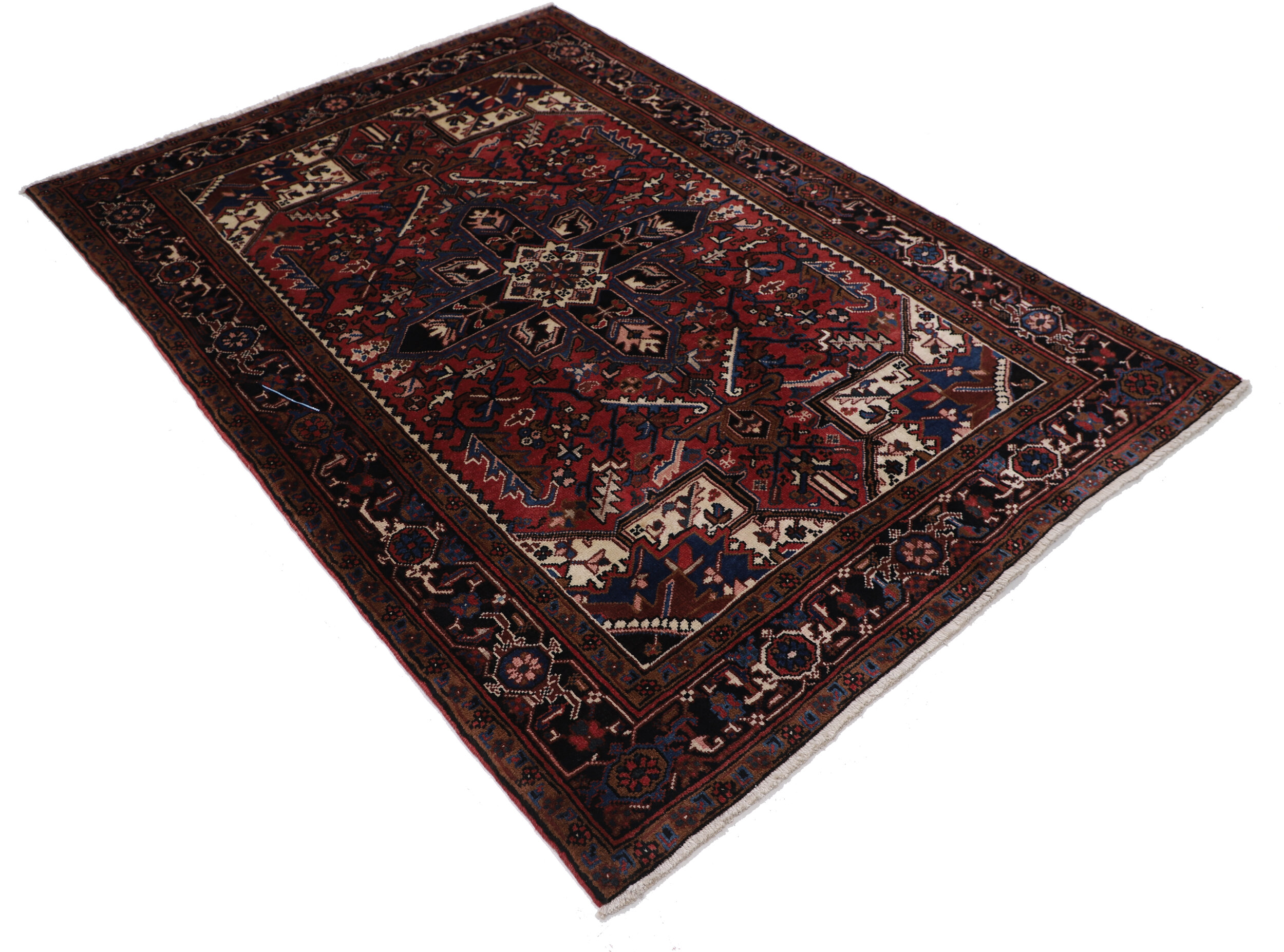 This Persian rug is a stunning addition to any room With its aged rust color and geometric design in beige, and brown, it adds a touch of elegance. Made from 100% wool with a high pile of 1/2″-5/8″ and a knot density of approximately 144 KPSI, it is both luxurious and durable. The dimensions of 4’11” x 6’9″ make it perfect for any space.