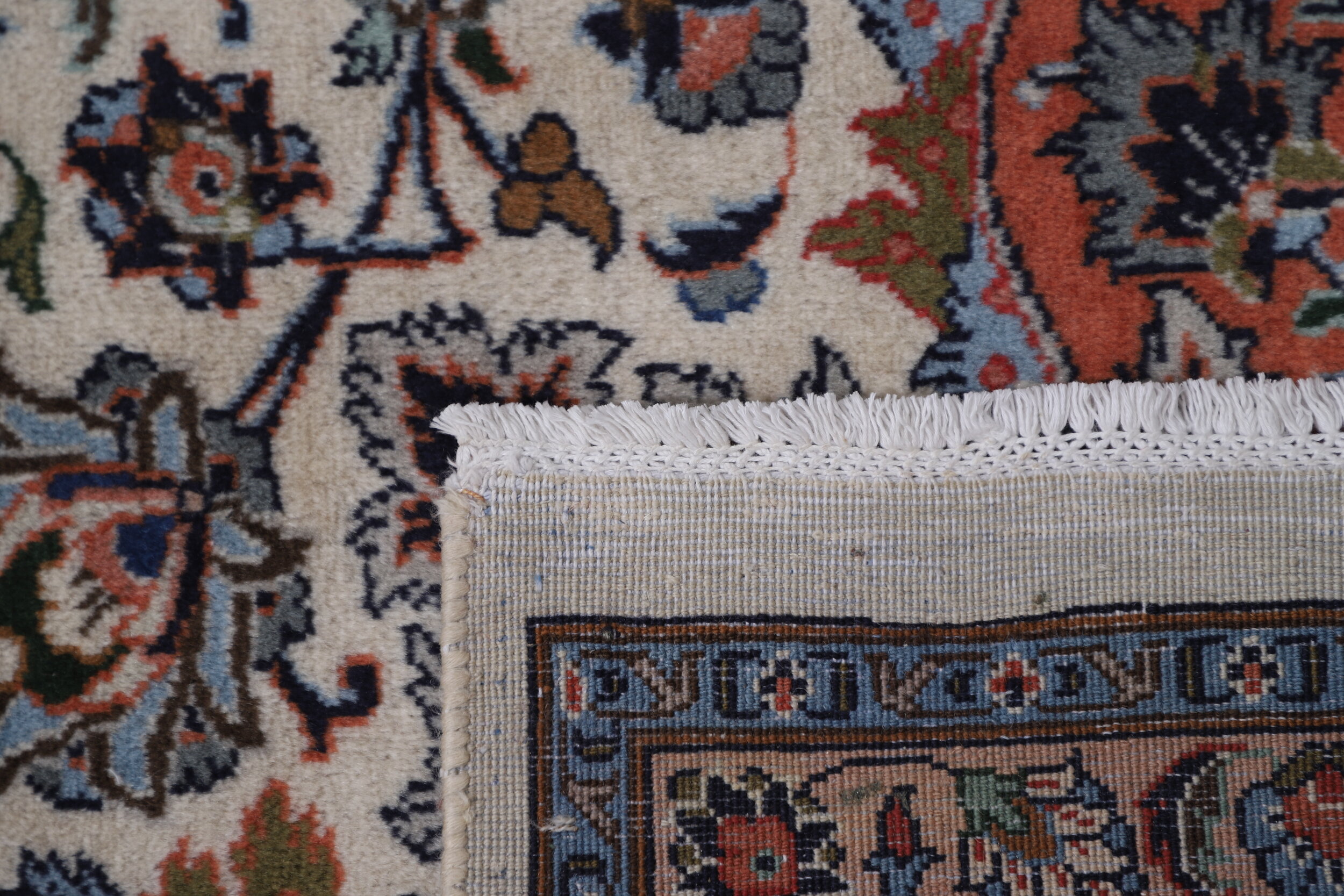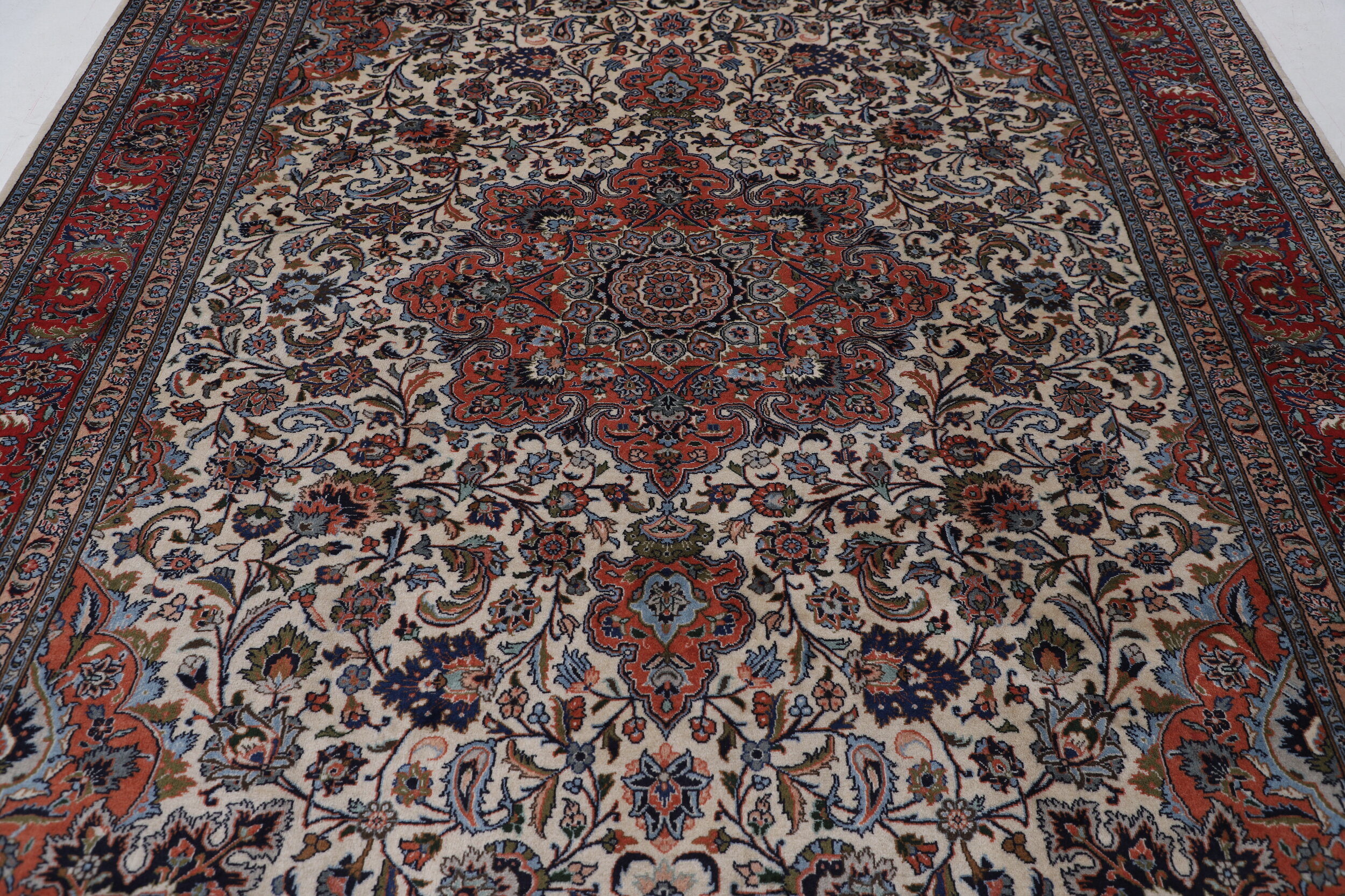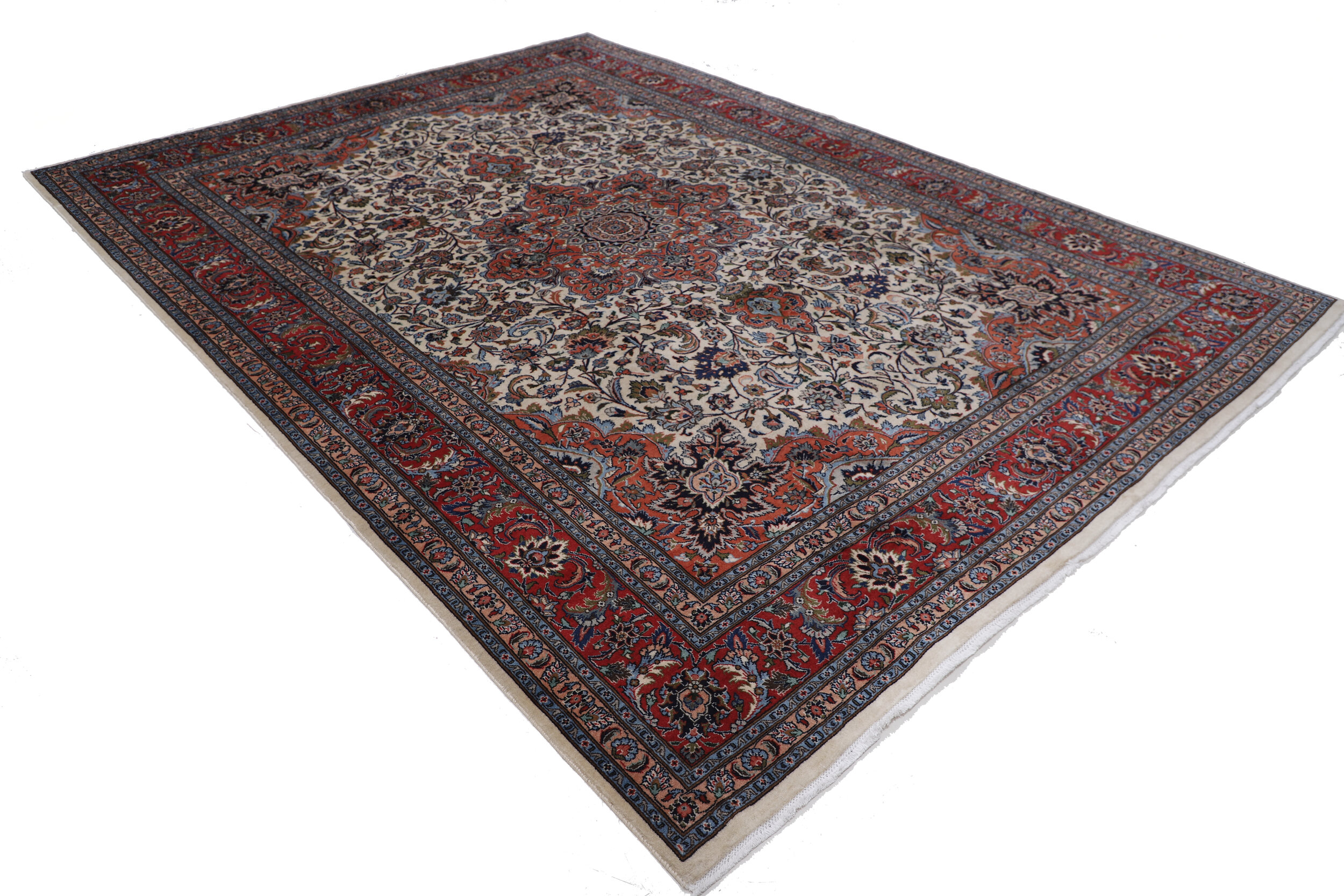 This Persian Rug is hand-knotted with Wool  Pile and Cotton Foundation. This Rug has a Floral Design, and its Main colors are Beige, Blue, and Red.