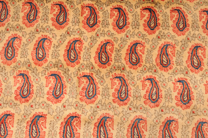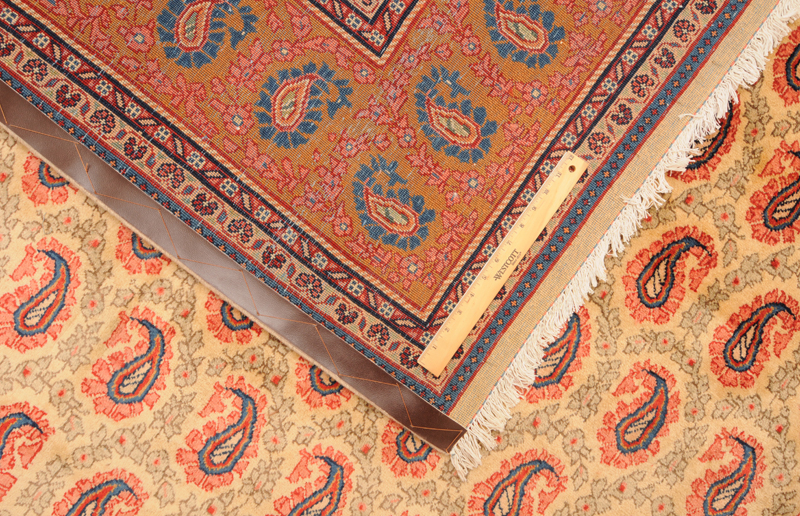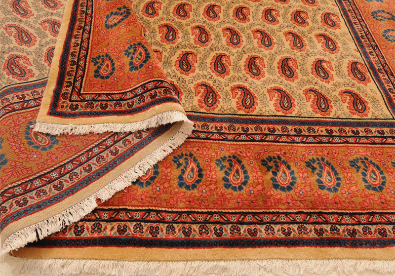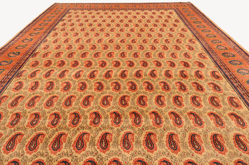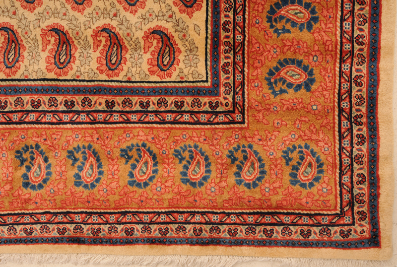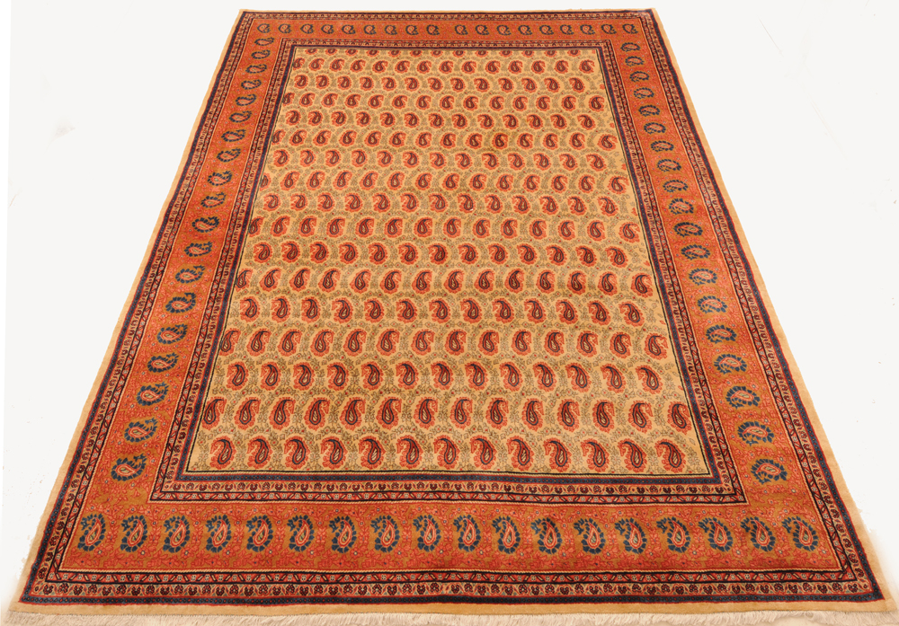 This Persian Rug is Hand Knotted with 100% Wool Pile and Cotton Foundation. This Rug has a Boteh Design and its Main colors are Beige, Orange and Blue.